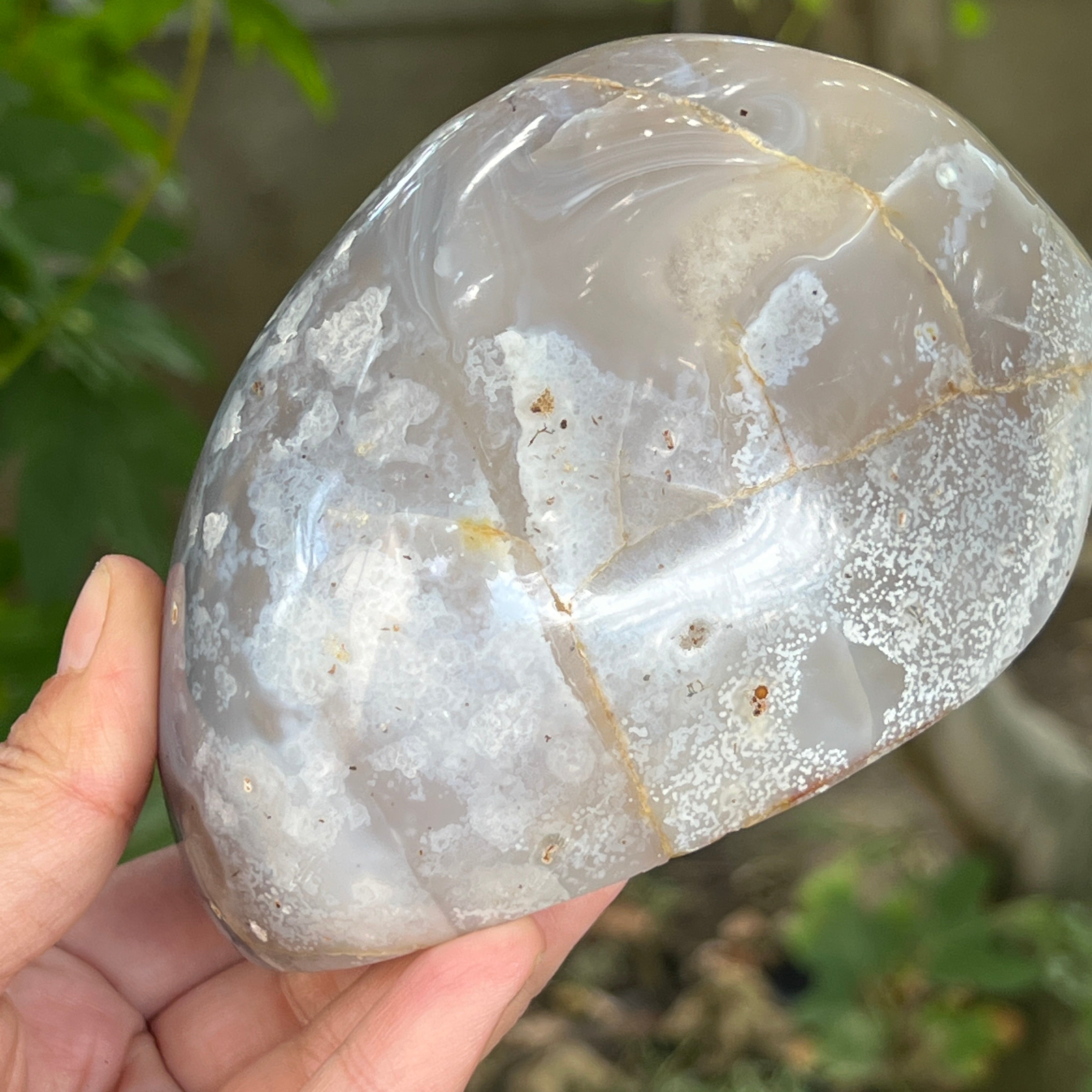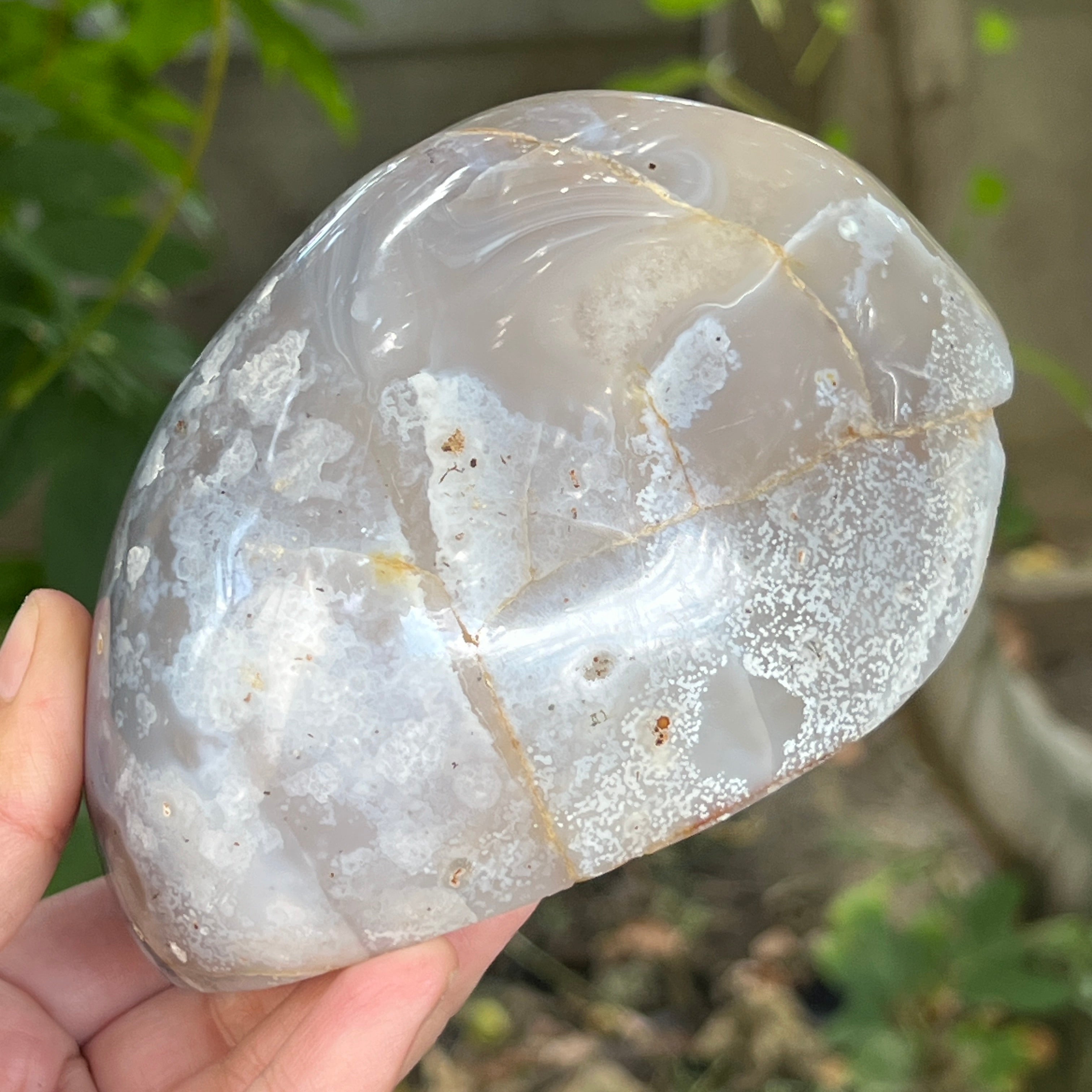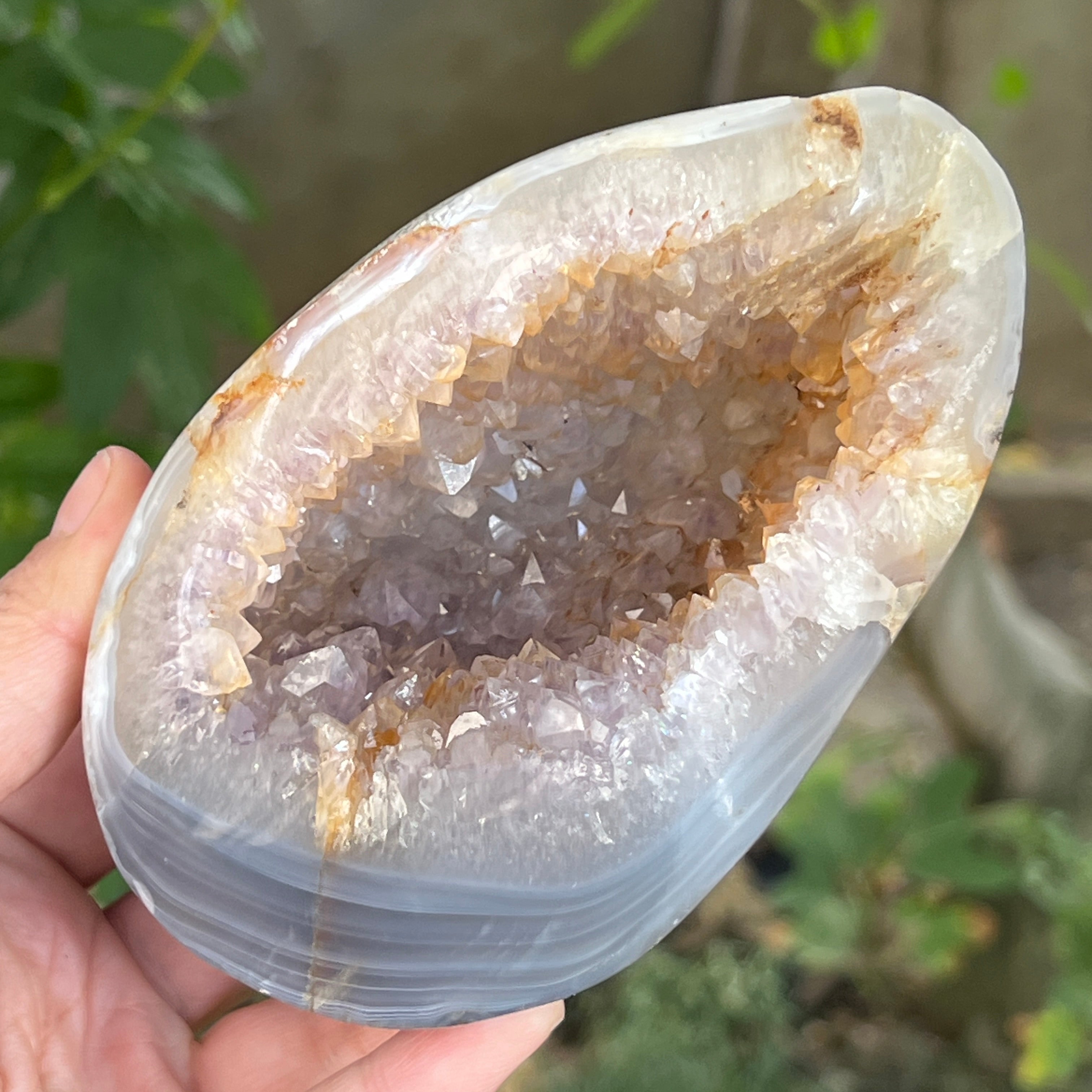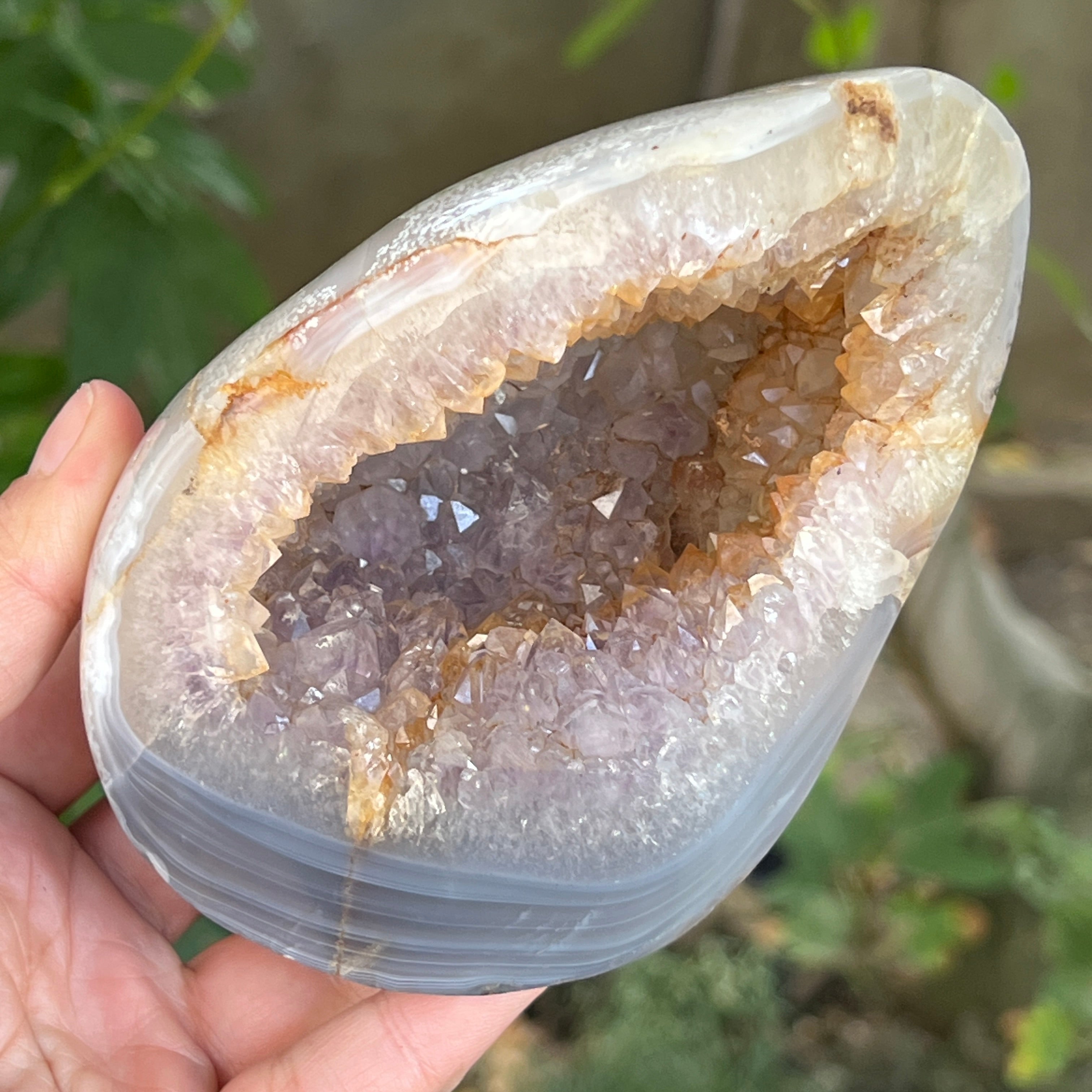 Този грандиозен геод съчетава дълбоката мистерия на аметиста с наслоеното спокойствие на ахата, разкривайки съкровище на природата, изваяно от времето и енергията. Всеки детайл от неговата скрита вътрешност – искрящи аметистови кристали в лилав нюанс – е подсилен от фините, стабилни очертания на ахат, като сърце, защитено от черупка на мъдростта.