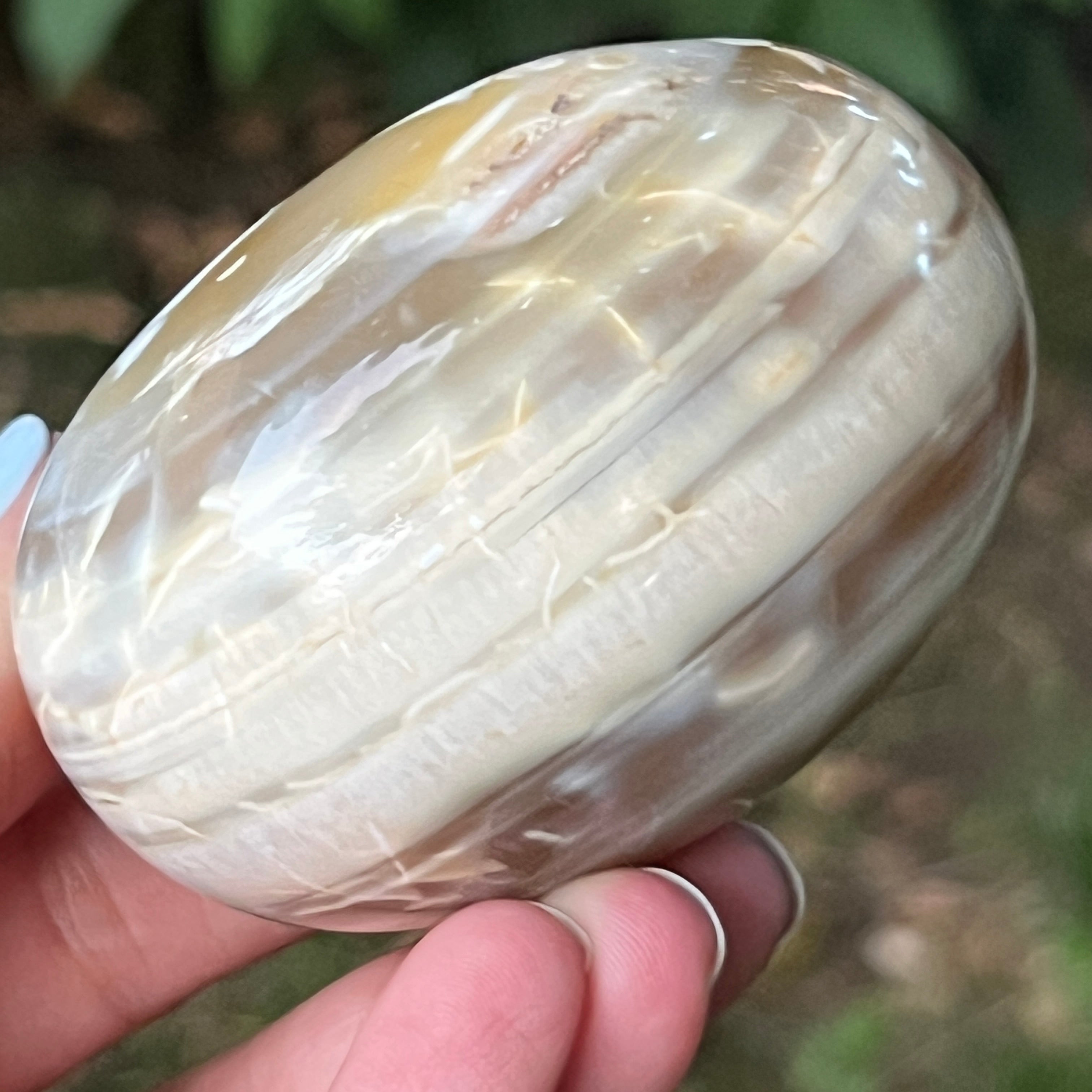 Агатът Орка е рядка и впечатляваща разновидност на агата, криптокристална форма на кварц, принадлежаща към семейството на халцедона. Той се формира чрез последователни натрупвания на силиций в вулканични кухини, като резултатът са фини концентрични ивици с гладък вид и компактна текстура. Характерният му цвят – комбинации от сиво-синьо, черно и бяло – внушава елегантността и контраста на кита Орка, откъдето идва и името на камъка. В зависимост от минералните включвания, Агатът Орка може да съдържа и нюанси на червеникаво, жълто, ръждиво или кафявочесто под формата на фини акценти, които придават уникалност на всеки екземпляр.