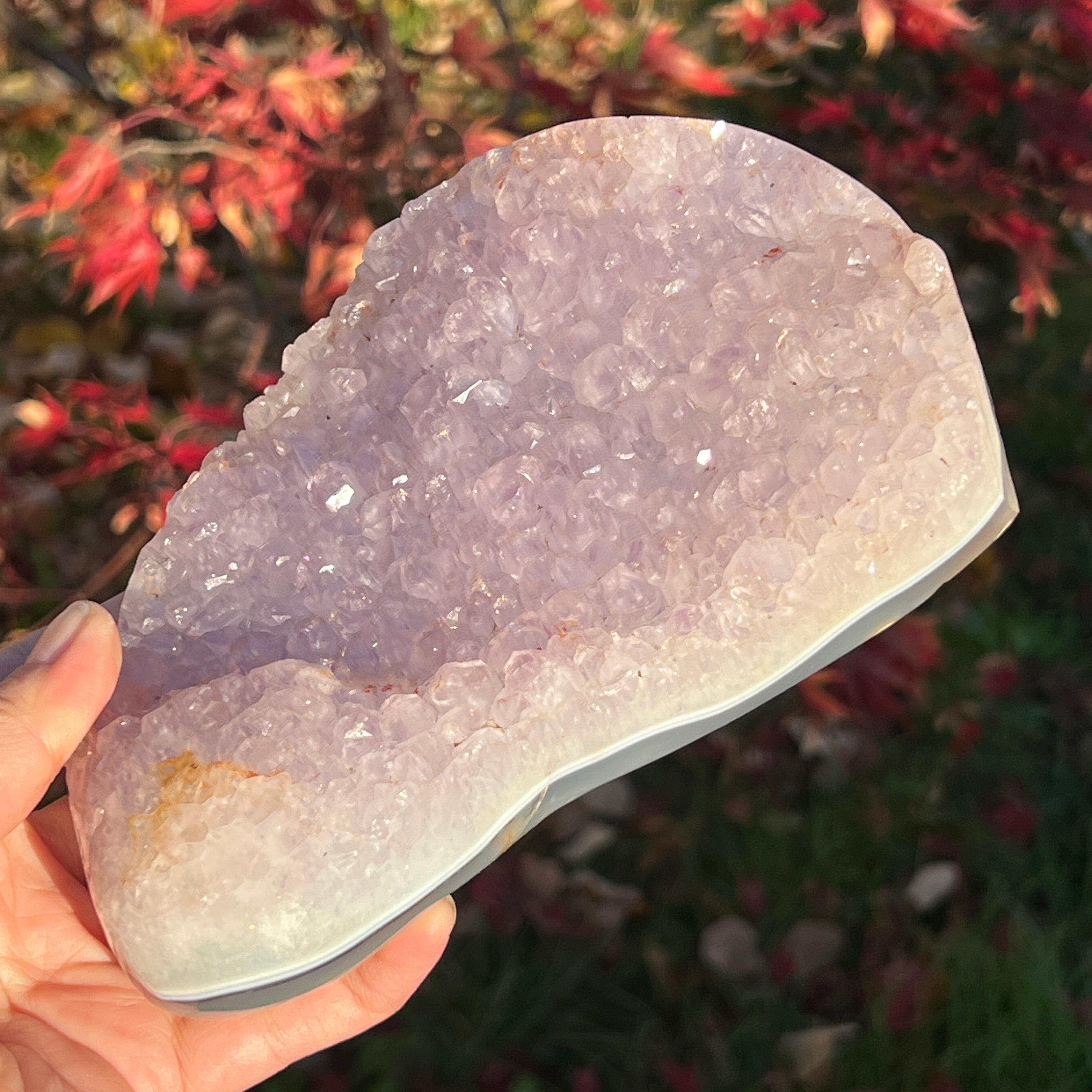 Виолетовите кристали са се родили директно върху агатовата основа, формирайки отворена, сияеща структура, която изглежда като да е разцъфнала в камъка.