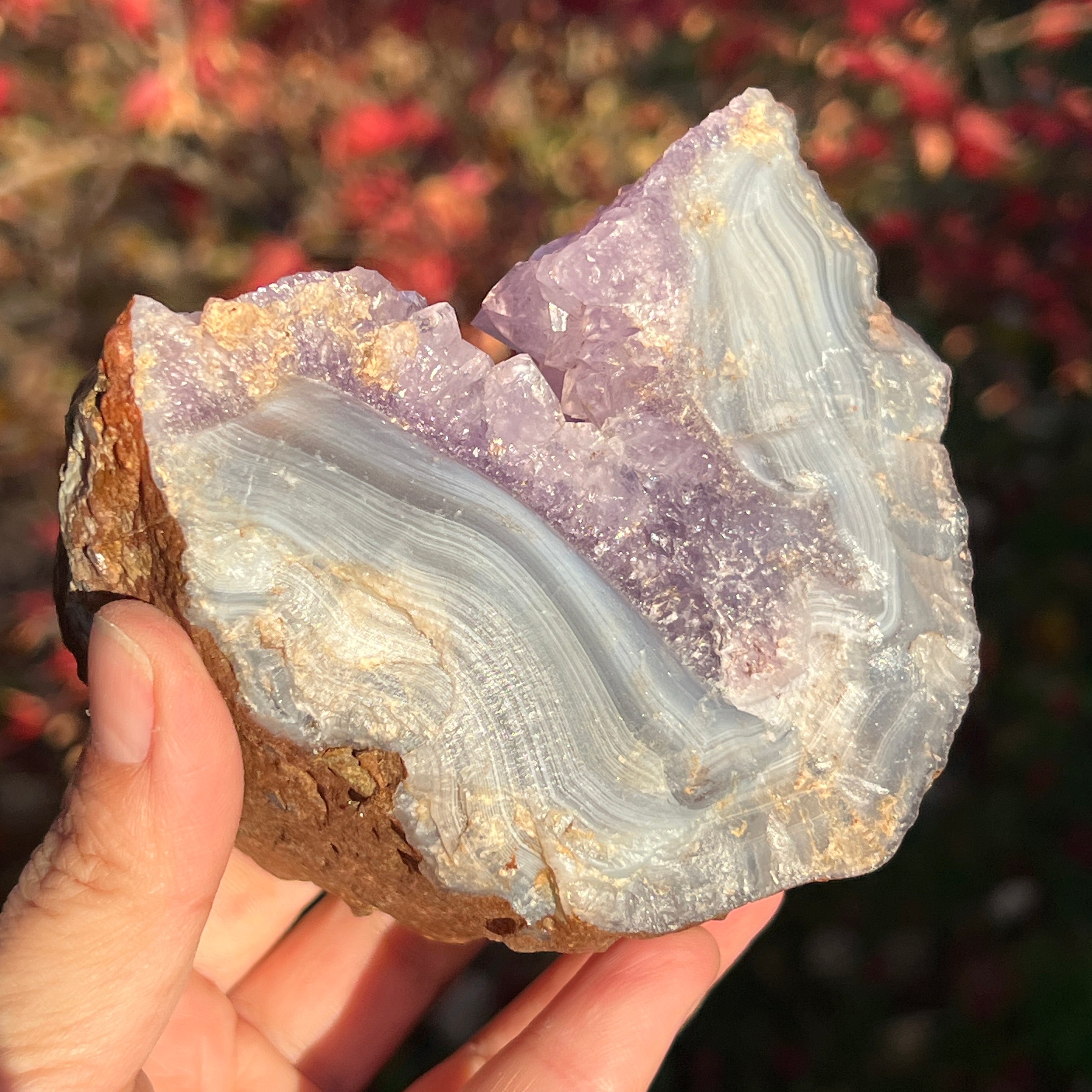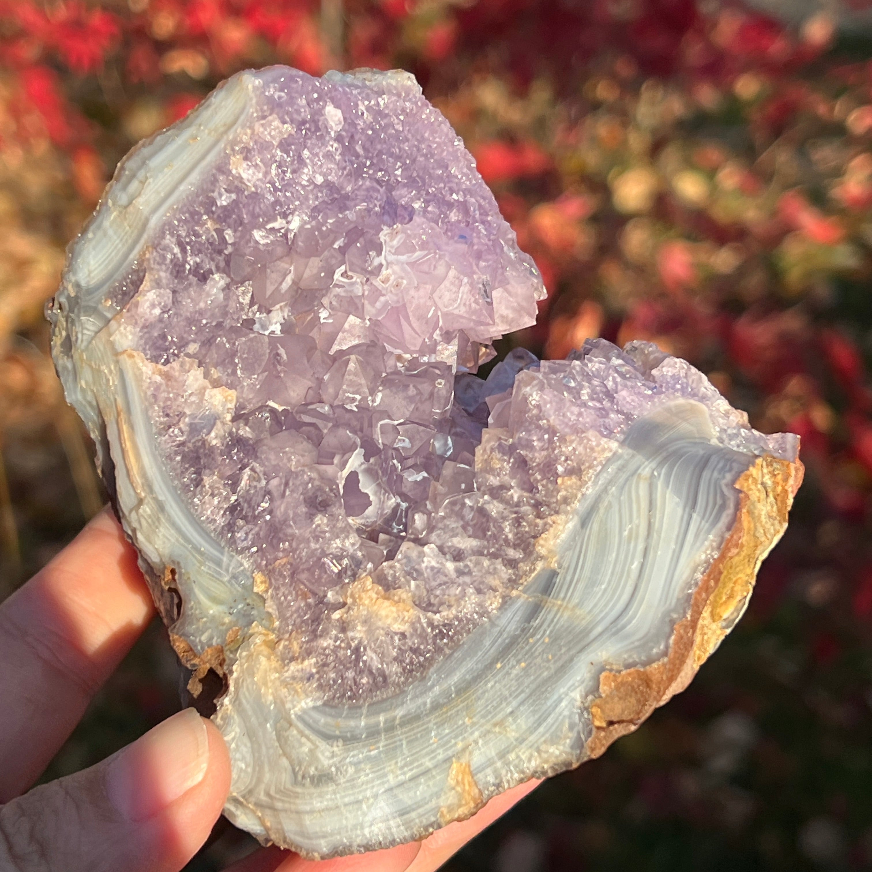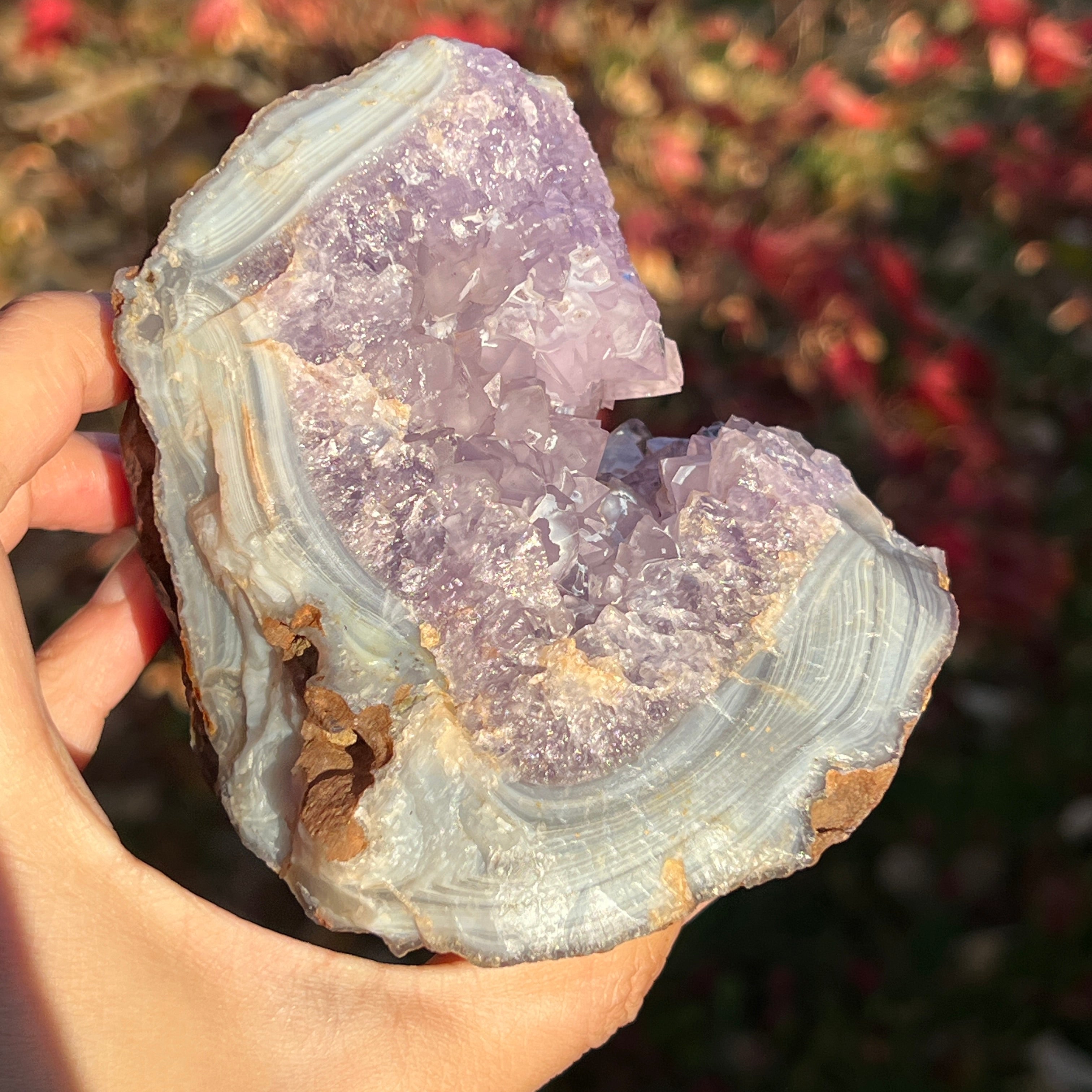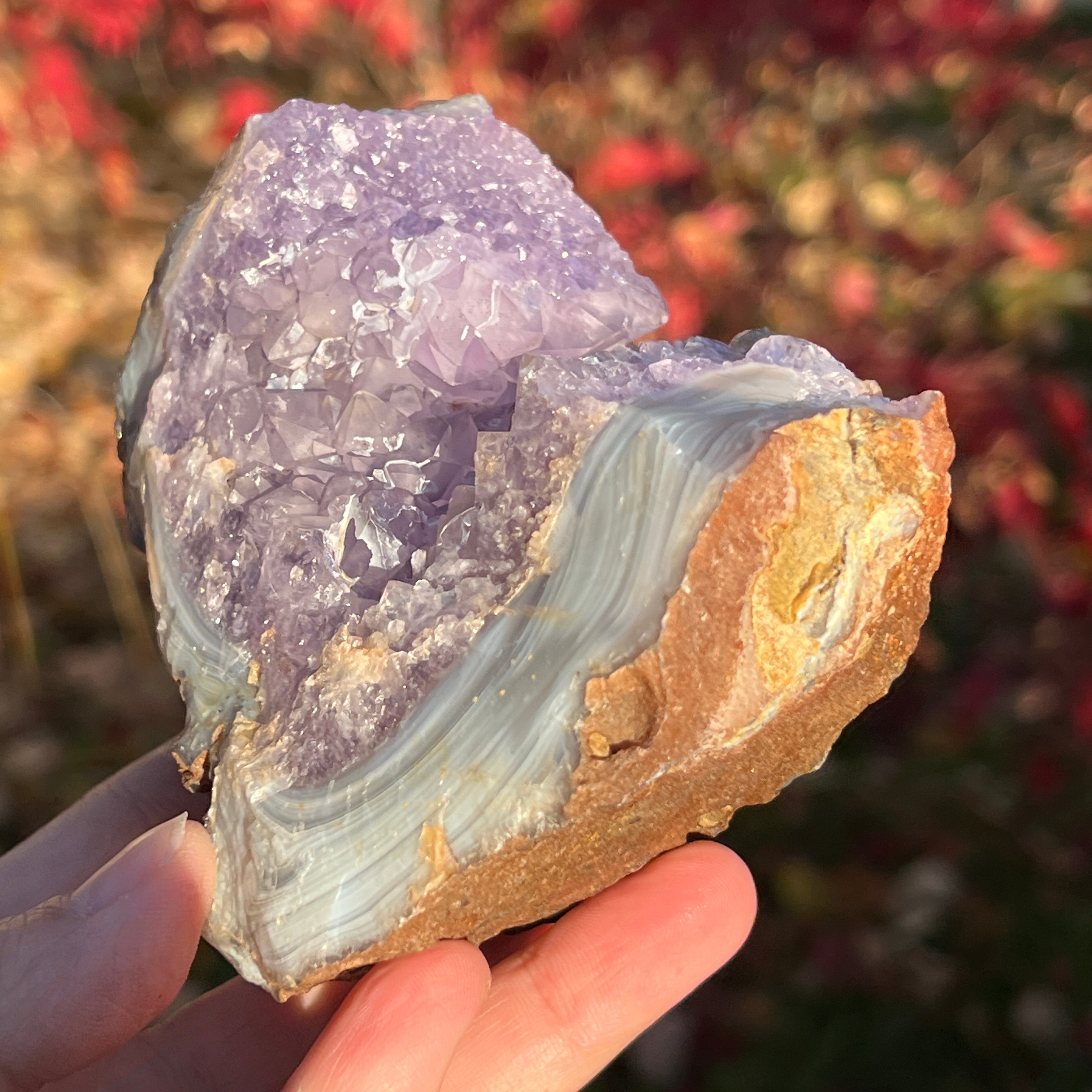 Виолетовите кристали са се родили директно върху агатната основа, създавайки отворена, сияйна структура, която сякаш е разцъфнала в камъка.