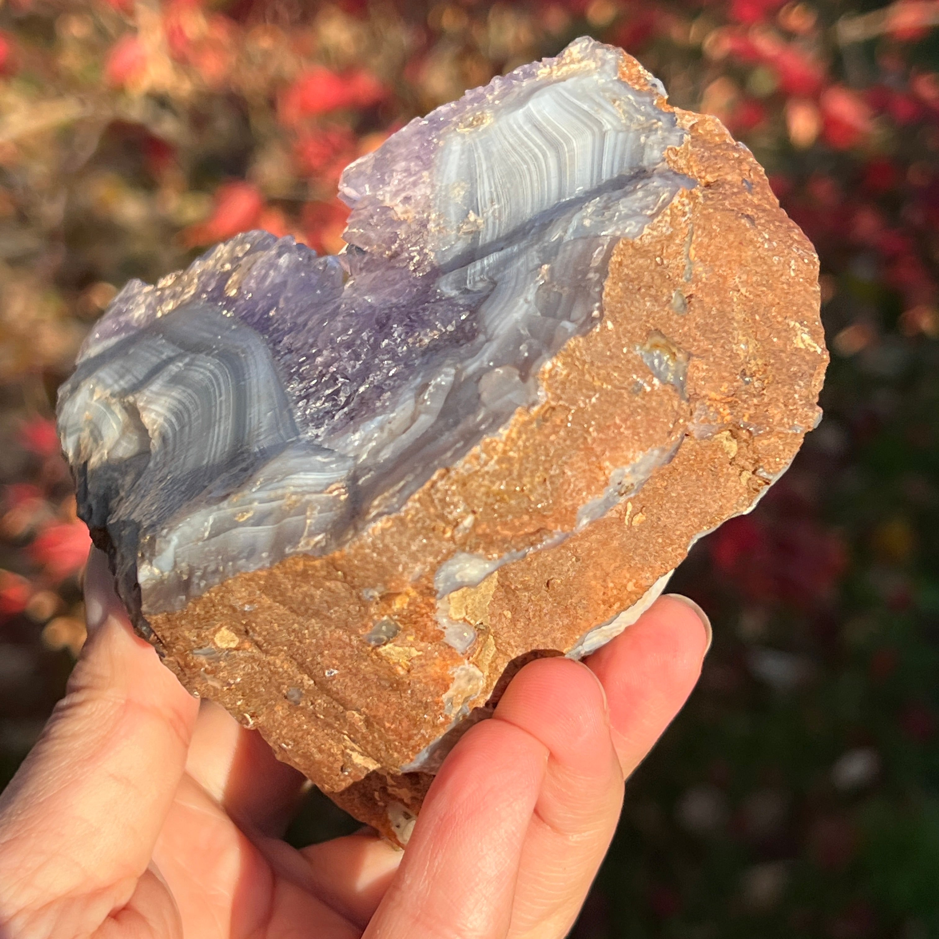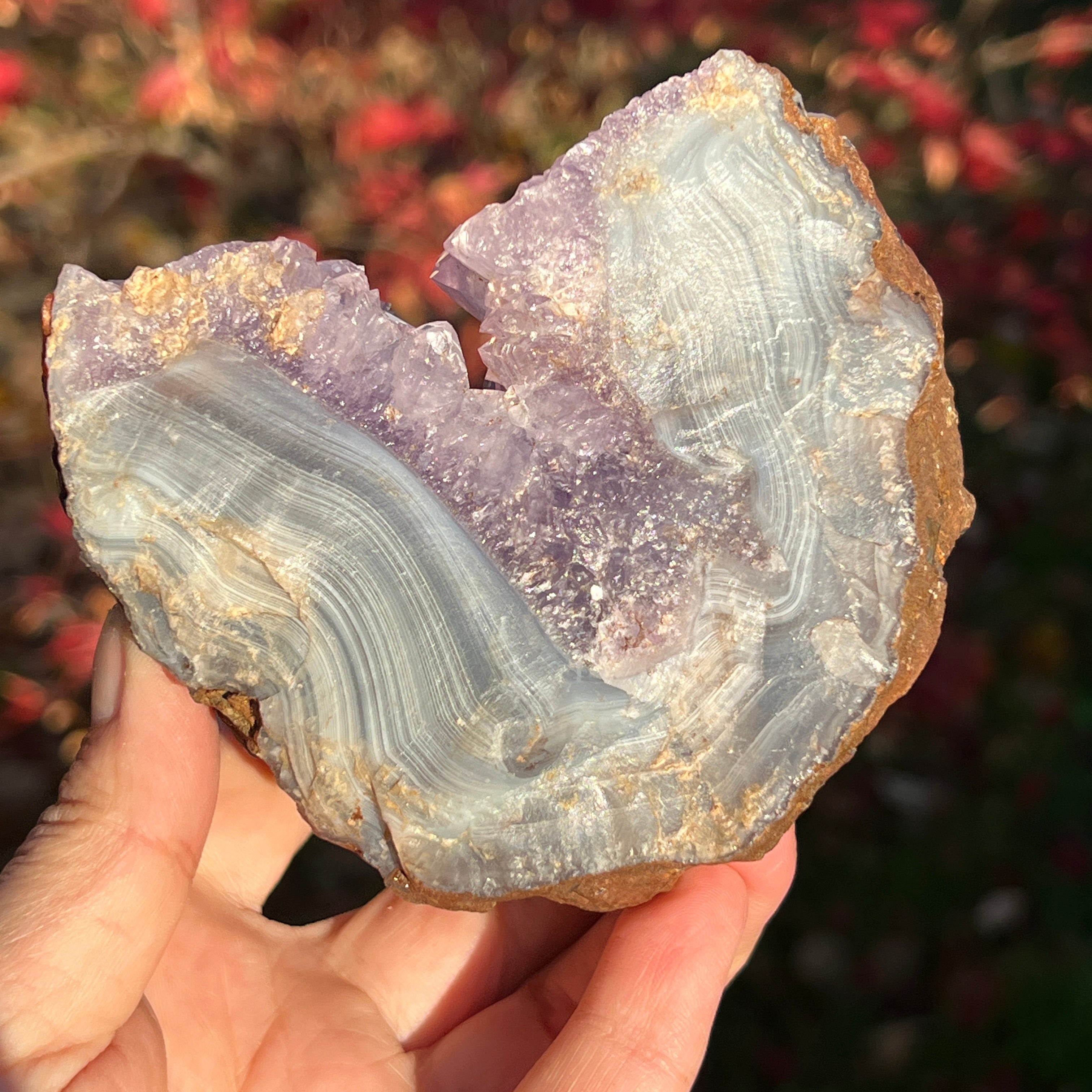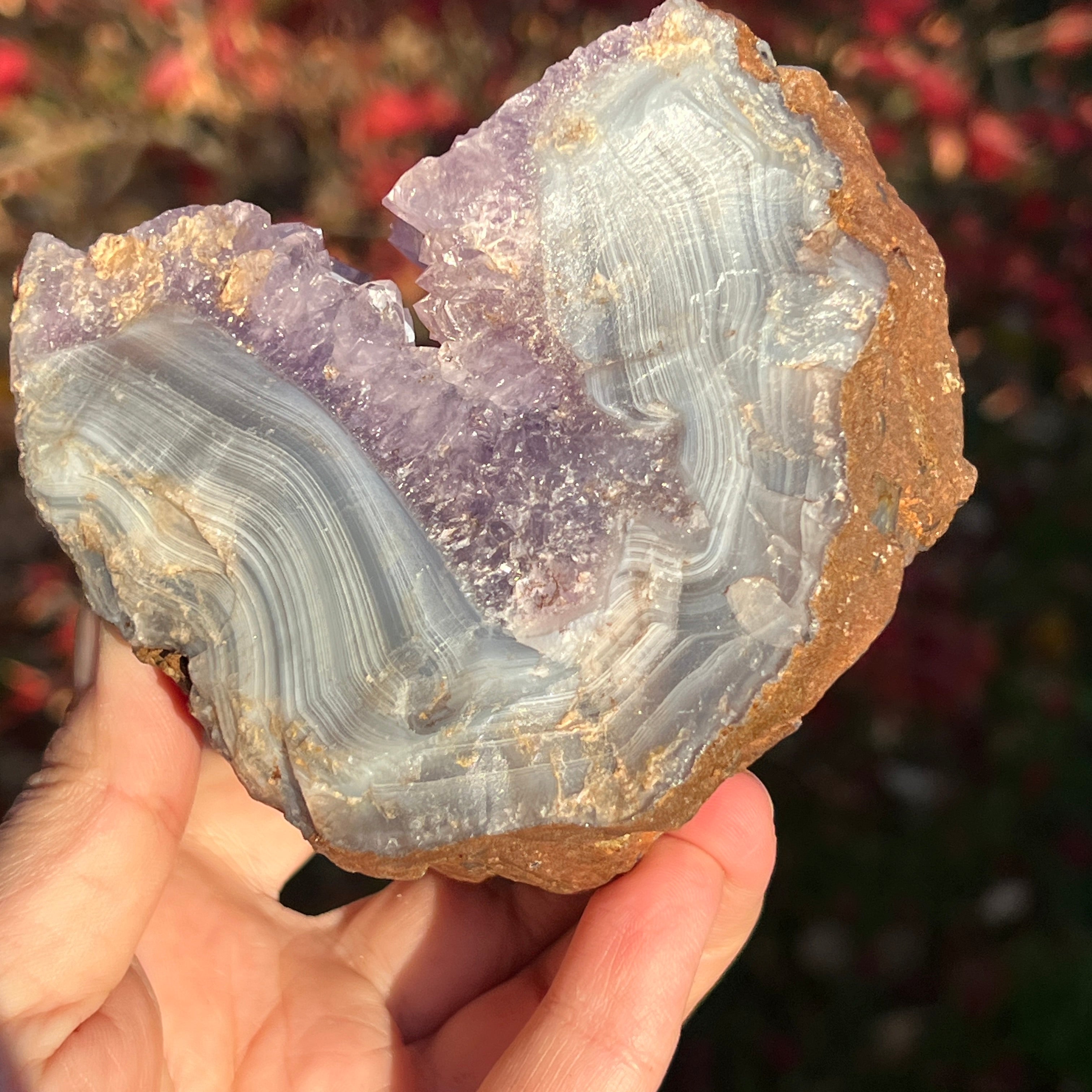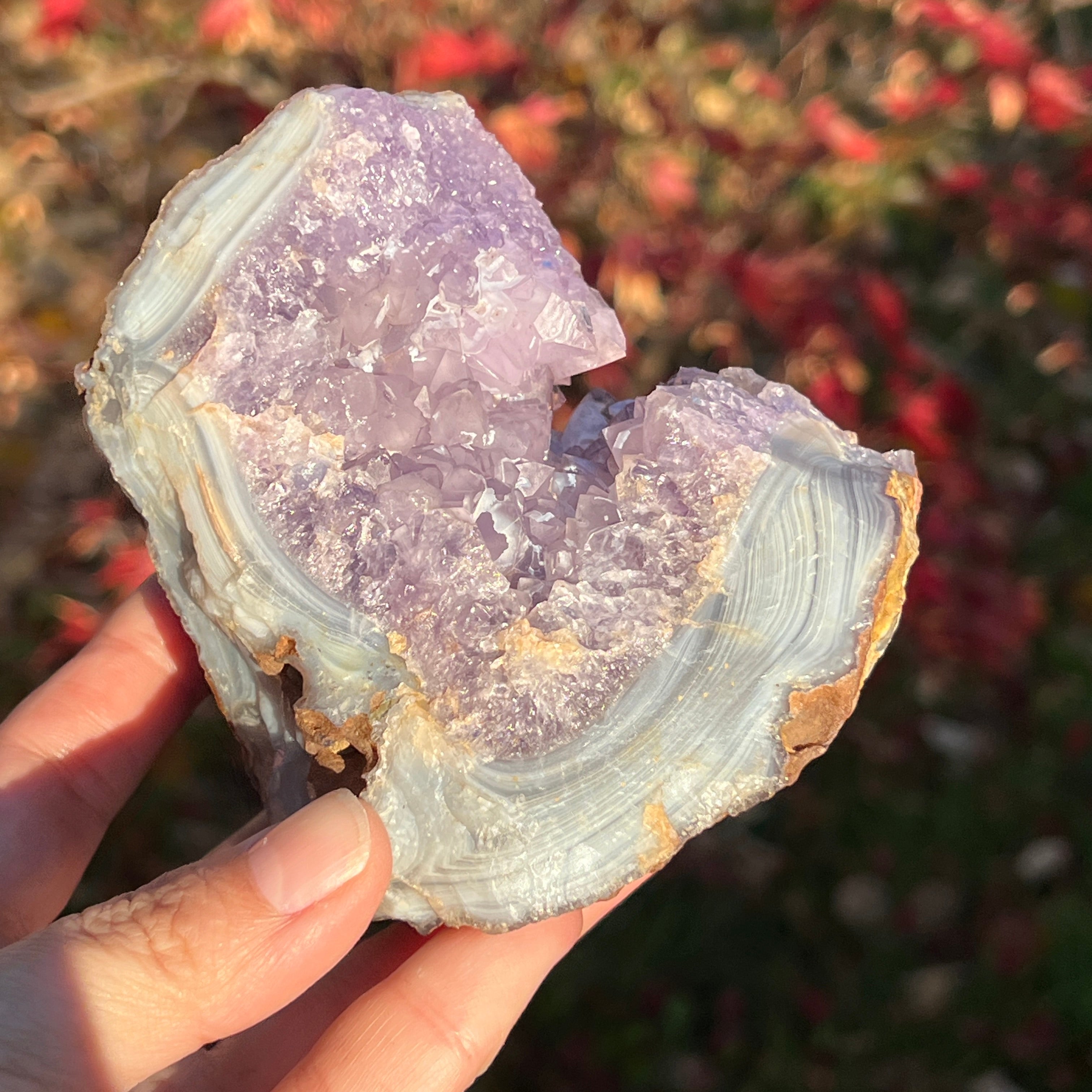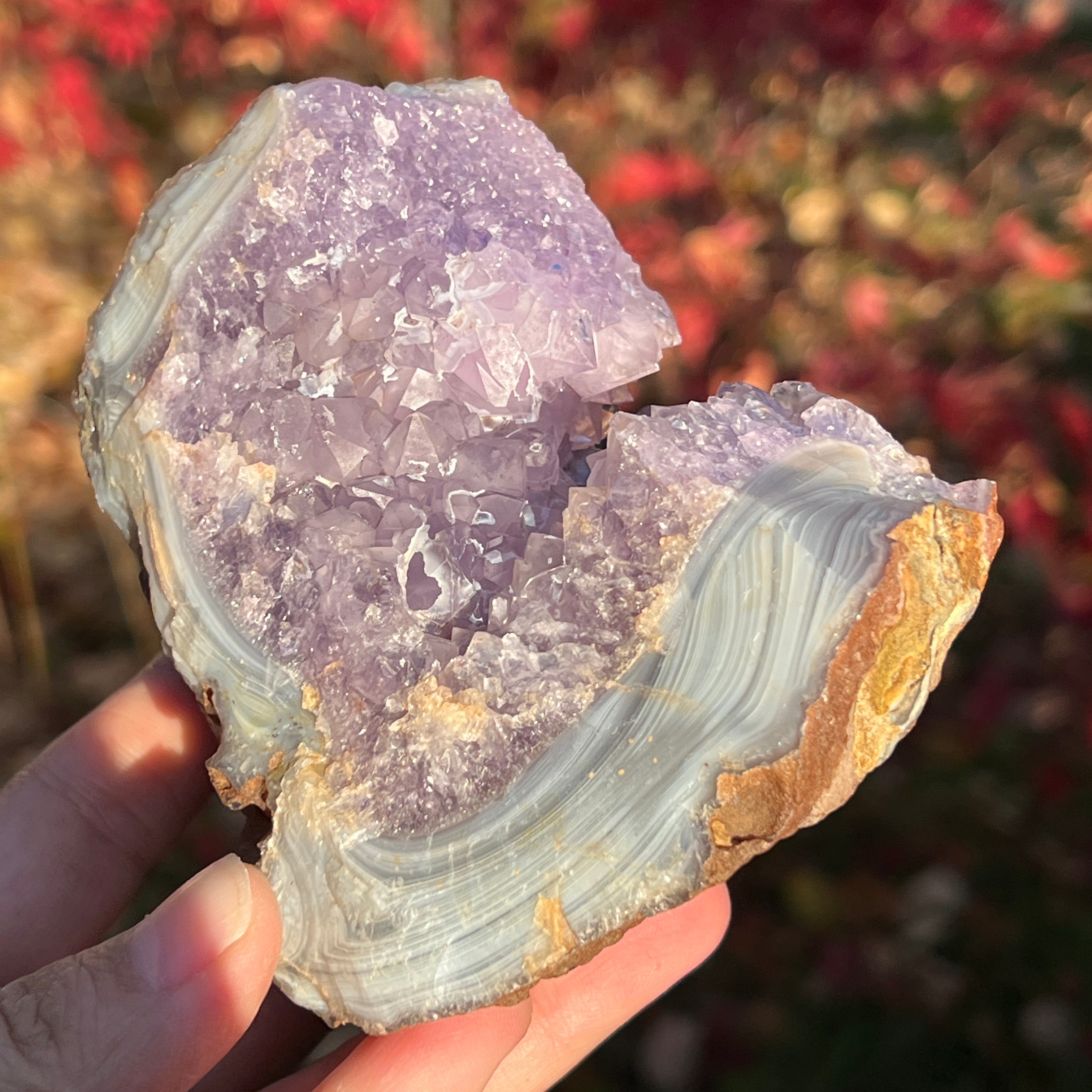 Виолетовите кристали са се родили директно върху агатната основа, създавайки отворена, сияйна структура, която сякаш е разцъфнала в камъка.