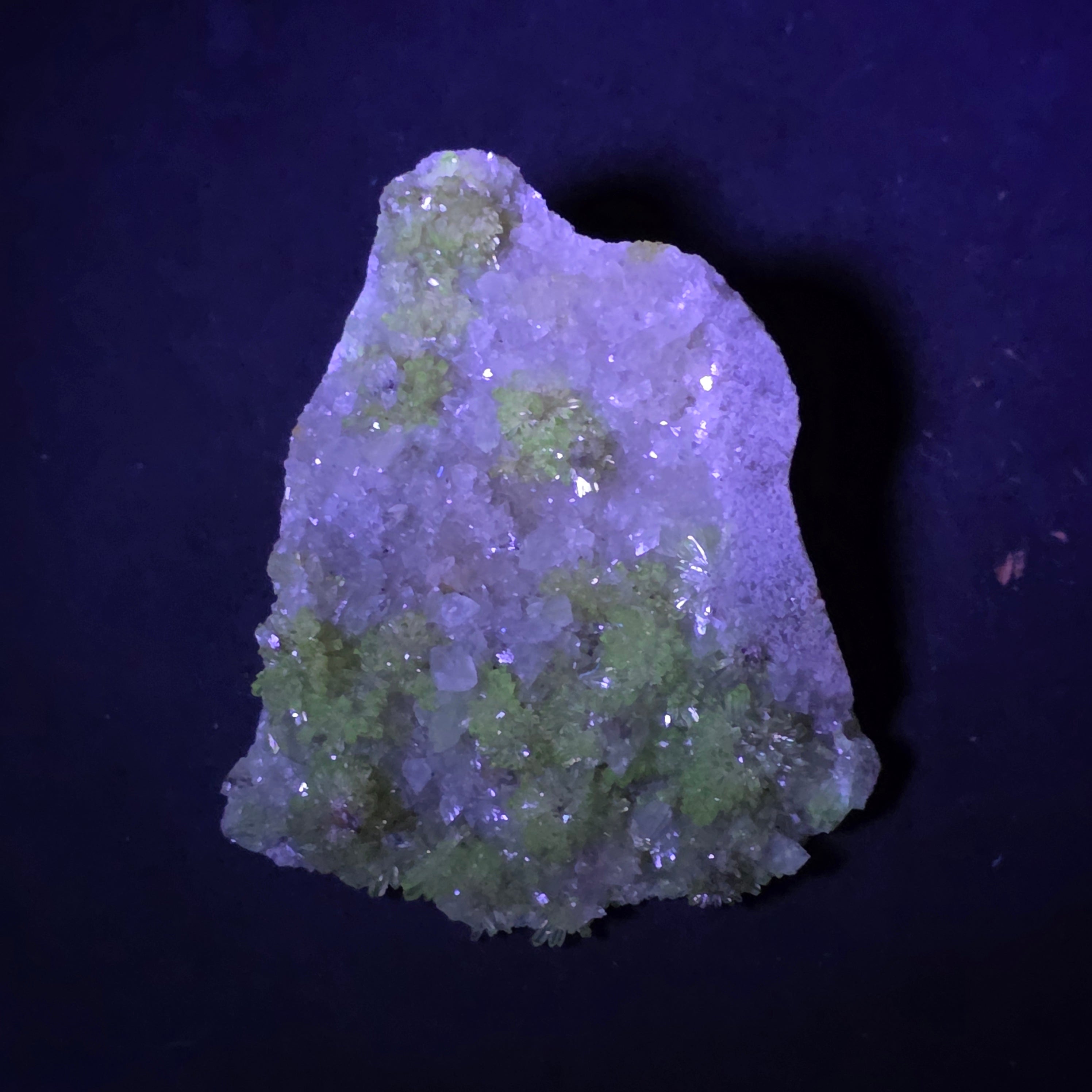 Този образец от адамит от Мексико, произхождащ от прочутата мина Охуела, Мапими – Дуранго, е минералогична колекционерска находка, високо ценена заради интензивния си, жълтозеленикав цвяти за спектакуларната си флуоресценция под UV светлина. Мина Охуела се счита за едно от най-важните класически находища в света за адамит, като частиците от тук са референтни за този минерал.