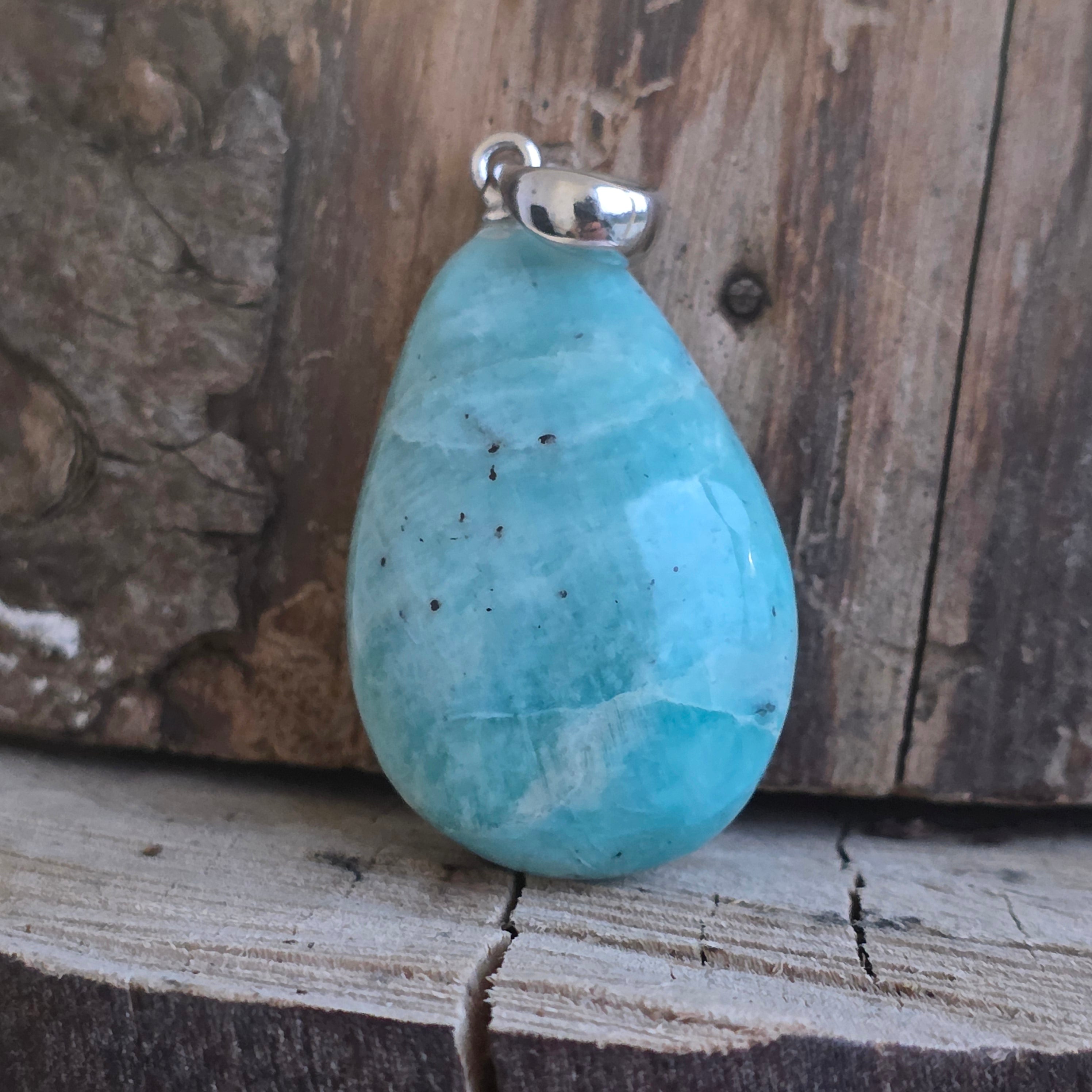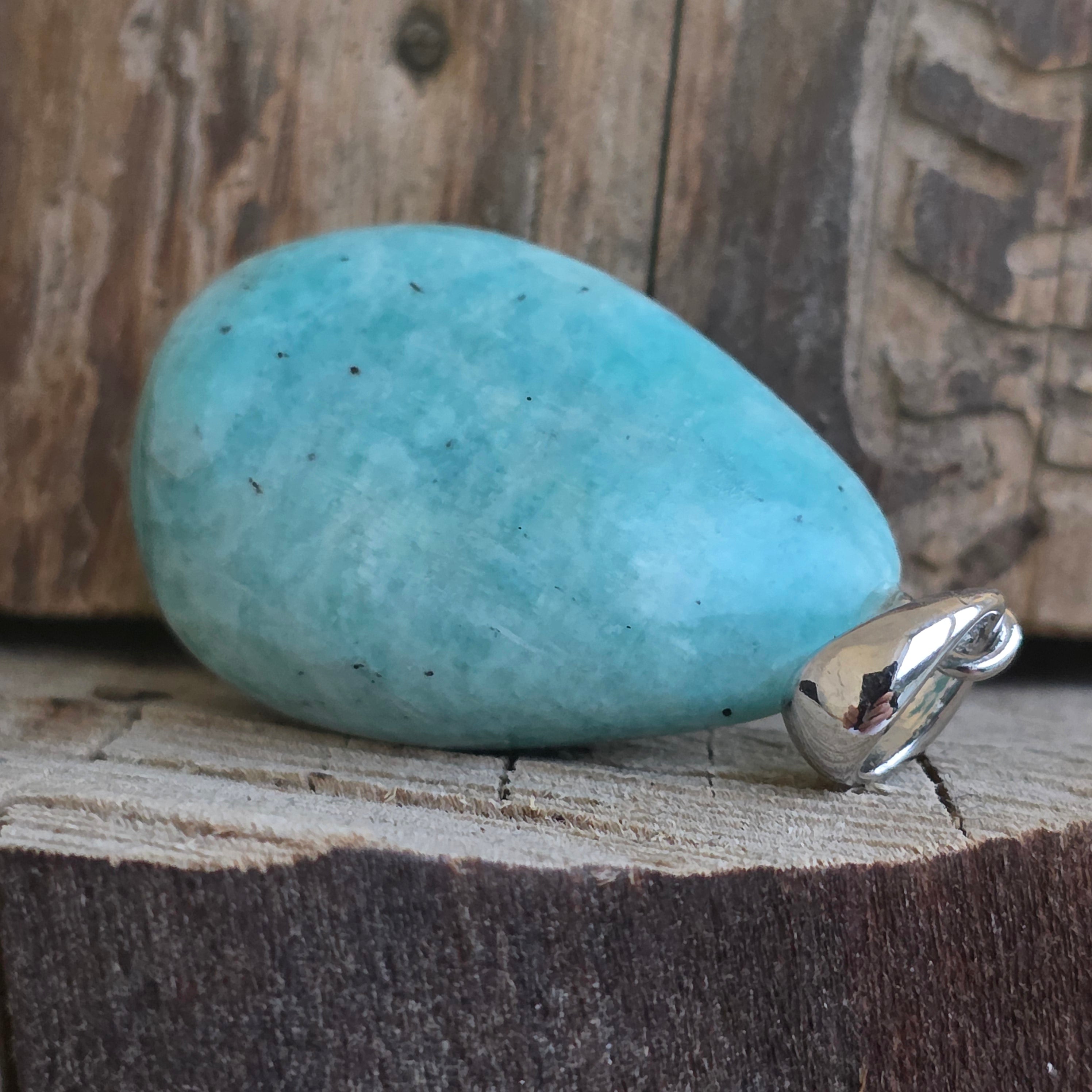 Този амазонитен кабошон медальон подчертава нежните зелени и сини нюанси на камъка, свързани с вътрешния мир и емоционалното равновесие. Всяко парче е уникално поради естествените вариации в цвета и текстурата, което прави този медальон наистина специално бижу.