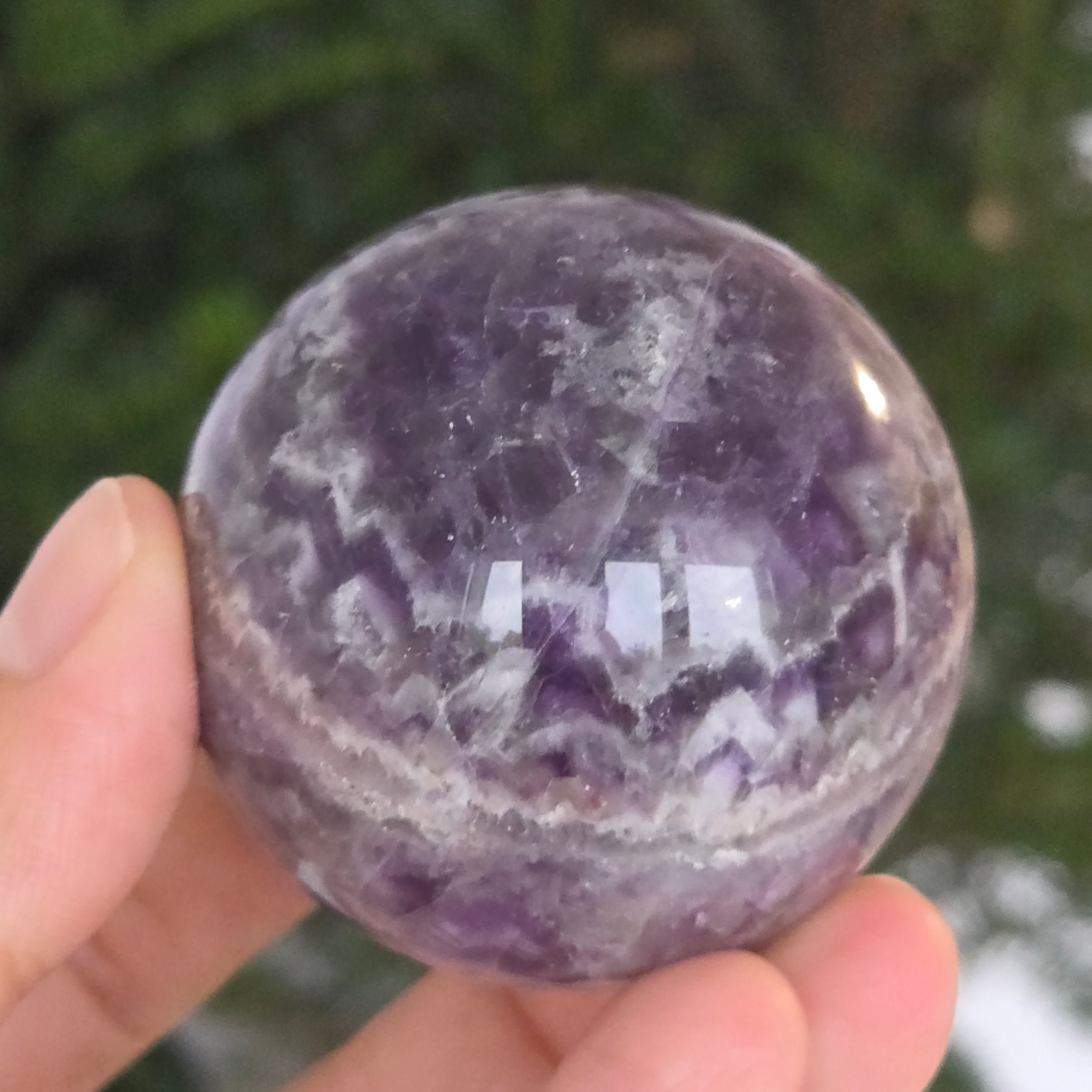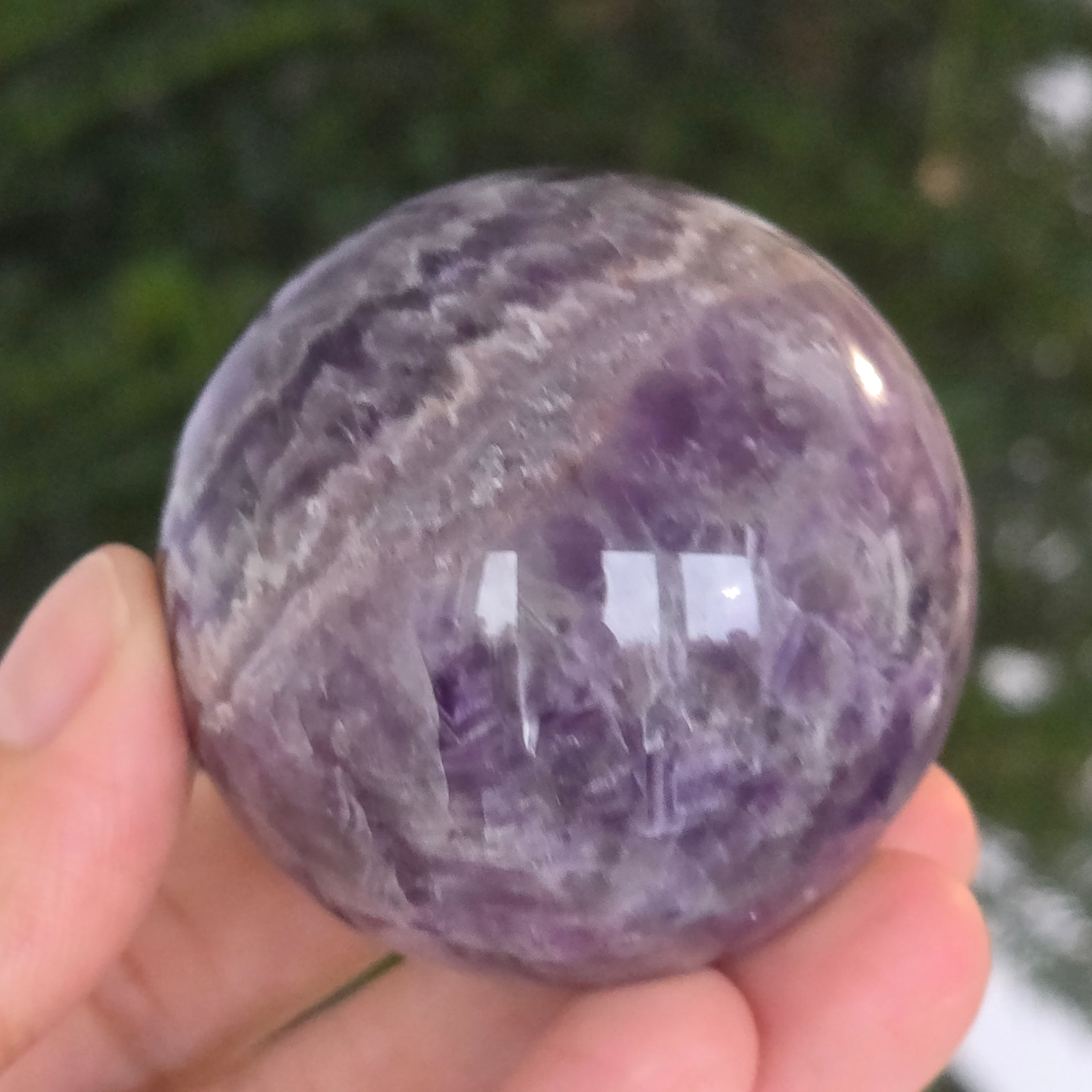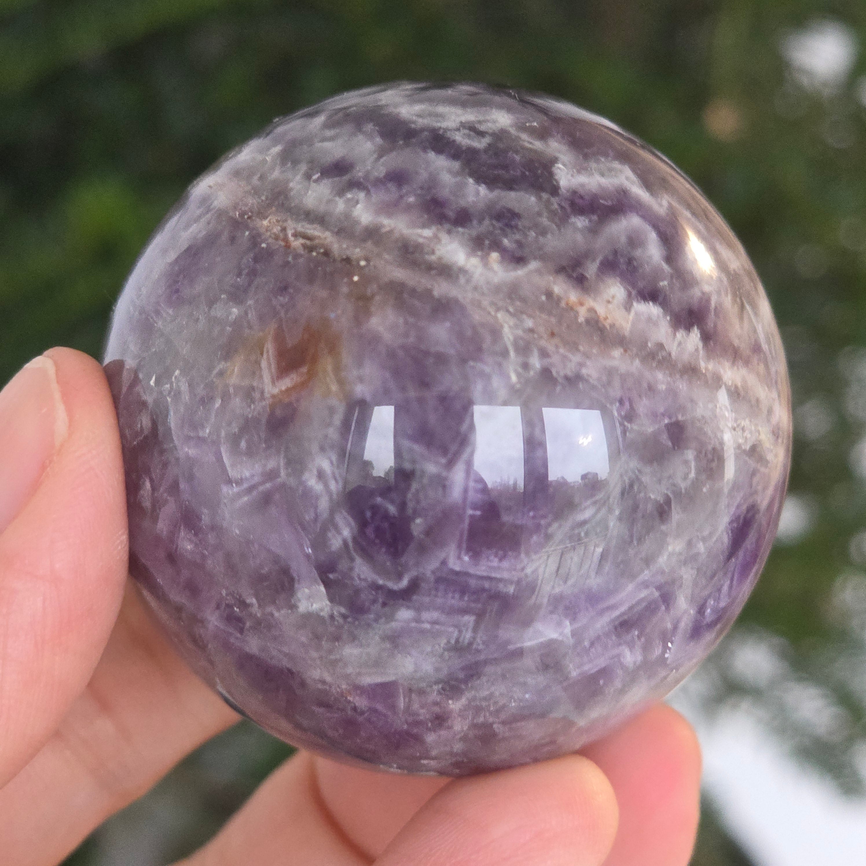 Сфера, която изглежда като че концентрира вътрешната светлина на лилава нощ. Този уникален артикул от натурален аметист Chevronразкрива удивителни слоеве виолетово, бяло и лавандула, подредени във V форми – отличителният знак на този рядък вид аметист. Перфектно полирана повърхност, кадифена на допир, отразява светлината с хипнотизираща финес, внасяйки спокойствие и изтънченост във всяко пространство.