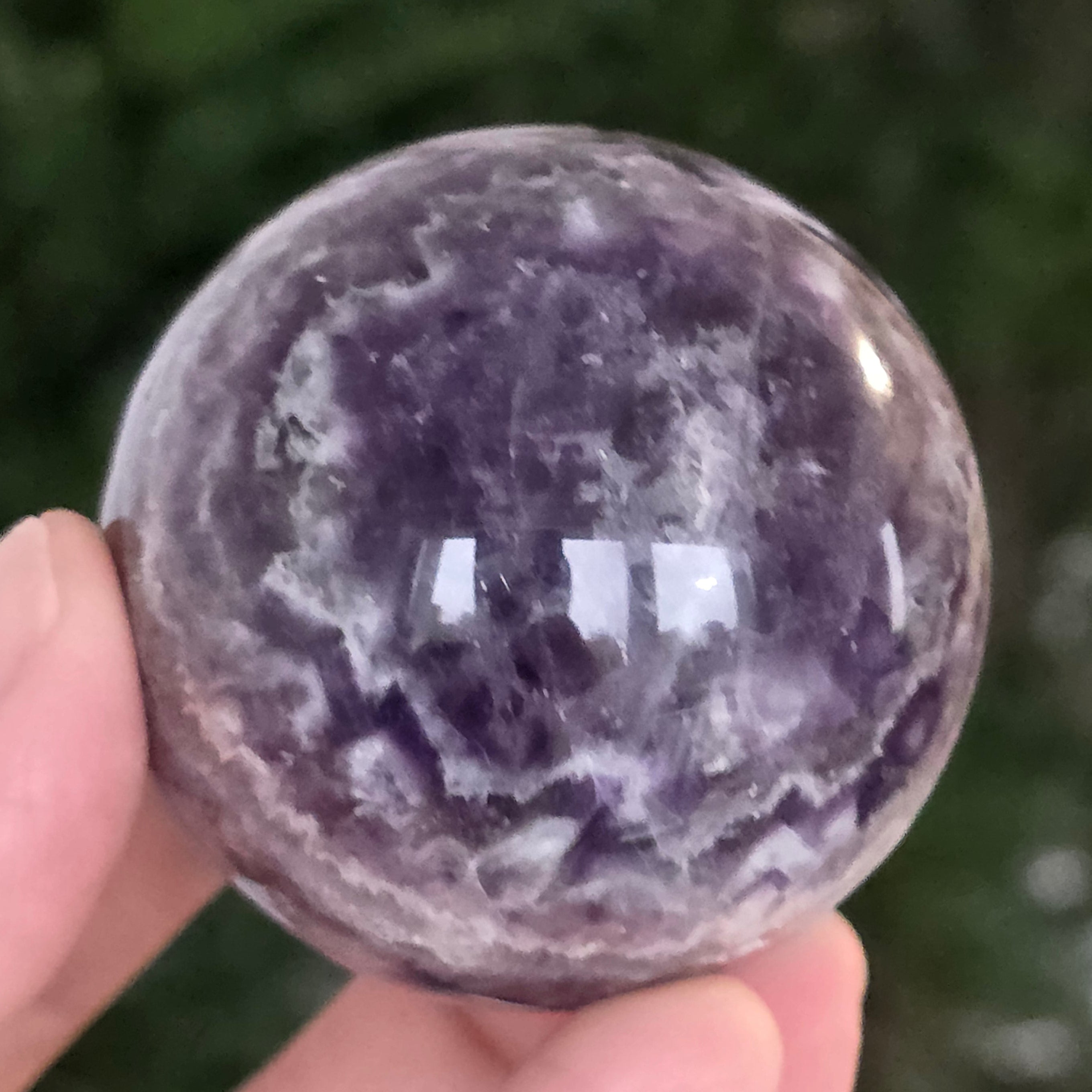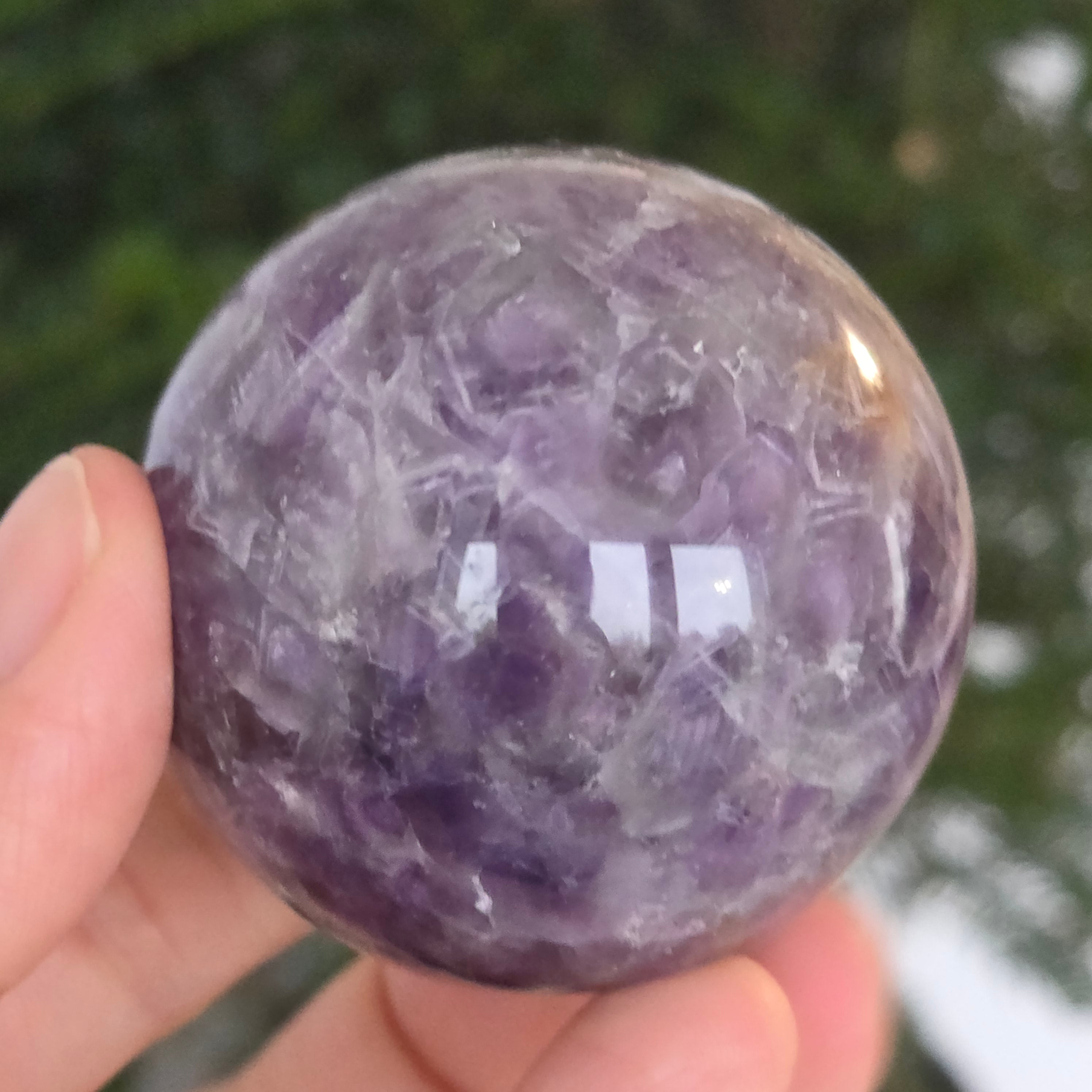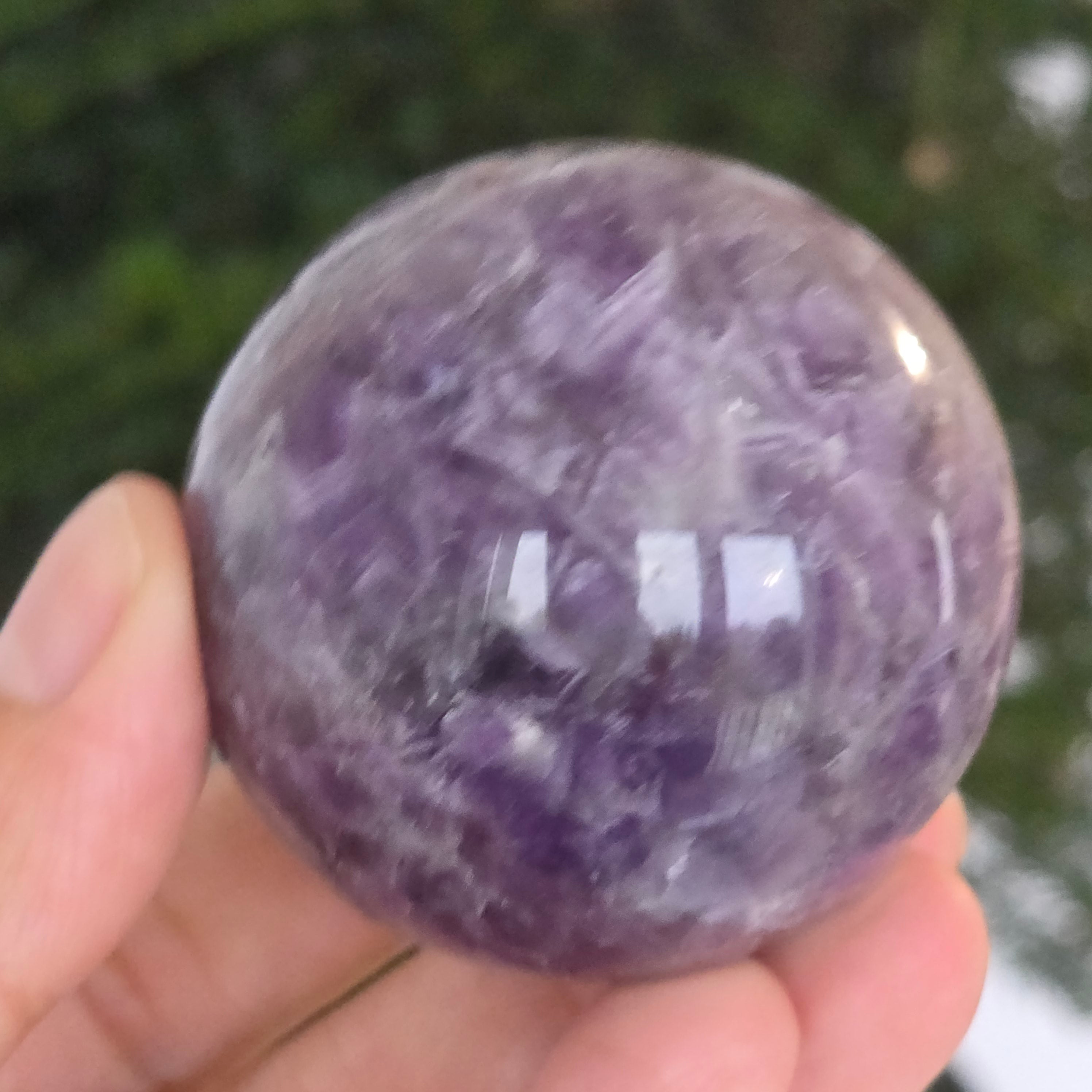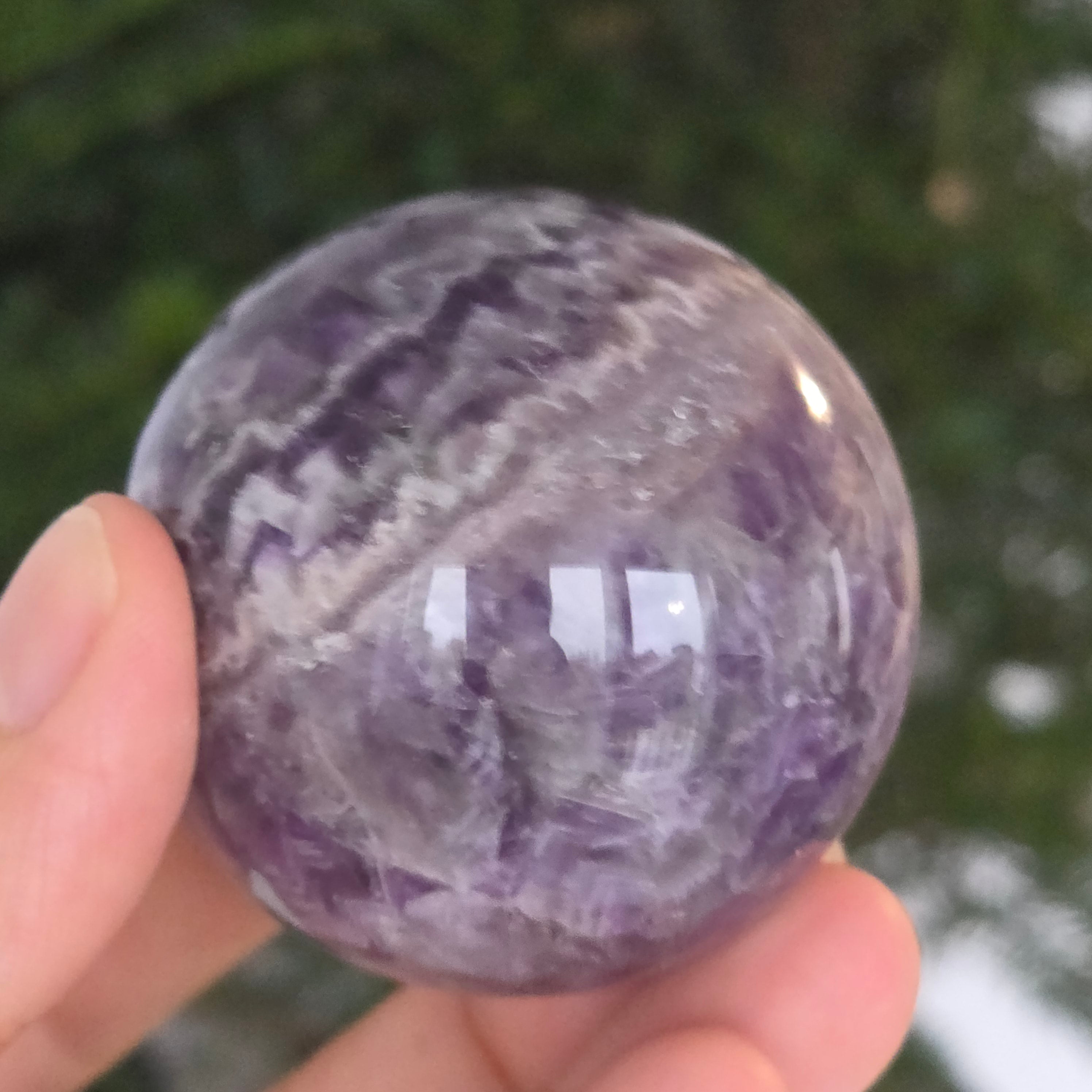 Сфера, която изглежда като че концентрира вътрешната светлина на лилава нощ. Този уникален артикул от натурален аметист Chevronразкрива удивителни слоеве виолетово, бяло и лавандула, подредени във V форми – отличителният знак на този рядък вид аметист. Перфектно полирана повърхност, кадифена на допир, отразява светлината с хипнотизираща финес, внасяйки спокойствие и изтънченост във всяко пространство.