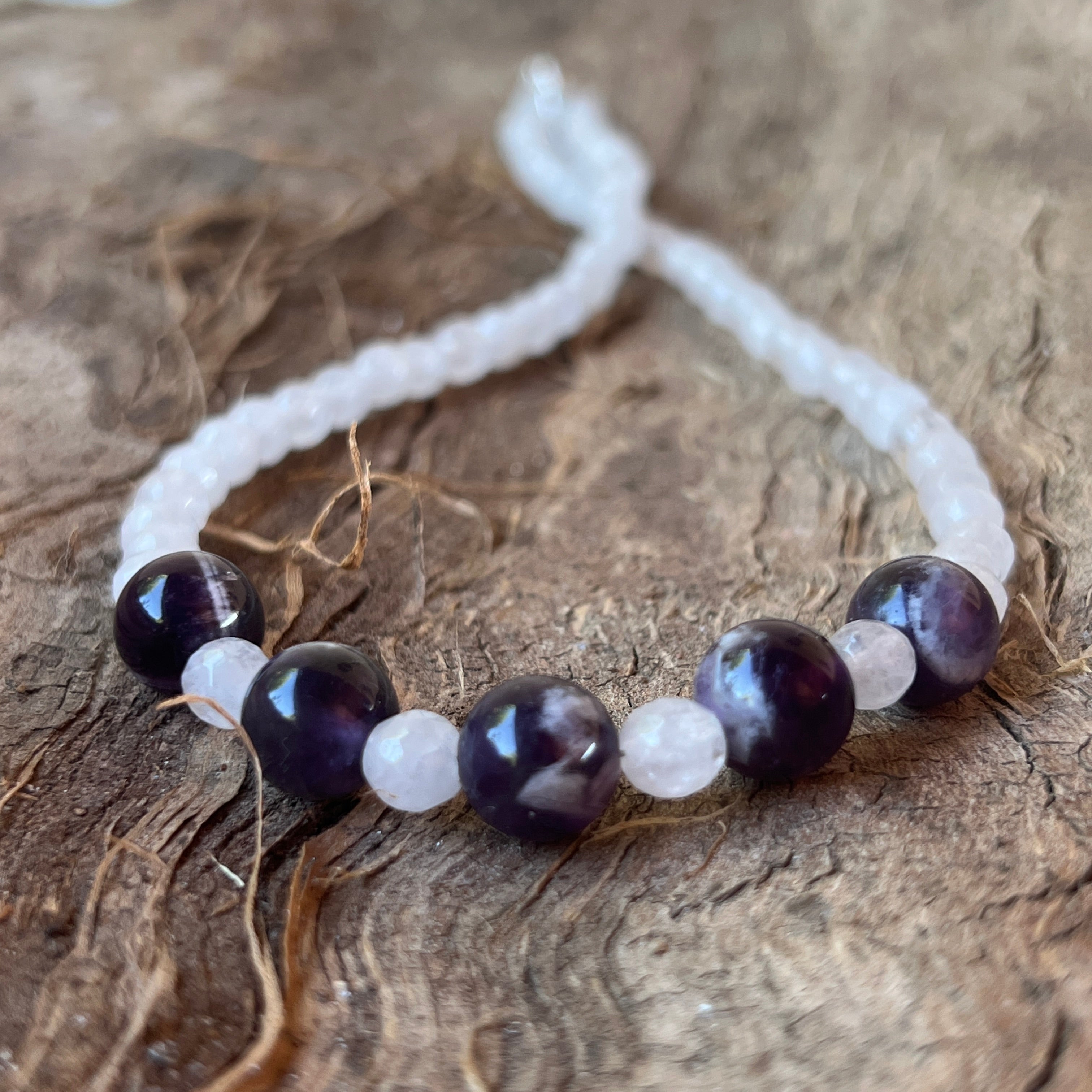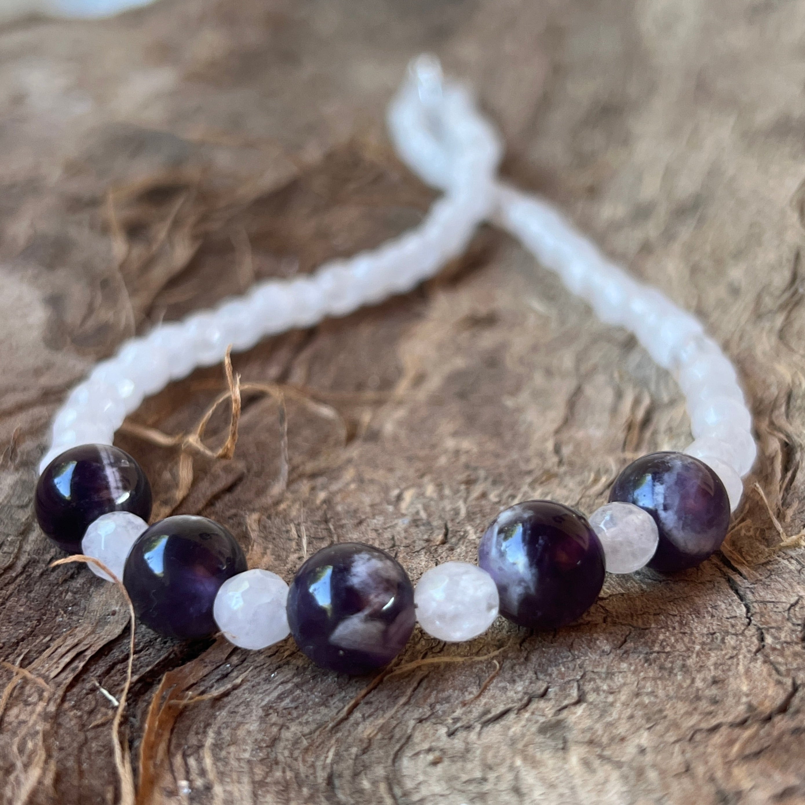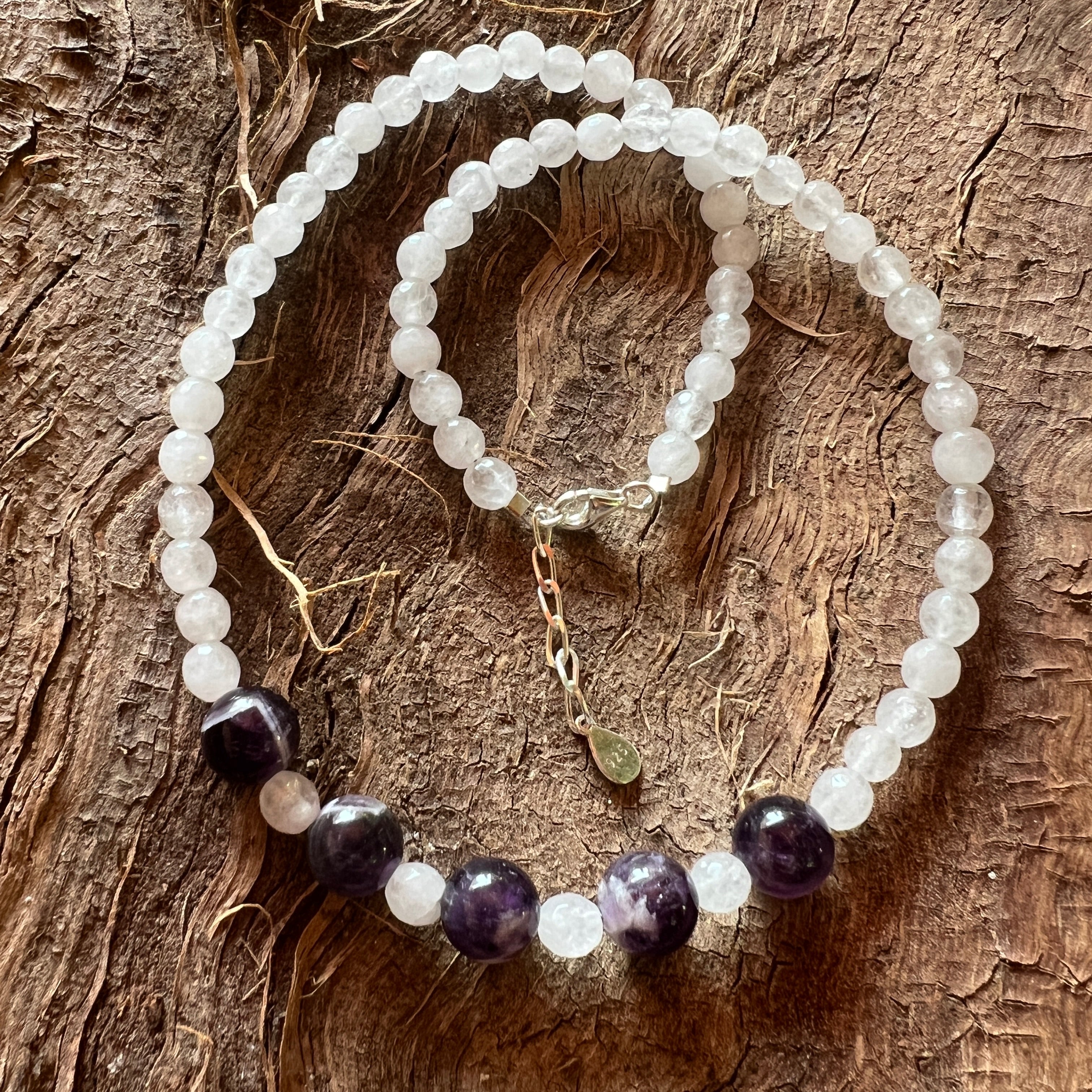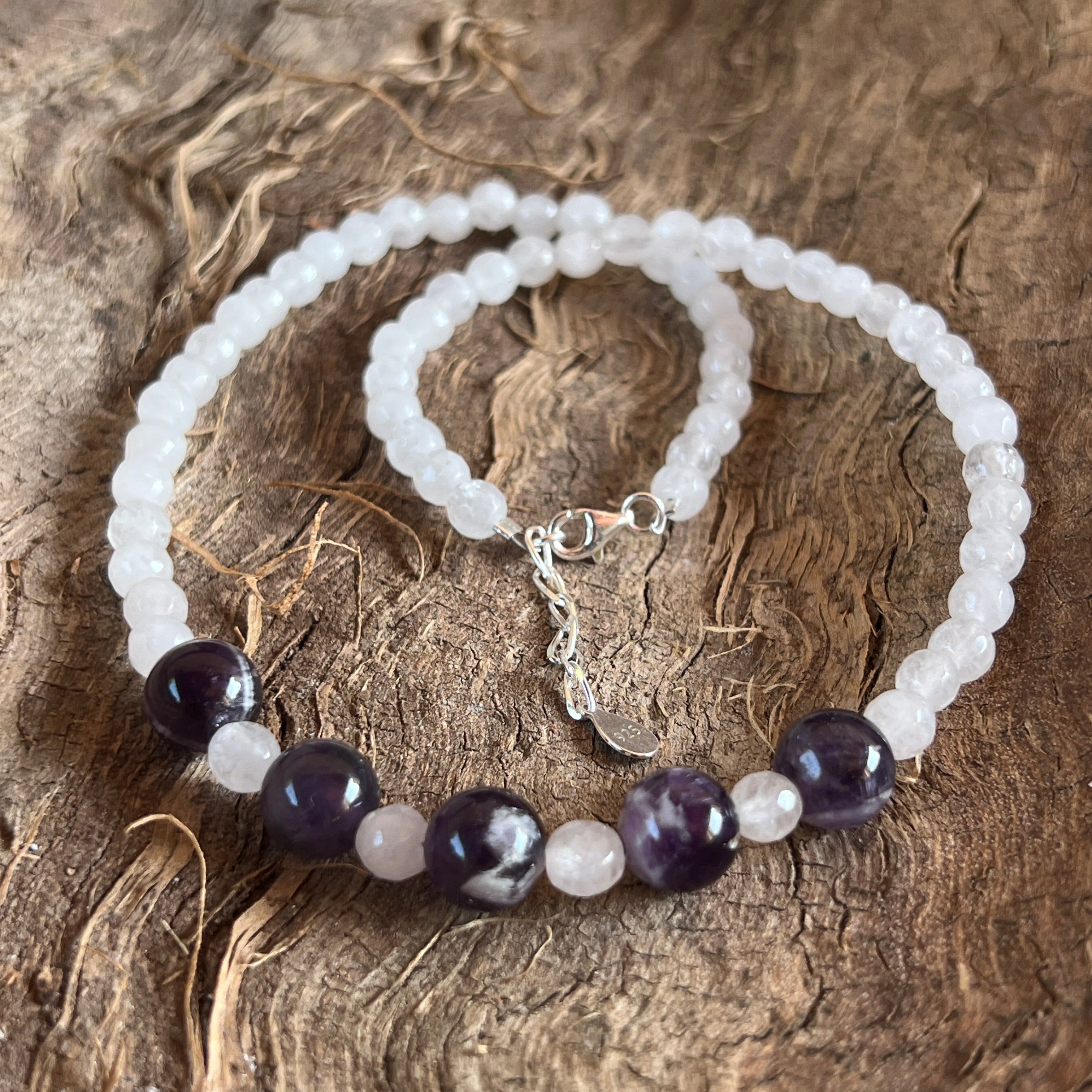 Белият нефрит е камъкът на вътрешния мир и нежност. Твърди се, че носи хармония, поддържа ясно мислене и се свързва с дълбоко спокойствие. Аметистът, от друга страна, отваря вратата към духовността и мъдростта, защитавайки и издигайки в същото време. Заедно те създават бижу, което отразява баланса между разума и мечтата.