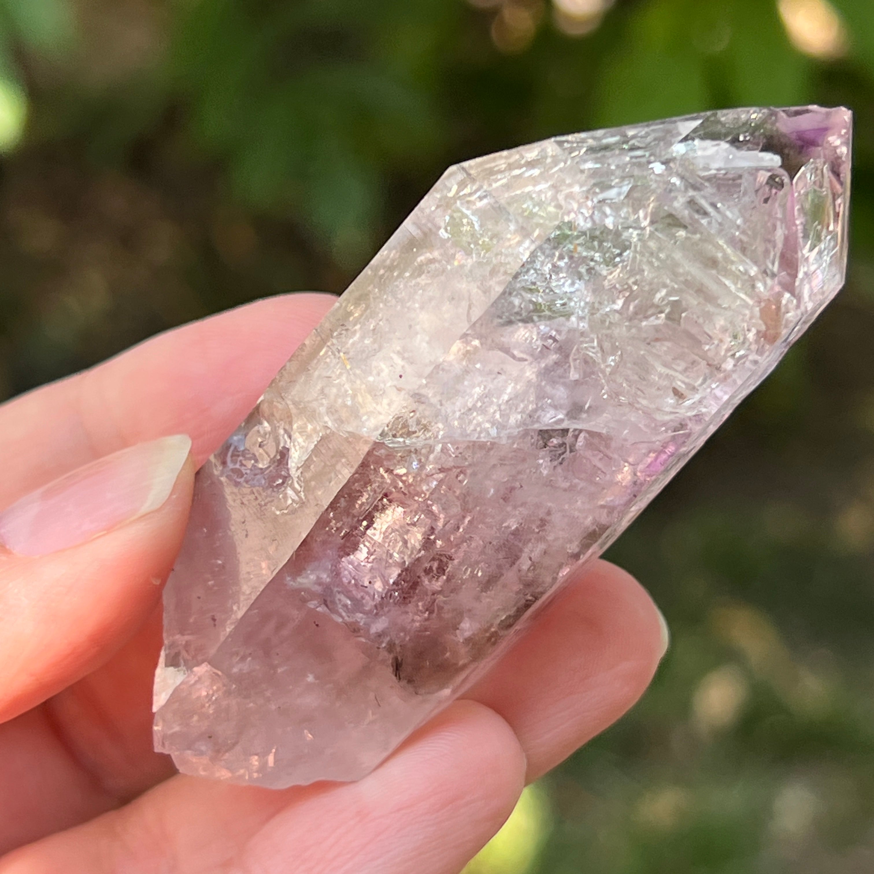 Кристализирайки в тригонална система, този образец на SiO₂ (диоксид на силиция) се отличава с отличната си прозрачност и естествените си, шестоъгълни форми. Някои парчета включват „фантоми“ – вътрешни контури, отразяващи предишни етапи на растеж – или съдържат движими мехурчета с хидротермална течност, хематит или геотит, всички уловени вътре в кристала преди милиони години.