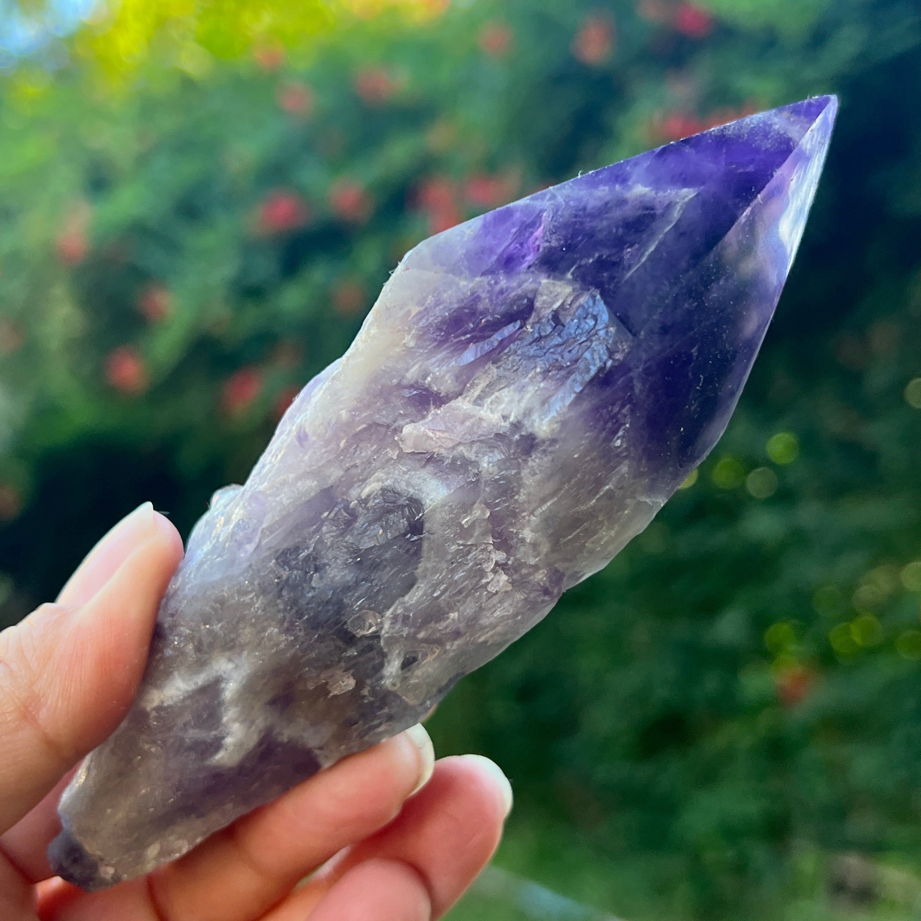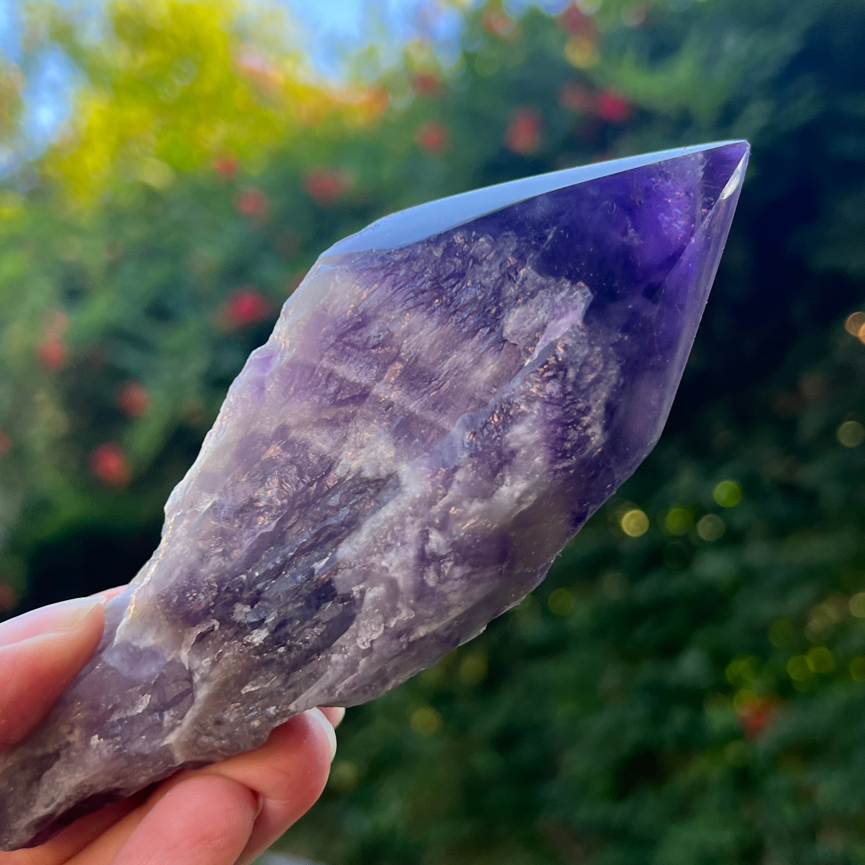 Шевронният аметист е известен със своите асоциации с чакрите на короната и третото око, повишавайки интуицията и способността за вземане на решения.