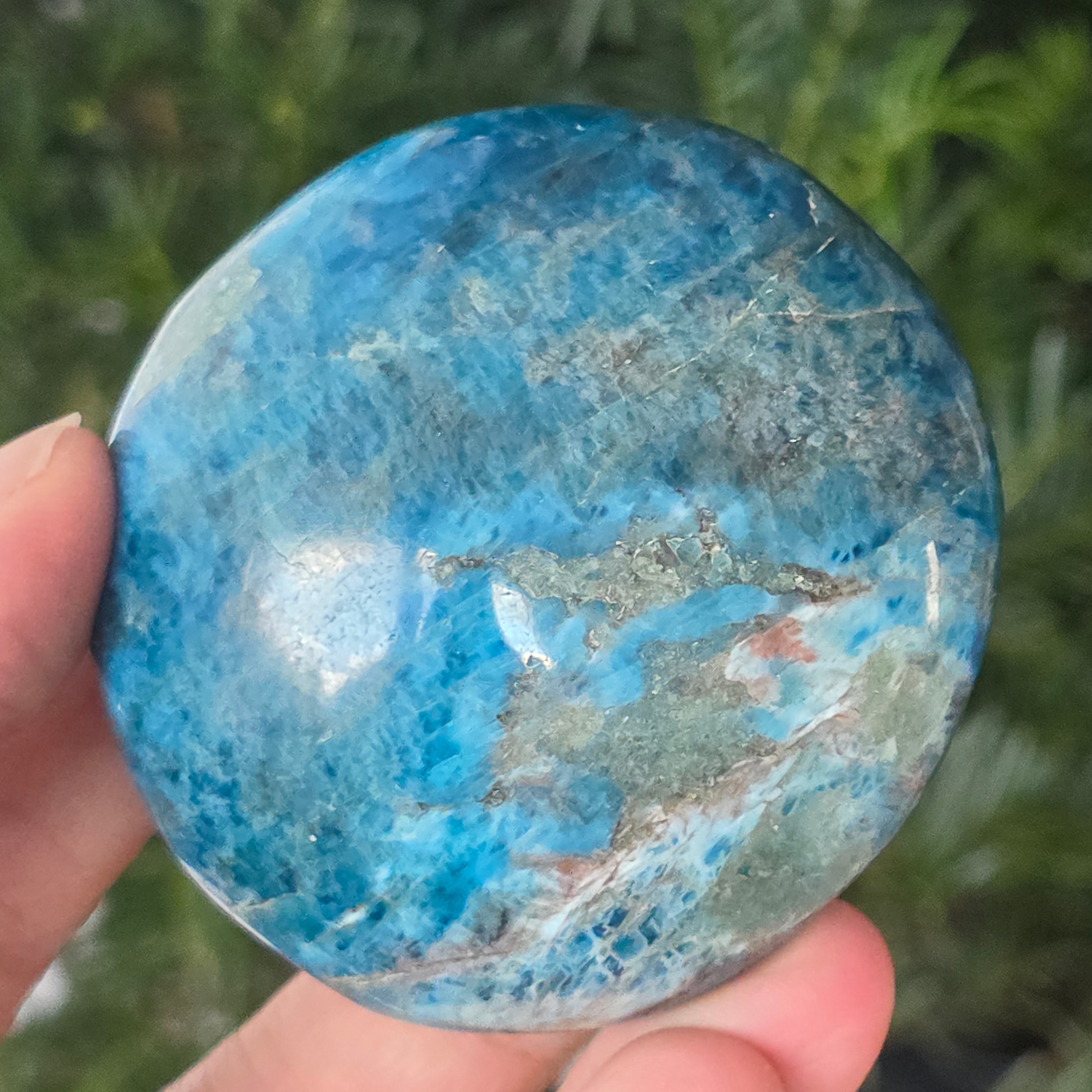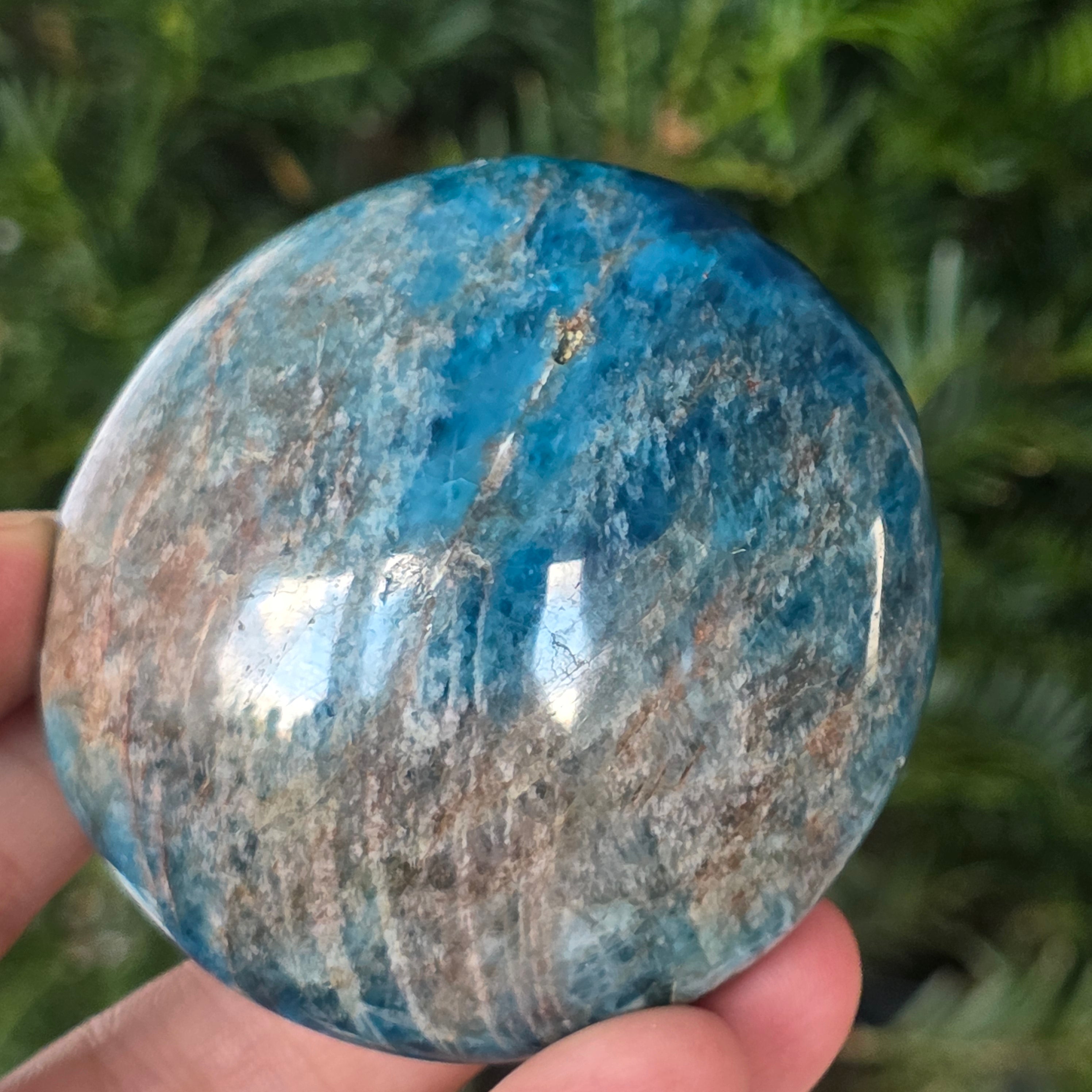 Blue apatite е признат за подобряване на комуникацията и изразяването, като е полезен за хора, страдащи от социална тревожност или страх от публични изяви. Смята се, че този камък също помага за повишаване на креативността и разбирането.