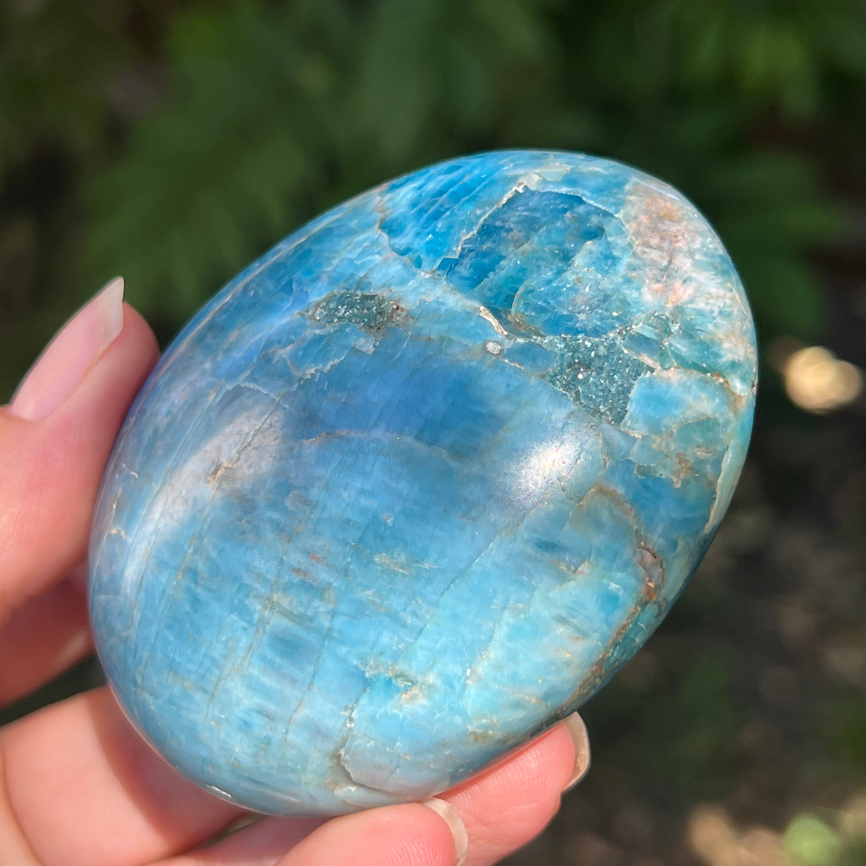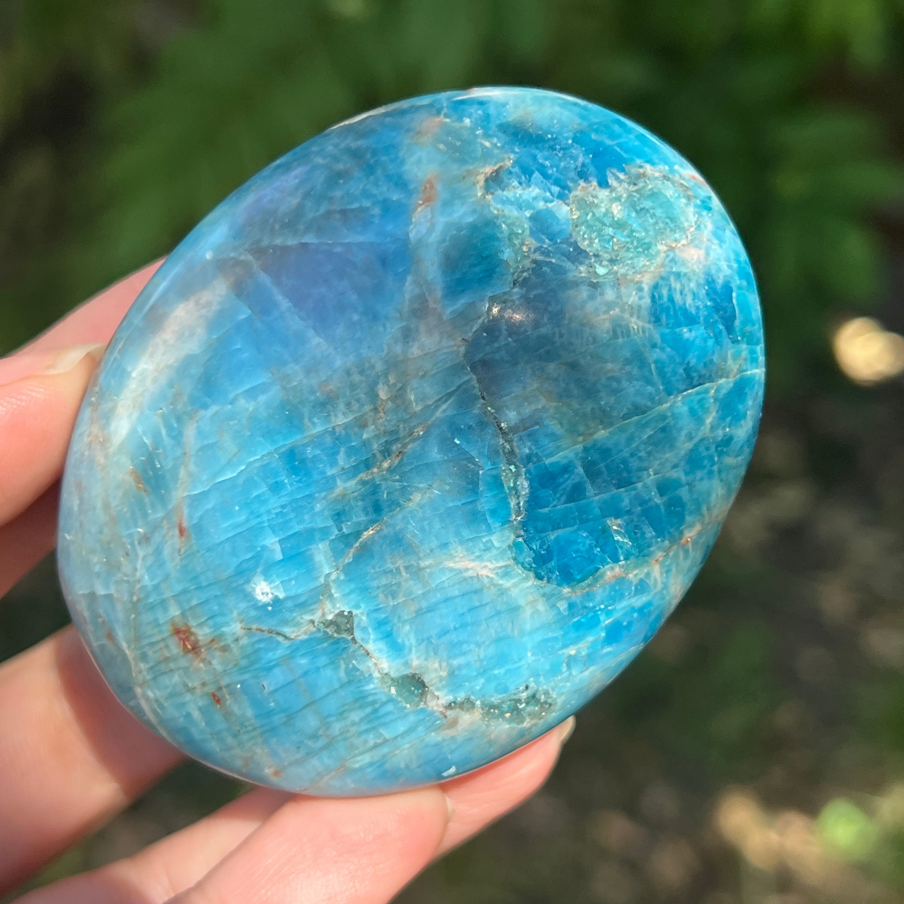 Blue apatite е признат за подобряване на комуникацията и изразяването, като е полезен за хора, страдащи от социална тревожност или страх от публични изяви. Смята се, че този камък също помага за повишаване на креативността и разбирането.