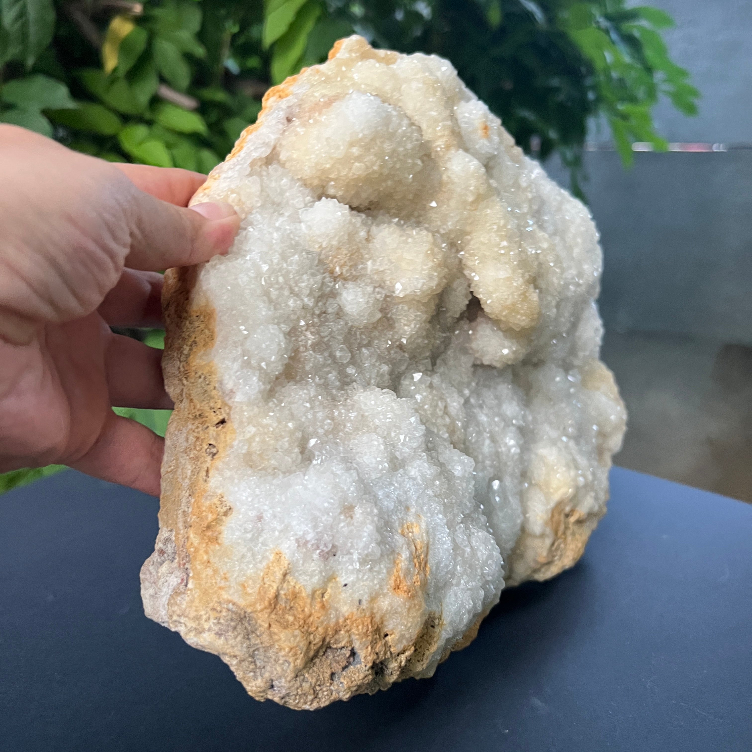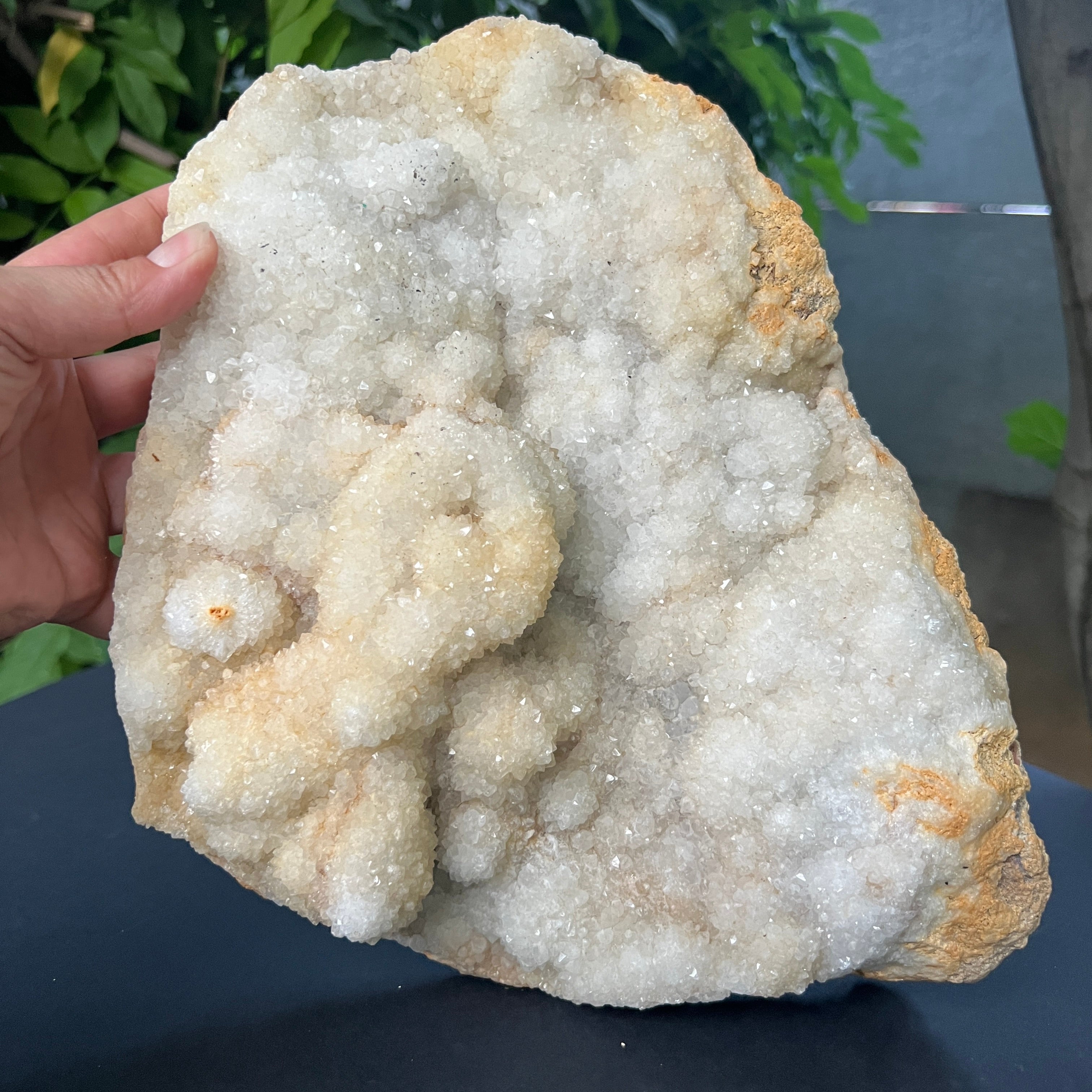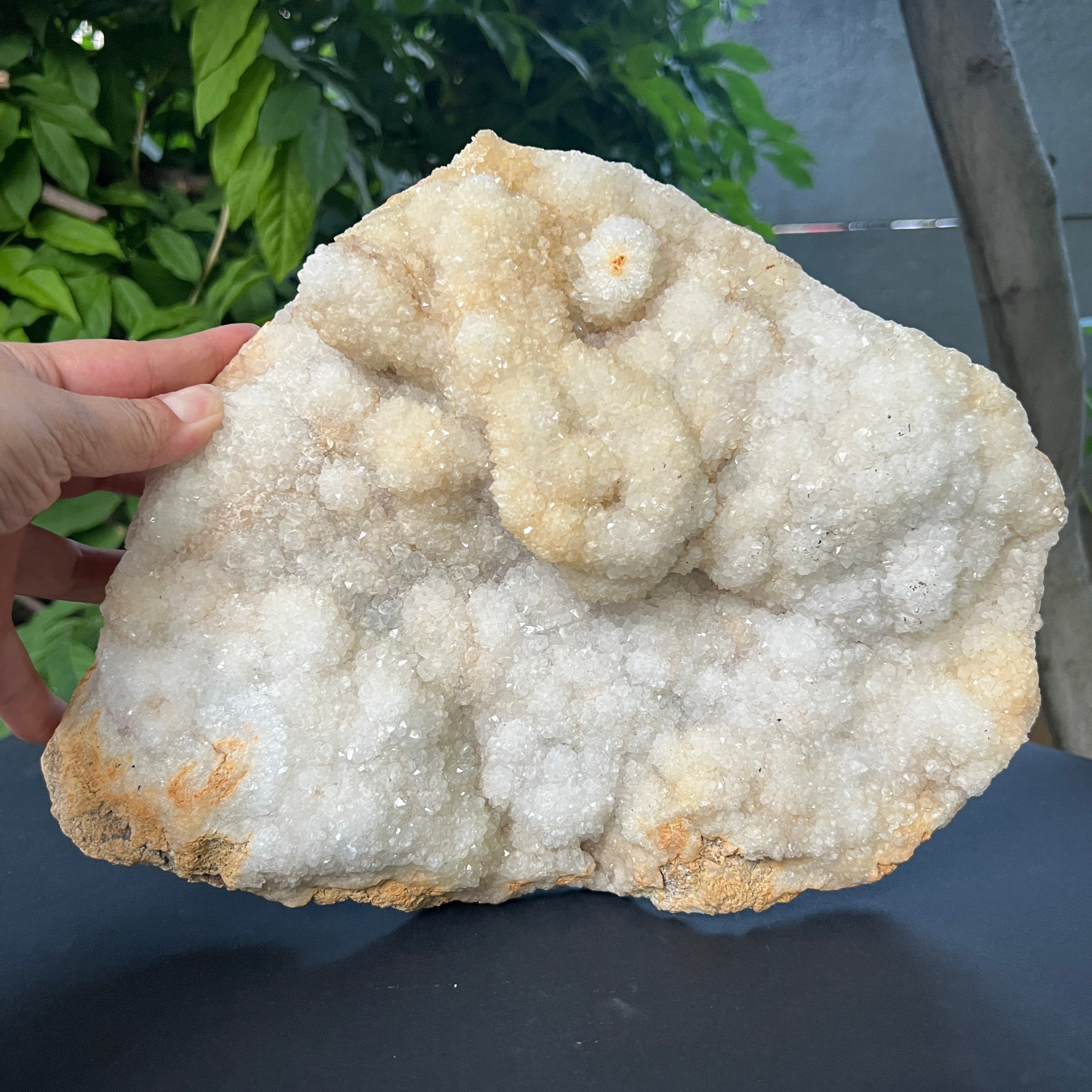 Редък и завладяващ образец, тази естествена формация от ботройдален кварц изглежда като изваяна от вълните на времето в танц на органични форми, покрити с нежна мантия от друзирани кристали. Повърхността му дискретно блести на естествена светлина, благодарение на фината кристализация, която обгръща гладките, почти скулптурни релефи на основата.