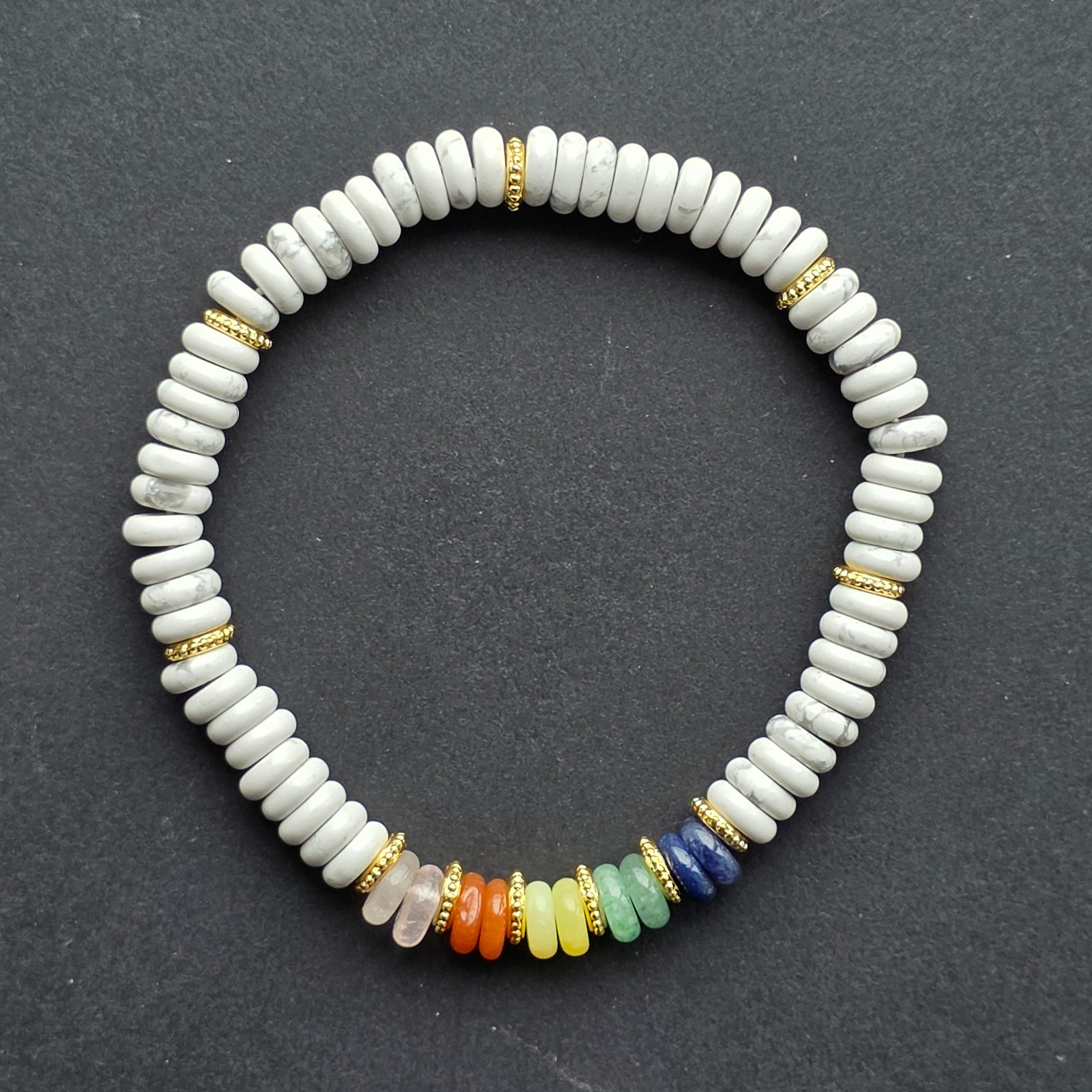 В централната част редът от цветни камъни носи цветната енергия на тези 7 чакри, всеки цвят представлява етап от вътрешното равновесие. Заедно те създават ярък и хармоничен акцент, който вдъхва живот на гривната и я превръща в символ на баланс, ясни намерения и връщане към себе си.