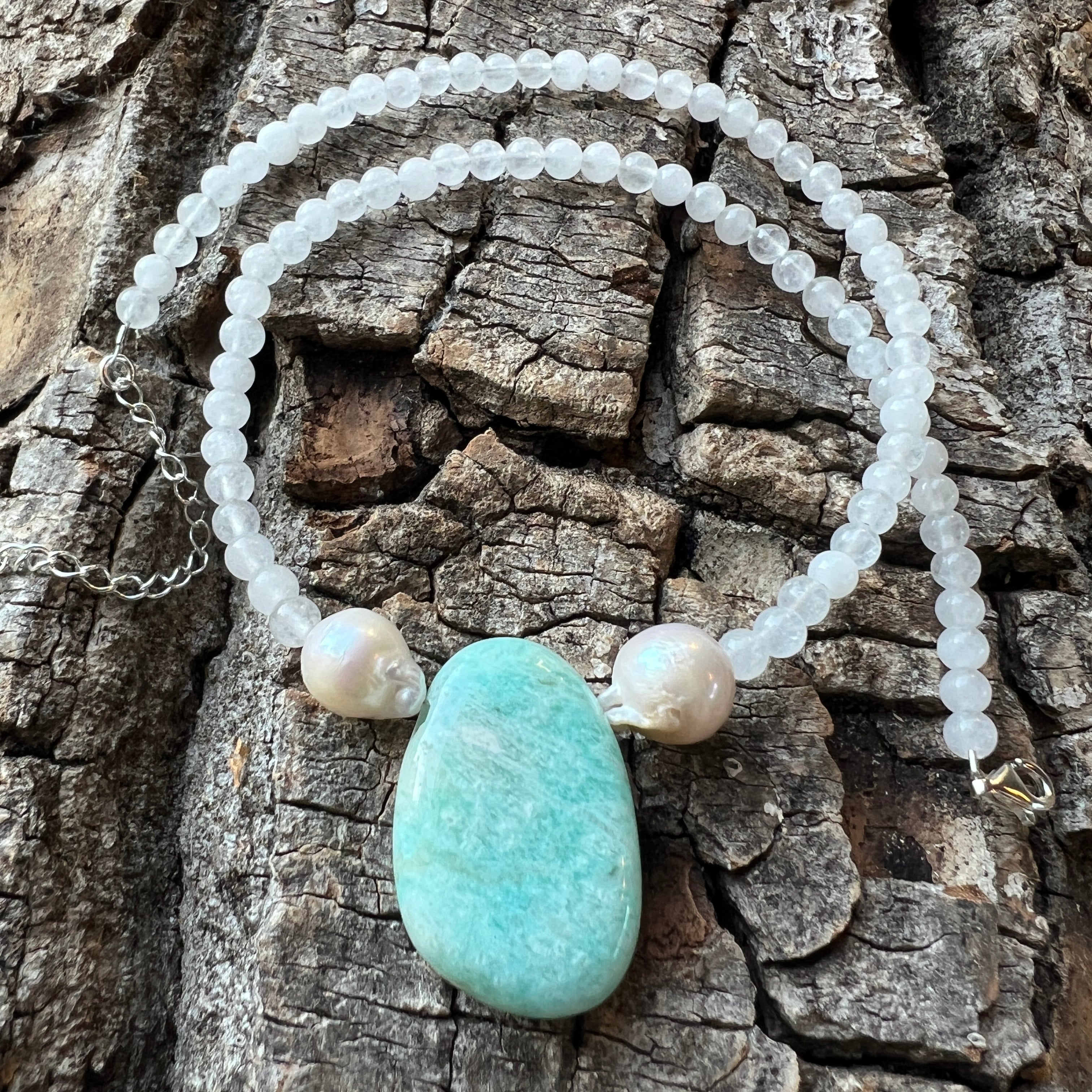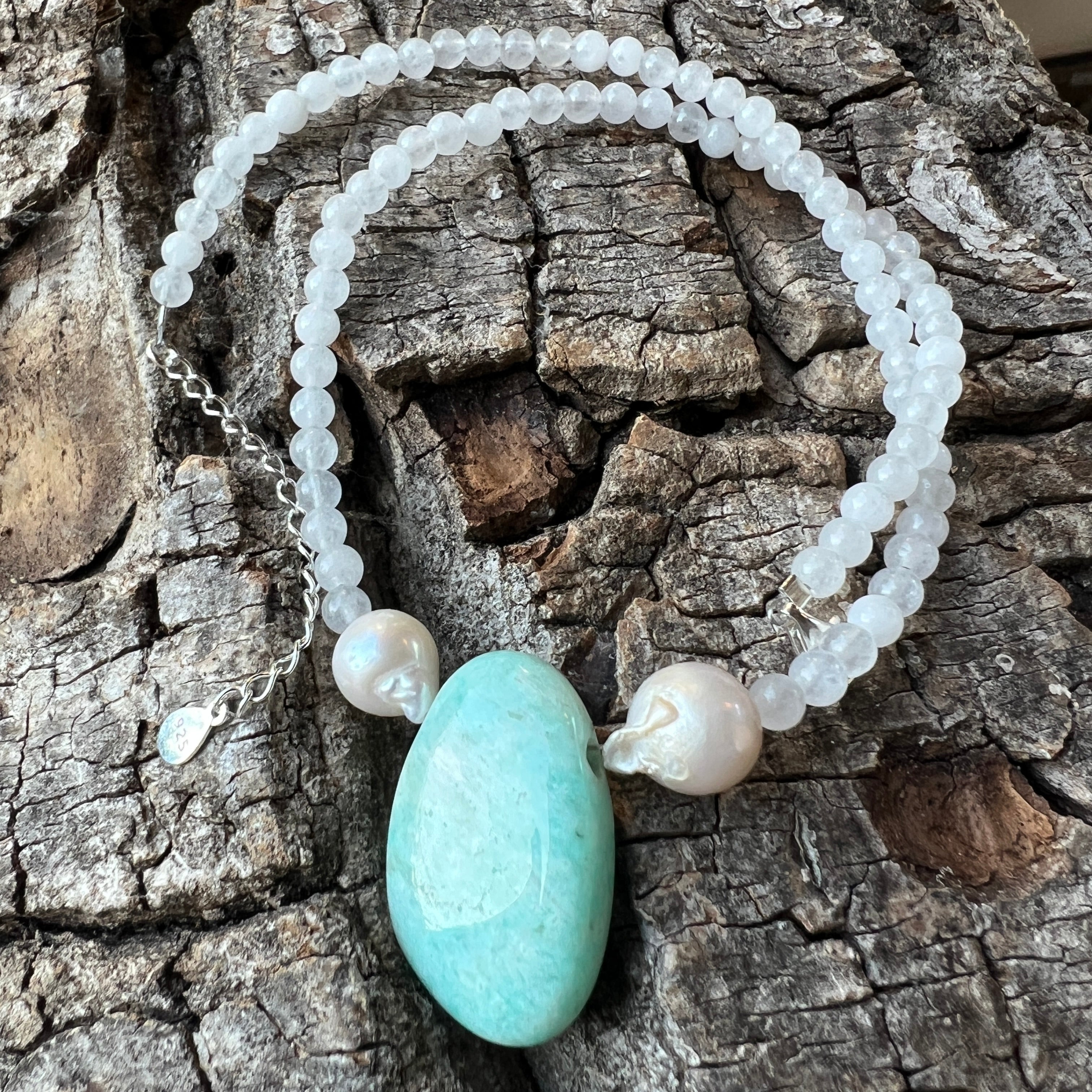 Това бижу отразява деликатен баланс: между защитното спокойствие на белия нефрит, отворената вибрация на синия амазонит и несъвършената женственост на естествената перла. Това е гердан за мирното сърце – за жената, която уважава себе си такава, каквато е: между светлина, спокойствие и нежна сила.