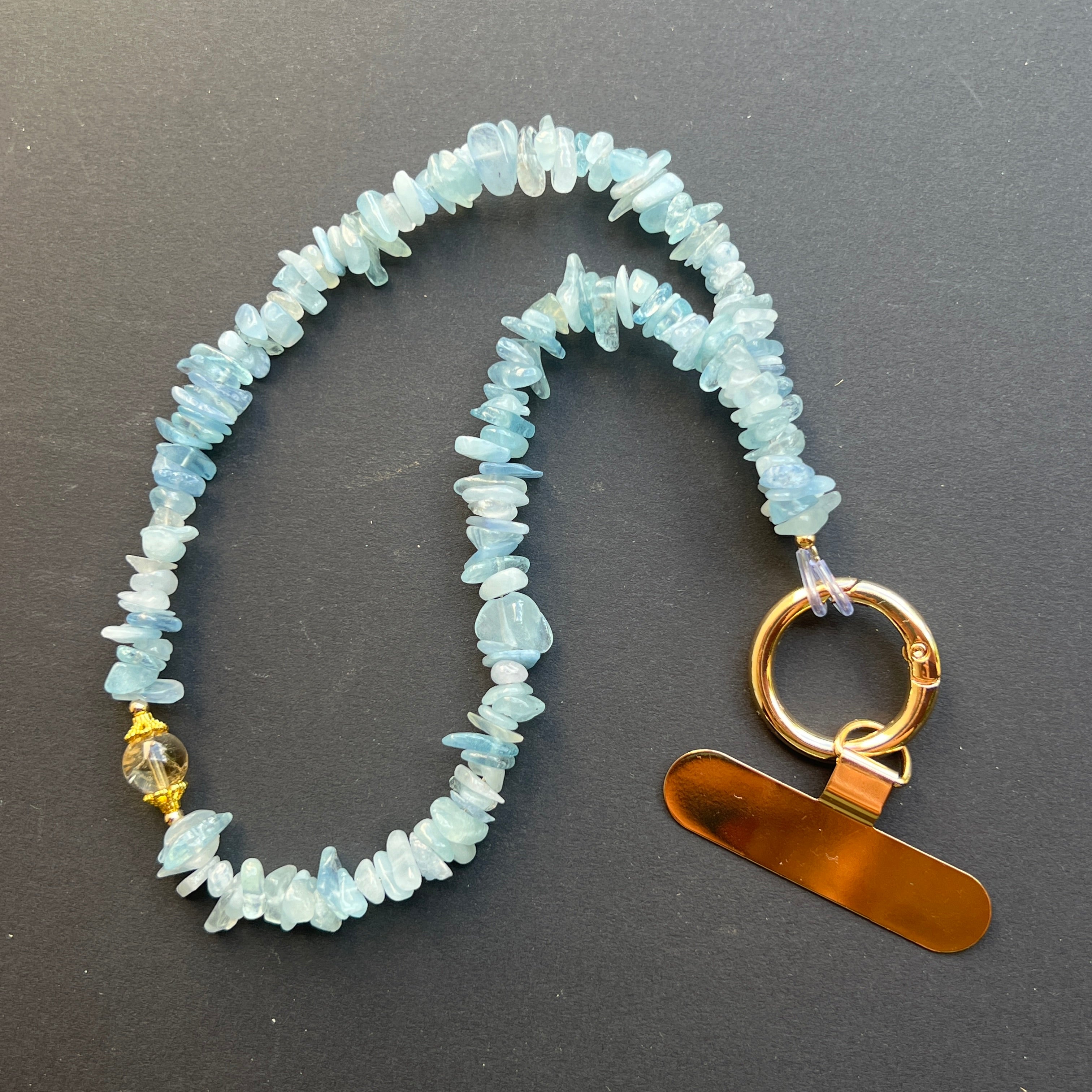 Обогатете телефона си с елегантна верижка, изработена от естествени чипсове аквамарин, с дължина 40 см. Аксесоар, който носи спокойствие, яснота и пречистваща енергия в ежедневието ви.