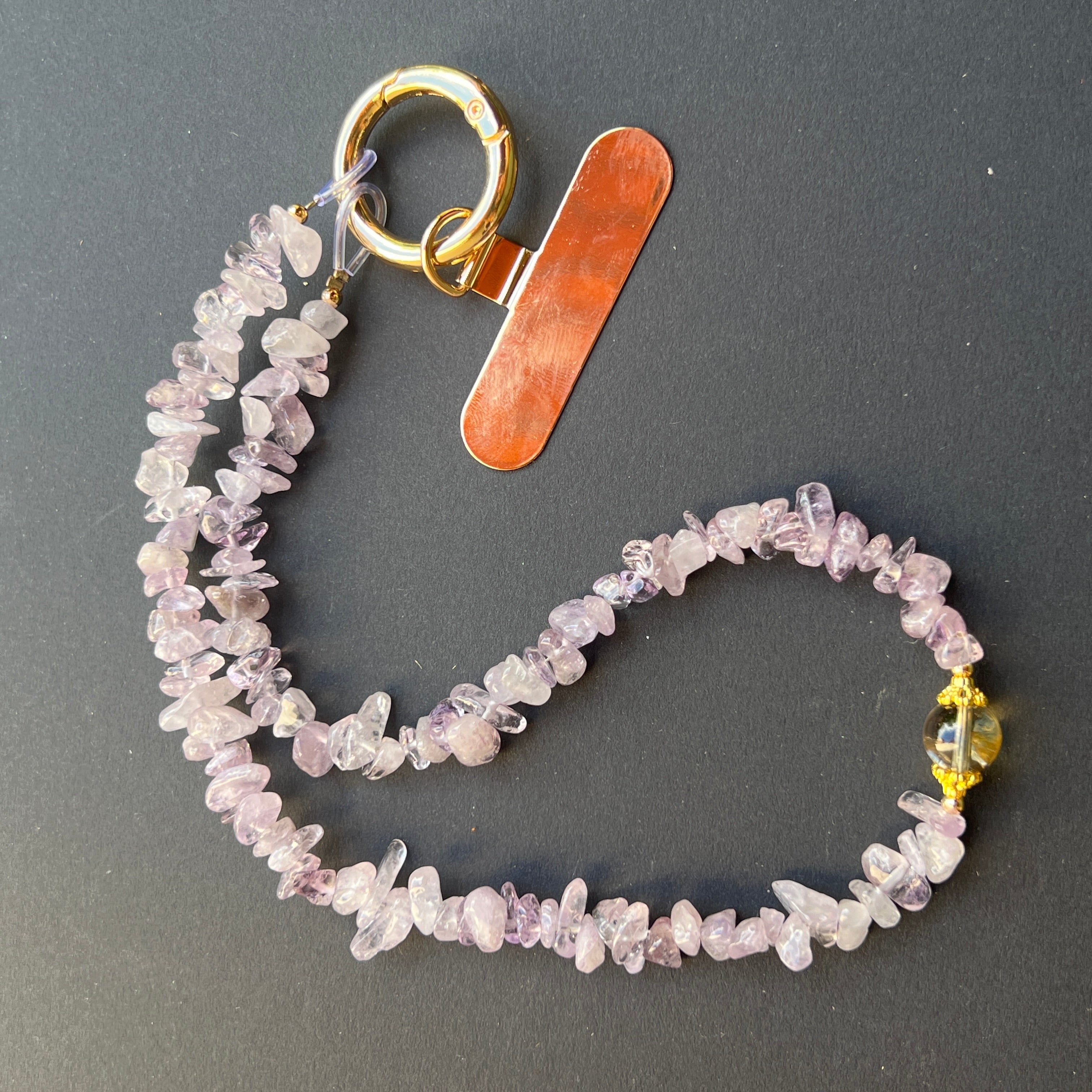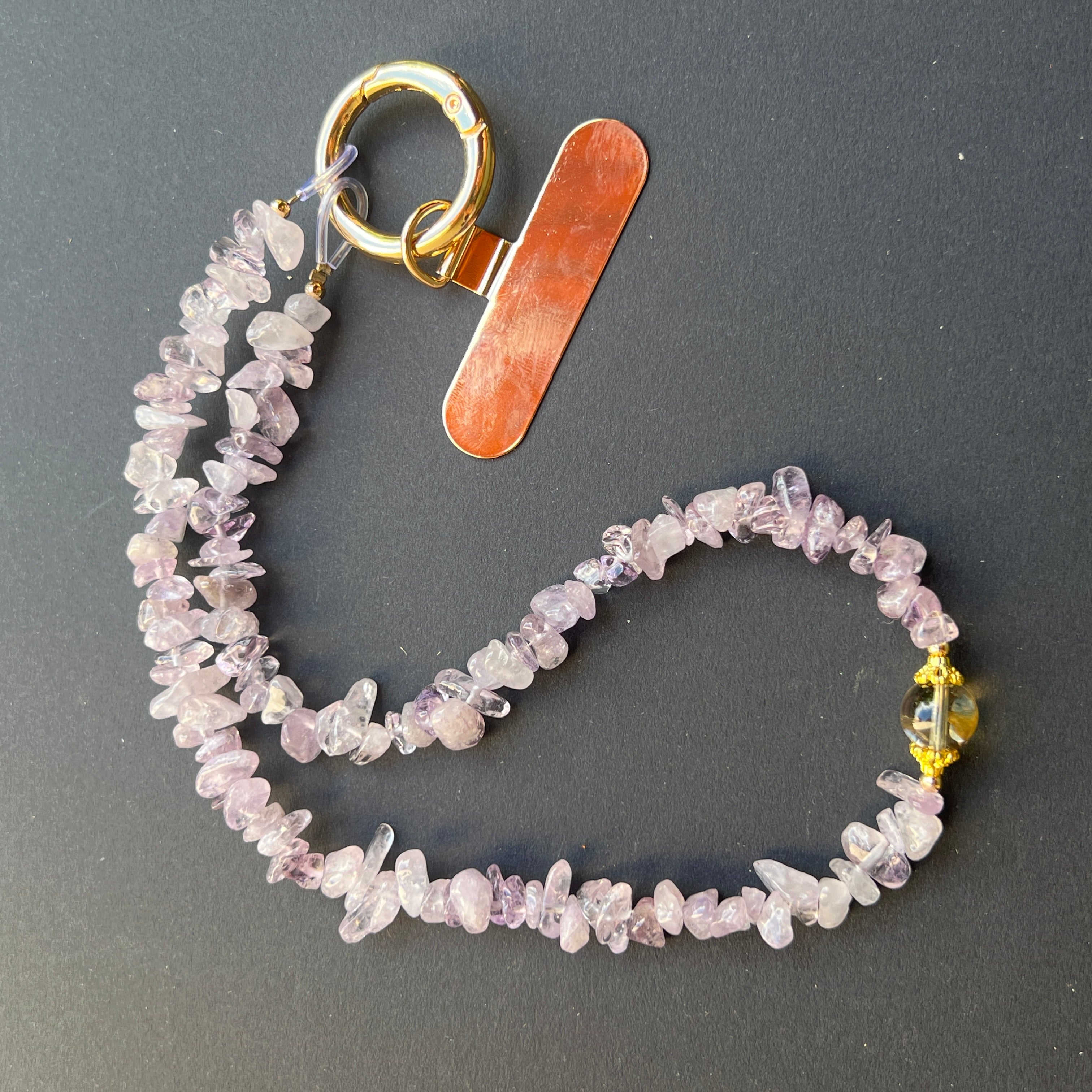 Допълни телефона си с елегантна верижка, изработена от натурални аметистови чипсове с дължина 40 см. Този аксесоар добавя красота и положителна енергия в ежедневието ти.