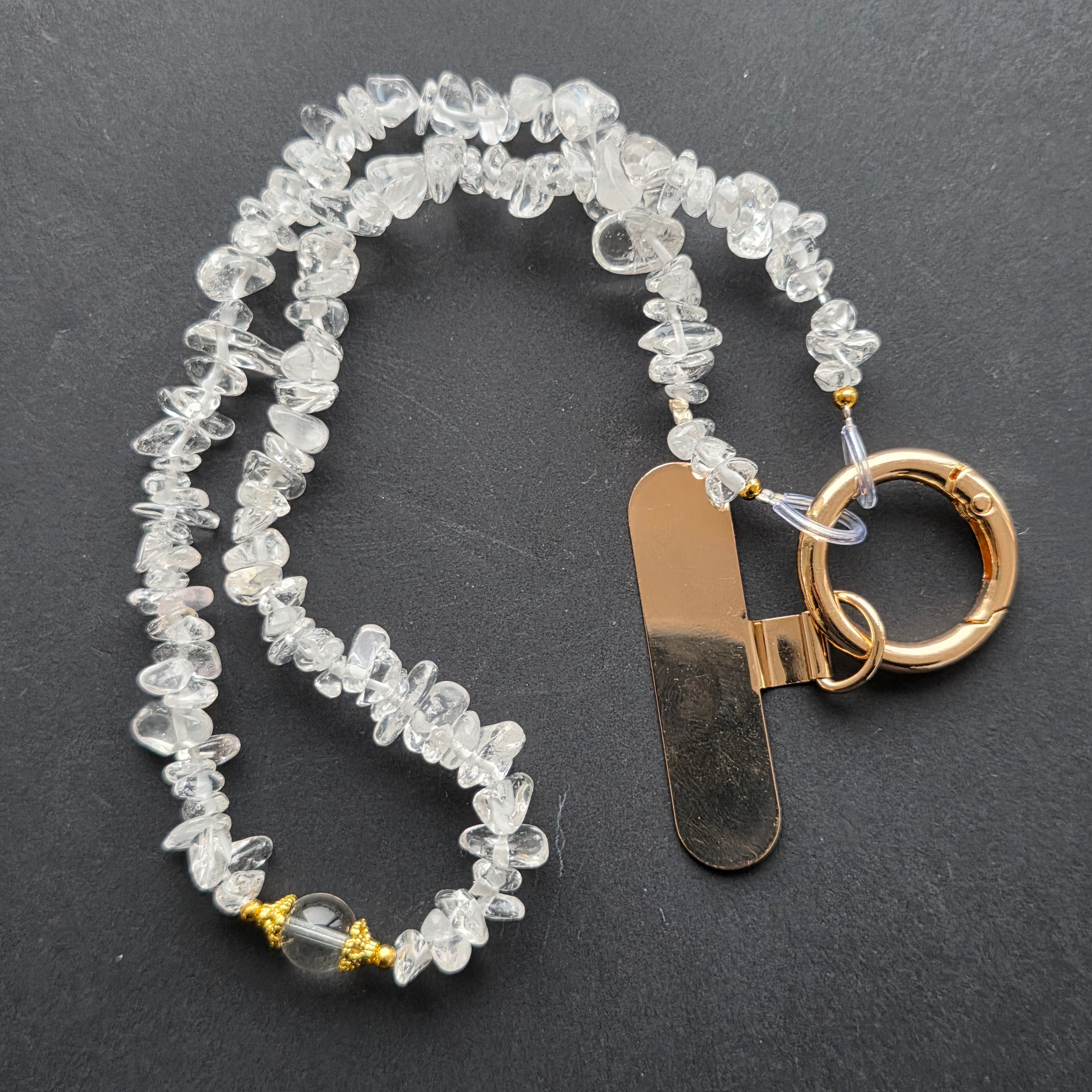 Верижката за телефон от безцветен кварц е аксесоарът, който съчетава естествената елегантност на кристалите с модерната полезност на предмет, използван ежедневно. Изработена от автентични чипсове прозрачен кварц, всяко парче отразява светлината с малки проблясъци, като замръзнали капки, които дискретно танцуват при всяко движение.