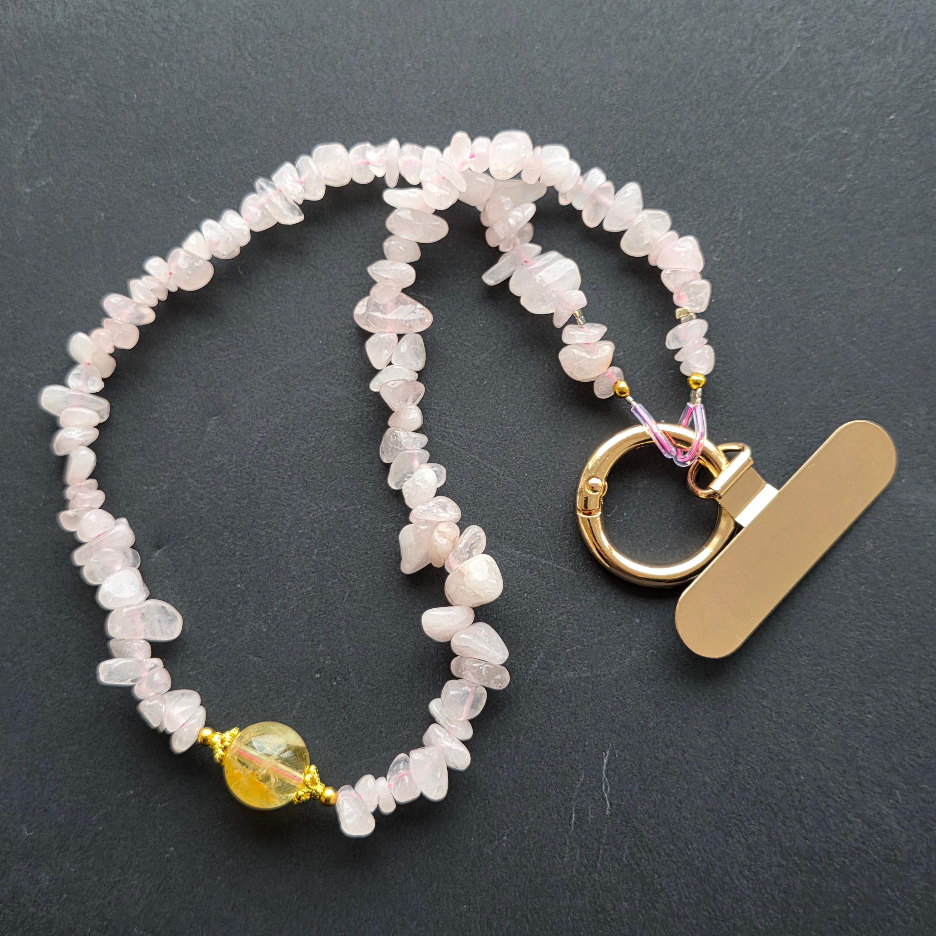Розовият кварц е камъкът на нежността и емоционалния баланс, известен със своята деликатна и успокояваща енергия и способността да внесе повече хармония в ежедневието. Естествените чипсове имат пастелни, светли оттенъци, които добавят на телефона женствен, топъл и елегантен акцент.