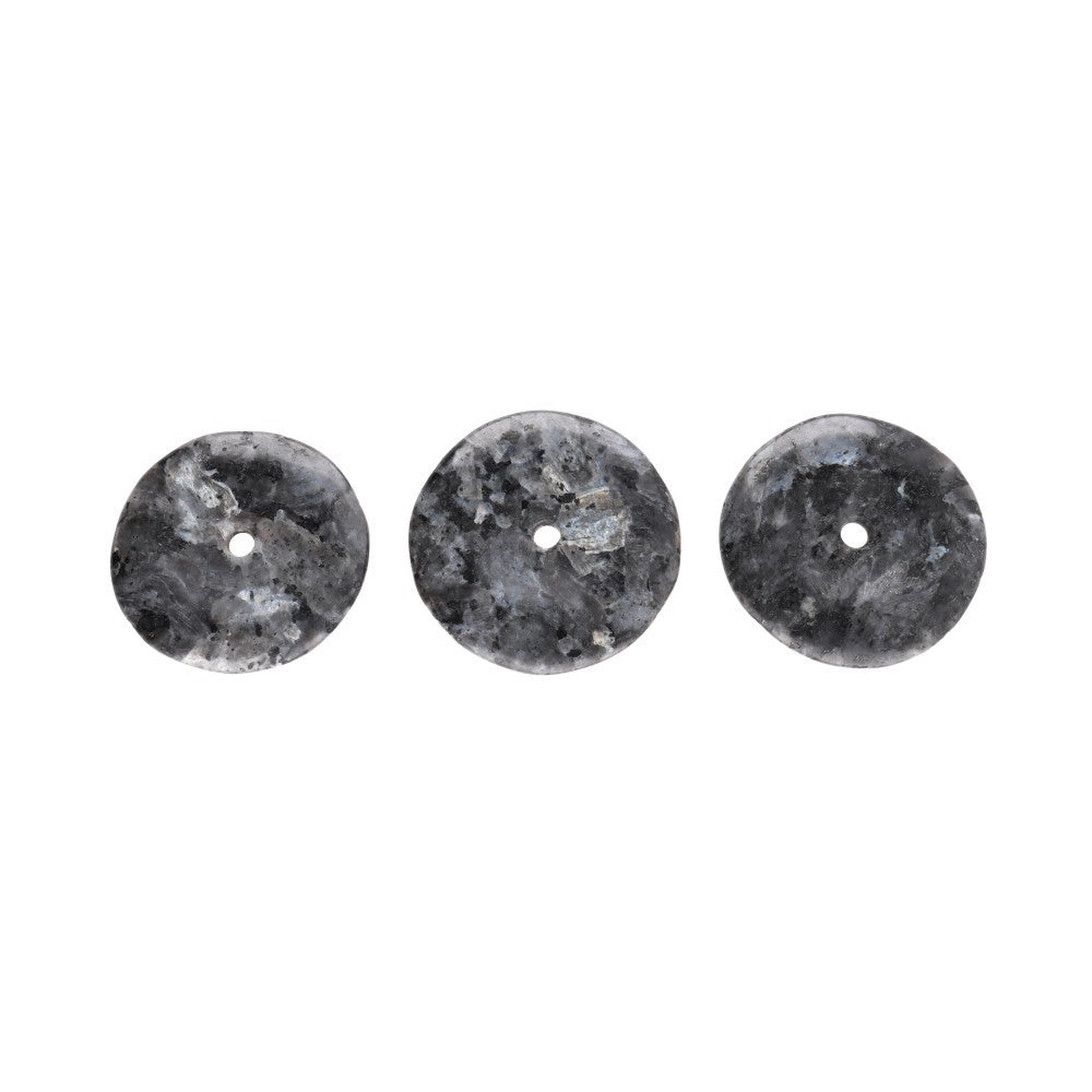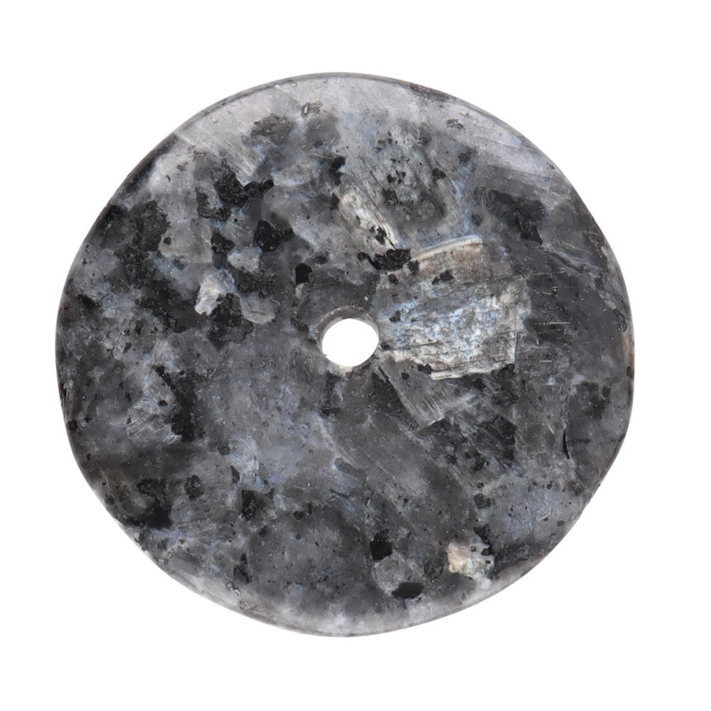 Висулката от камък ларвикит в формата на донът L се отличава със своите сребристо-сини отблясъци, които напомнят за лунната светлина, отразена във водата.