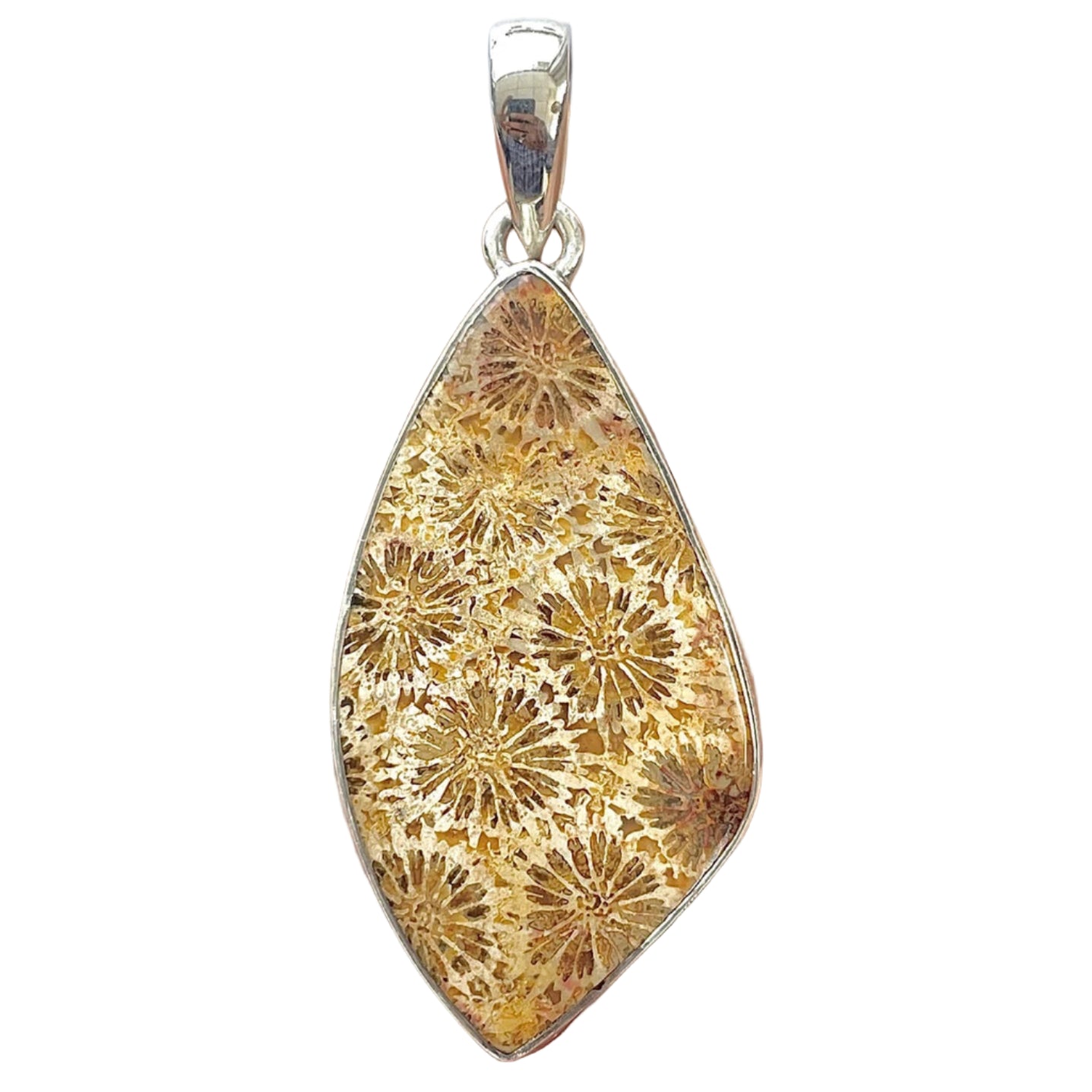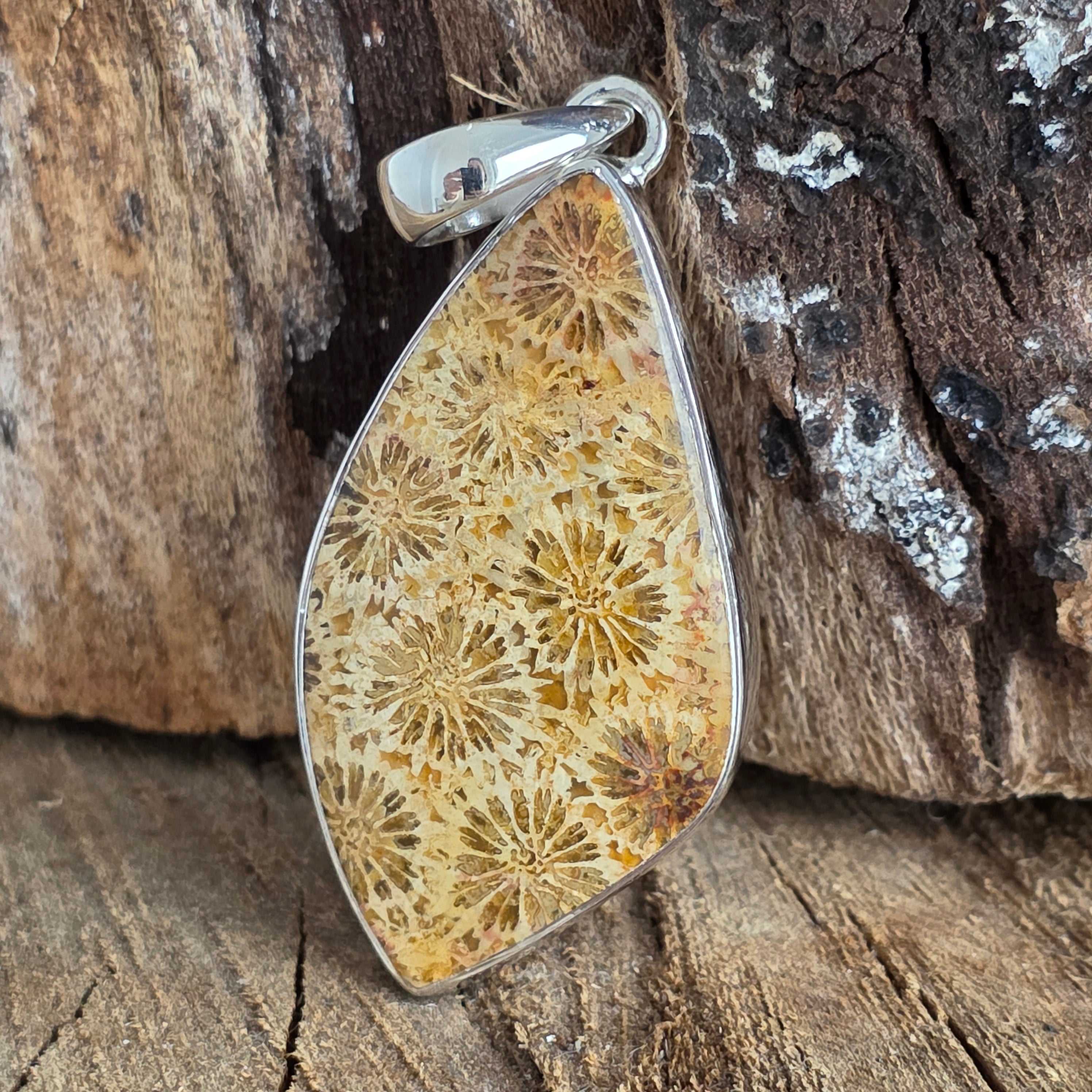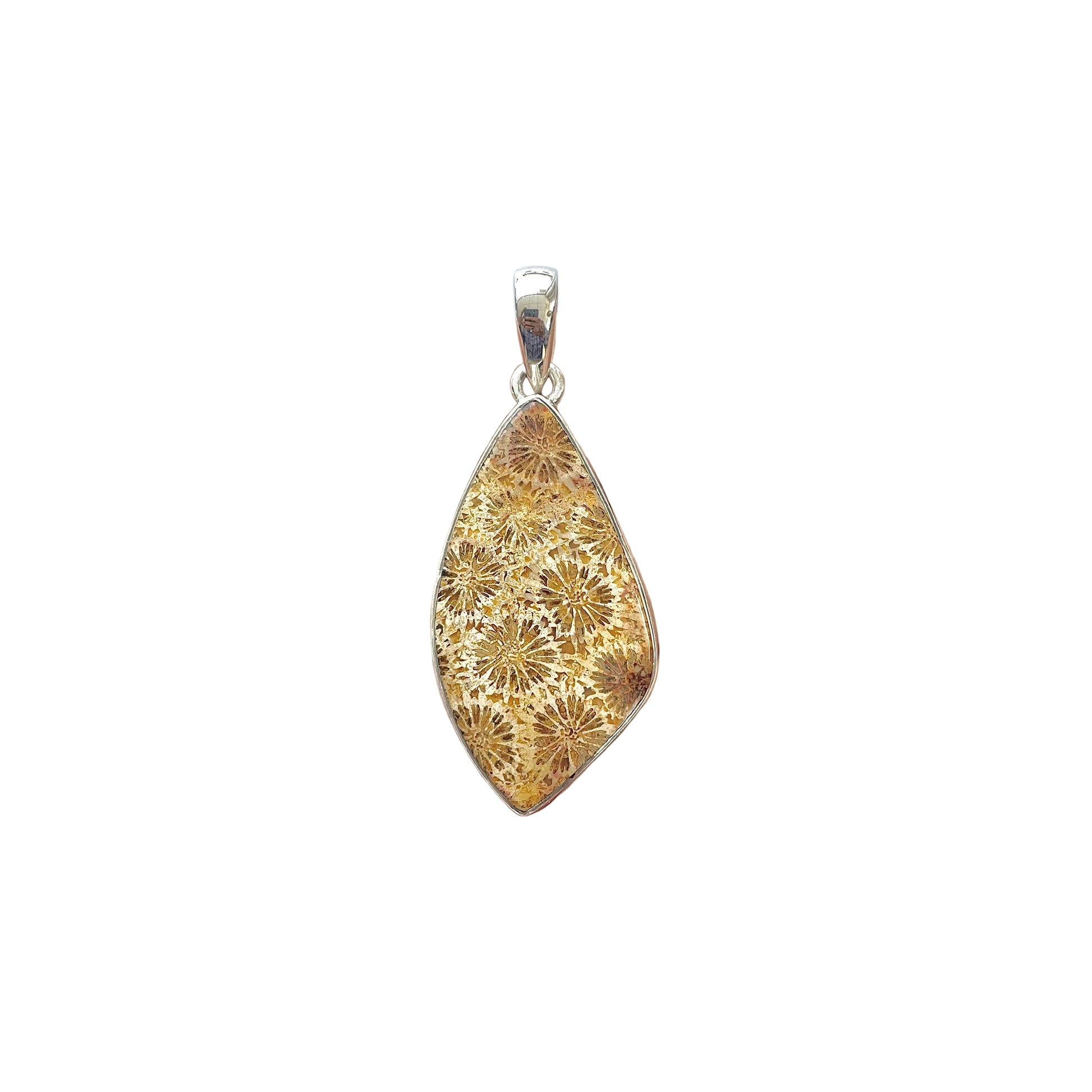Тази уникална висулка от вкаменен корал е прозорец към миналото, пазещ в себе си деликатните следи на морските колонии, превърнати от времето в камък. Натуралните флорални модели, формирани преди милиони години, създават органична красота, която изглежда като изсечена от самата природа.