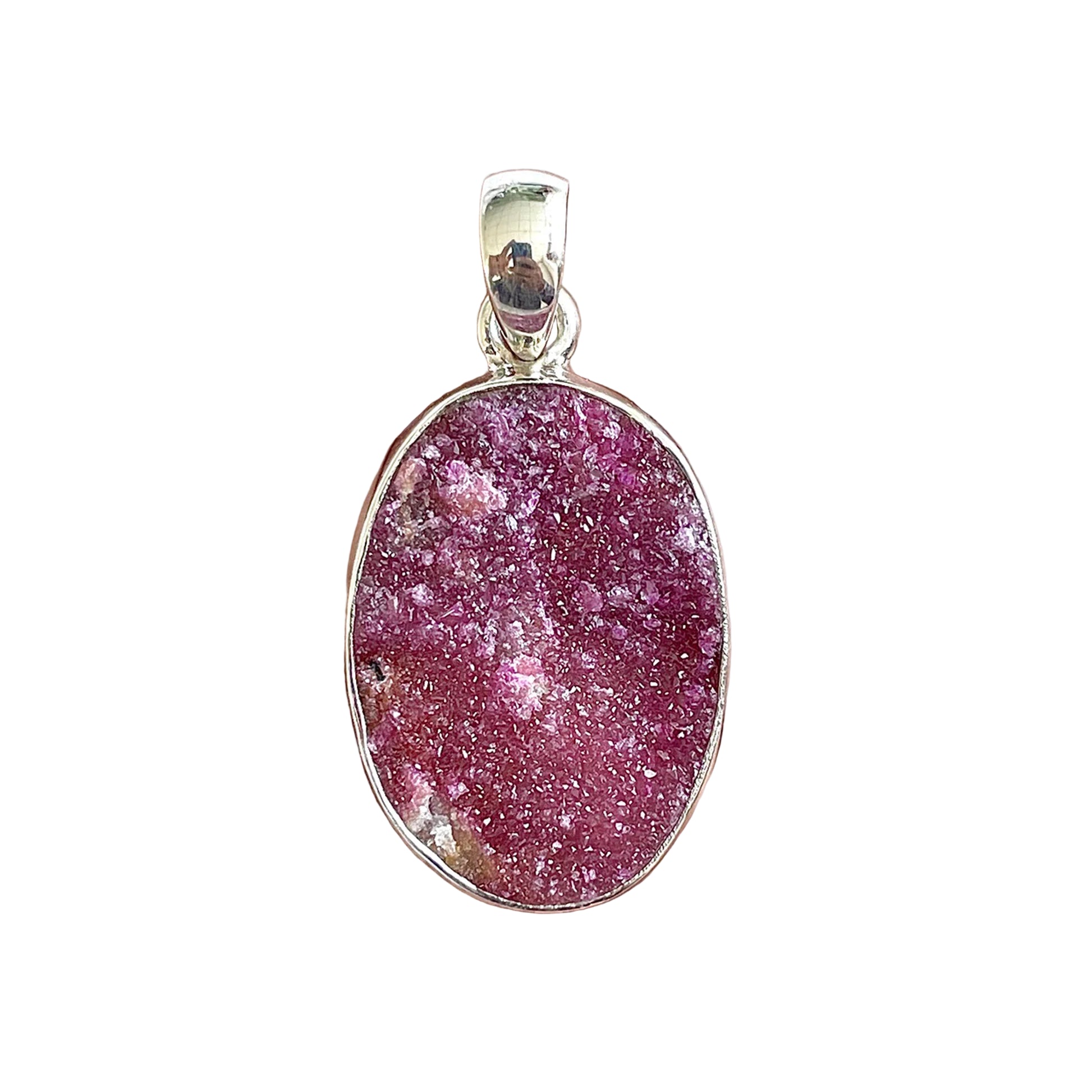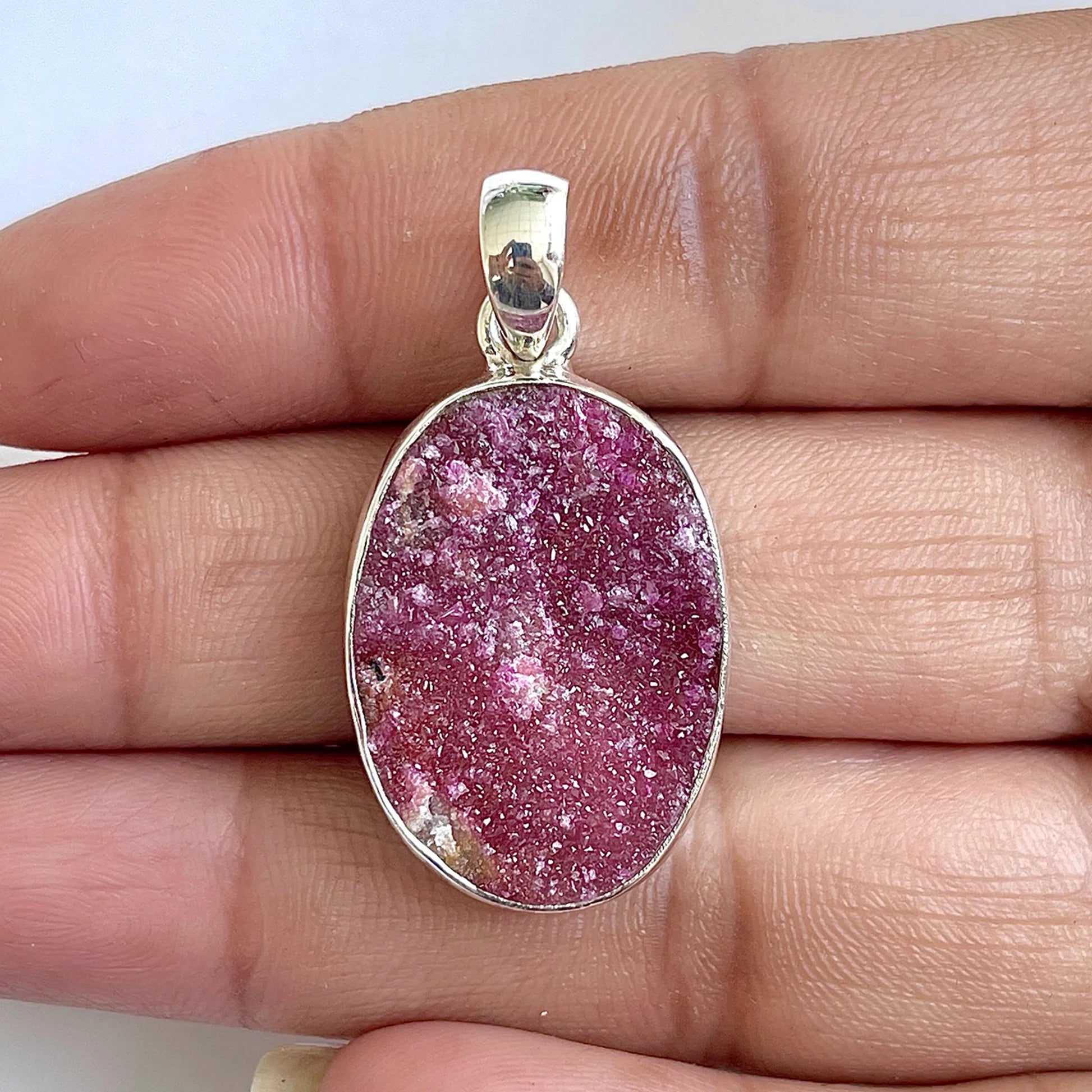 Тази единствена по рода си висулка от кобалтов калцит привлича окото със своите наситено розови, искрящи кристали, които изглеждат поръсени със звезден прах. Естествената му текстура разкрива суровата красота на камъка, запазвайки автентичния чар на рядка друза.