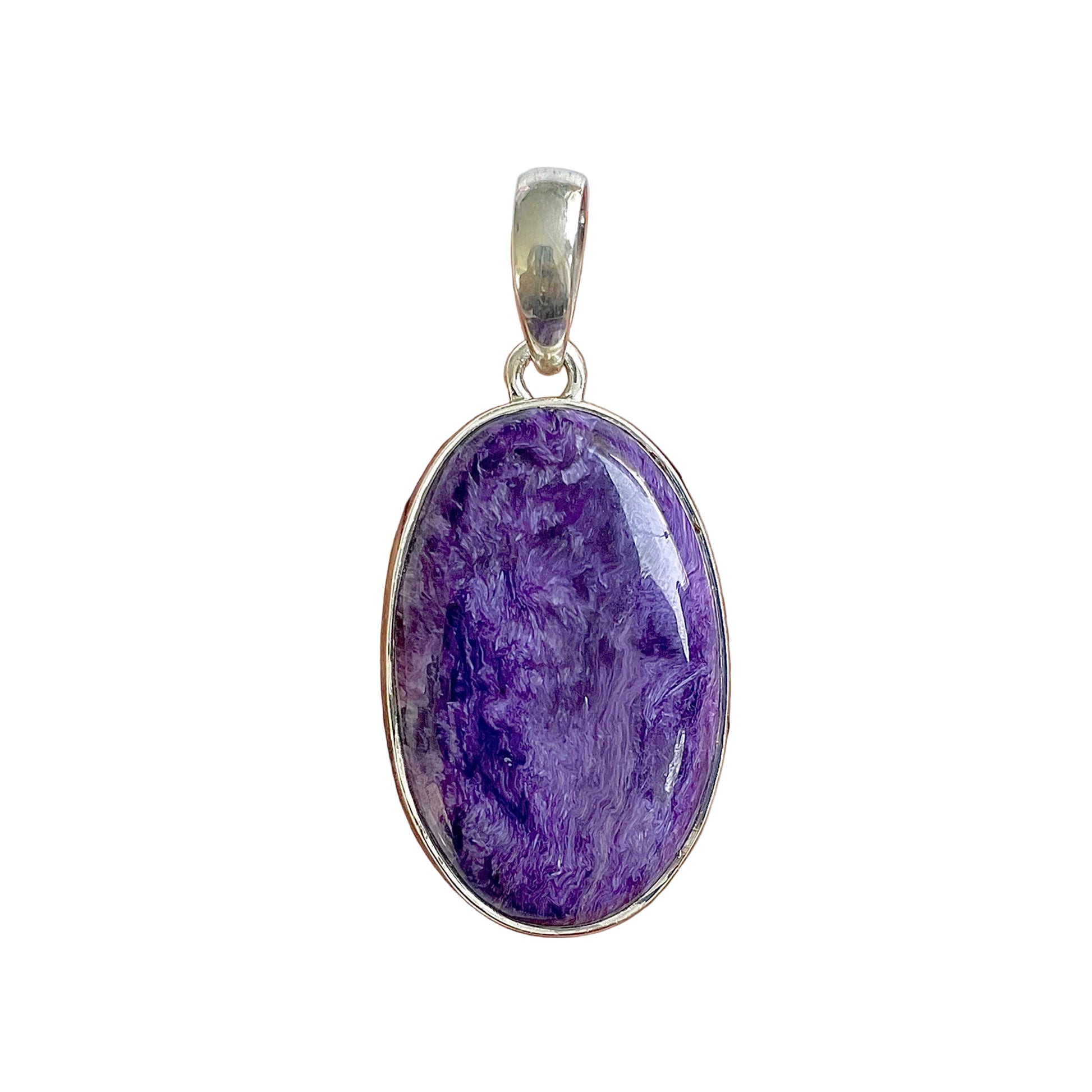 Тази елегантна висулка, ръчно изработена от 925 сребро, подчертава рядката красота на естествен чароит, камък с очарователни нюанси на лилаво и сребърни отблясъци, които сякаш танцуват на светлината. Изрязано в класическа овална форма, чароитът се превръща в център на изящно и мощно бижу.