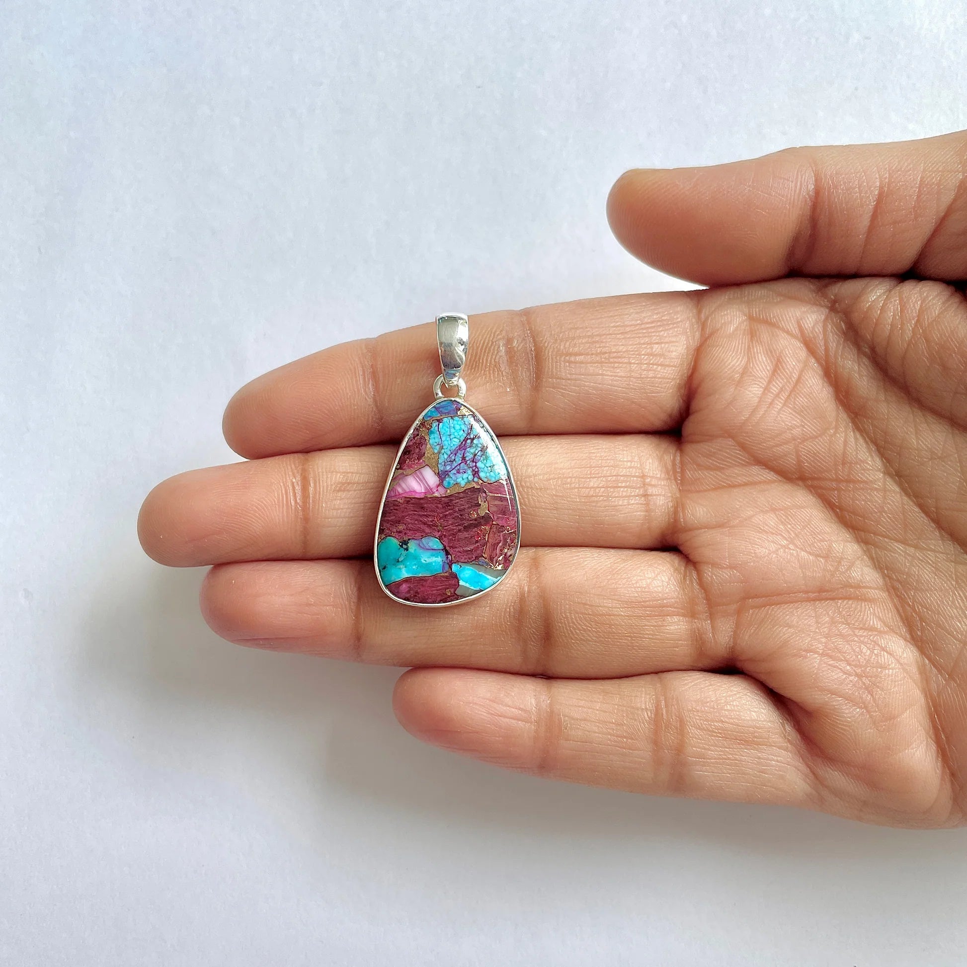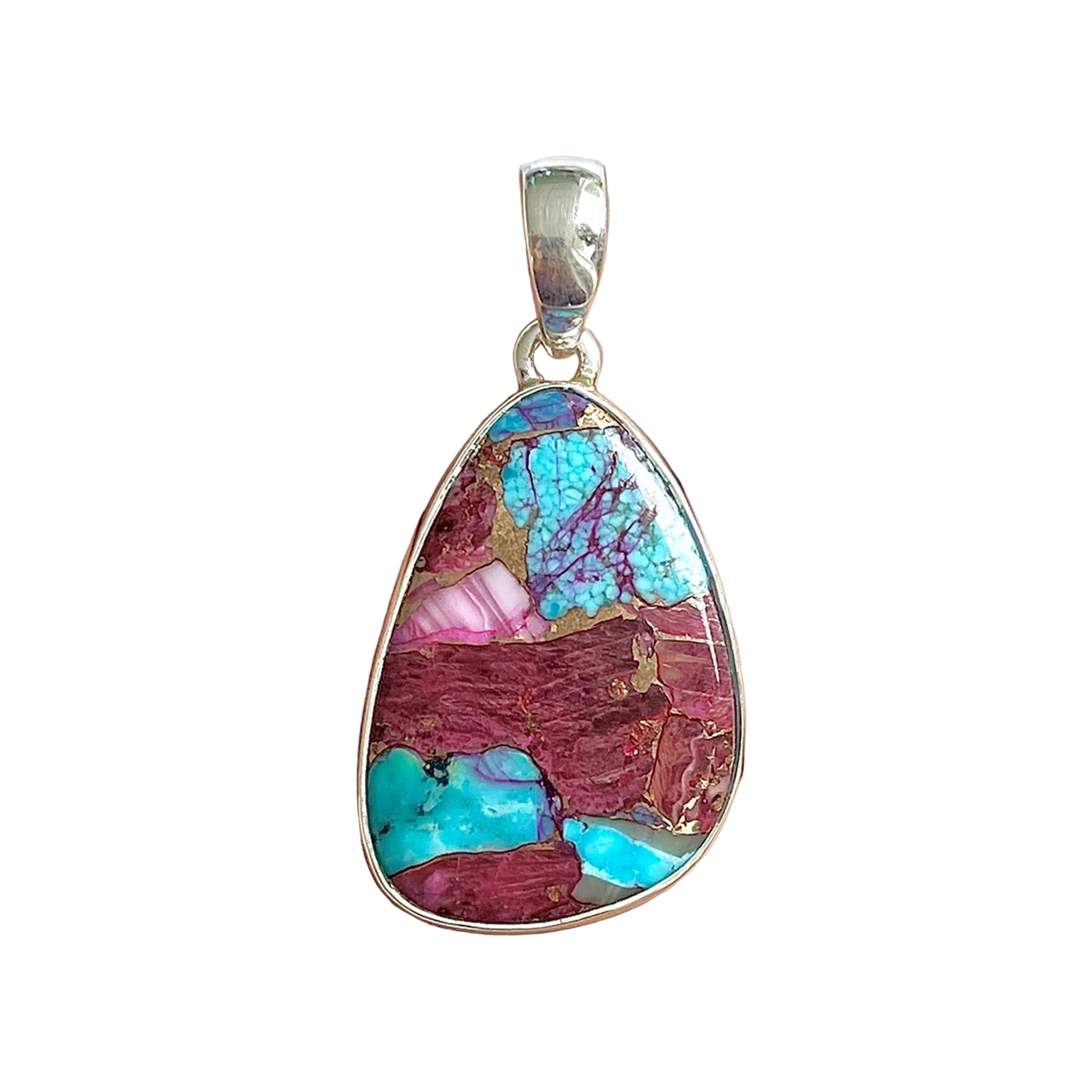 Този уникален медальон обединява две съкровища на природата – Бодлива стрида и Тюркоазът – в впечатляваща цветна мозайка. Лилавите, розовите и оранжевите нюанси на черупката се преплитат с дълбокото синьо на тюркоазеното, създавайки живо бижу, напомнящо на срещата между морето и залеза.