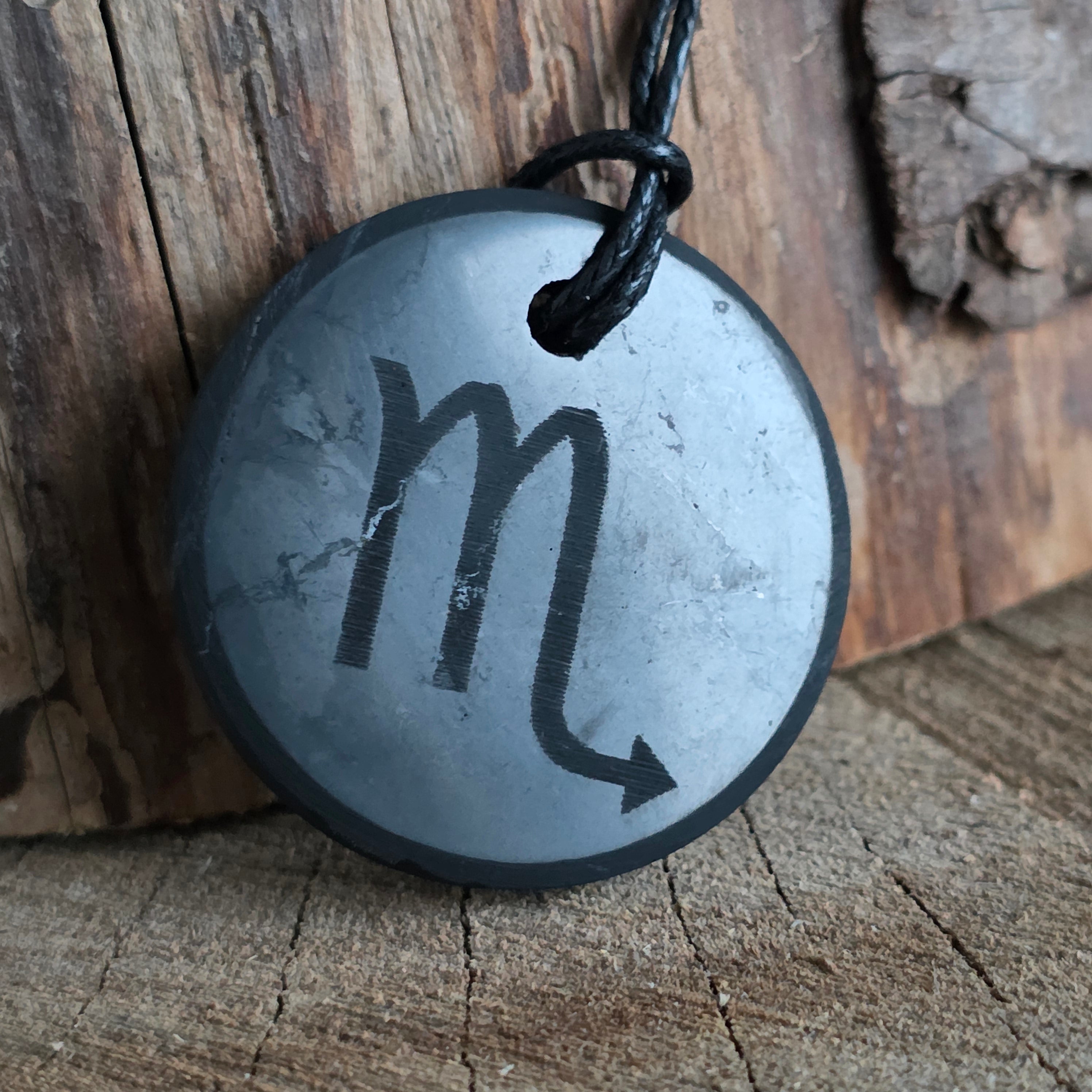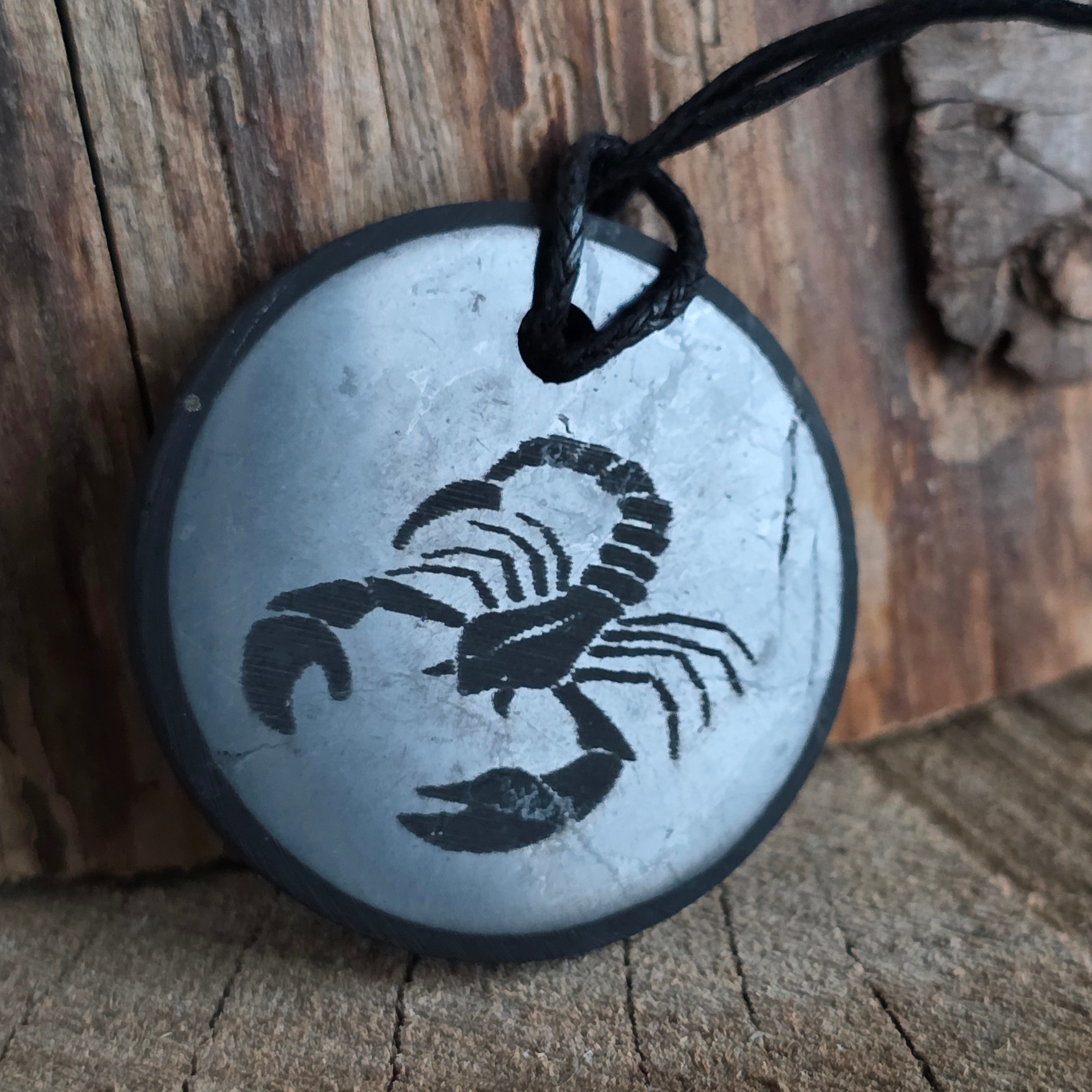 - Форма на висулката: кръгла, гравирана със символа на зодия Скорпион от двете страни