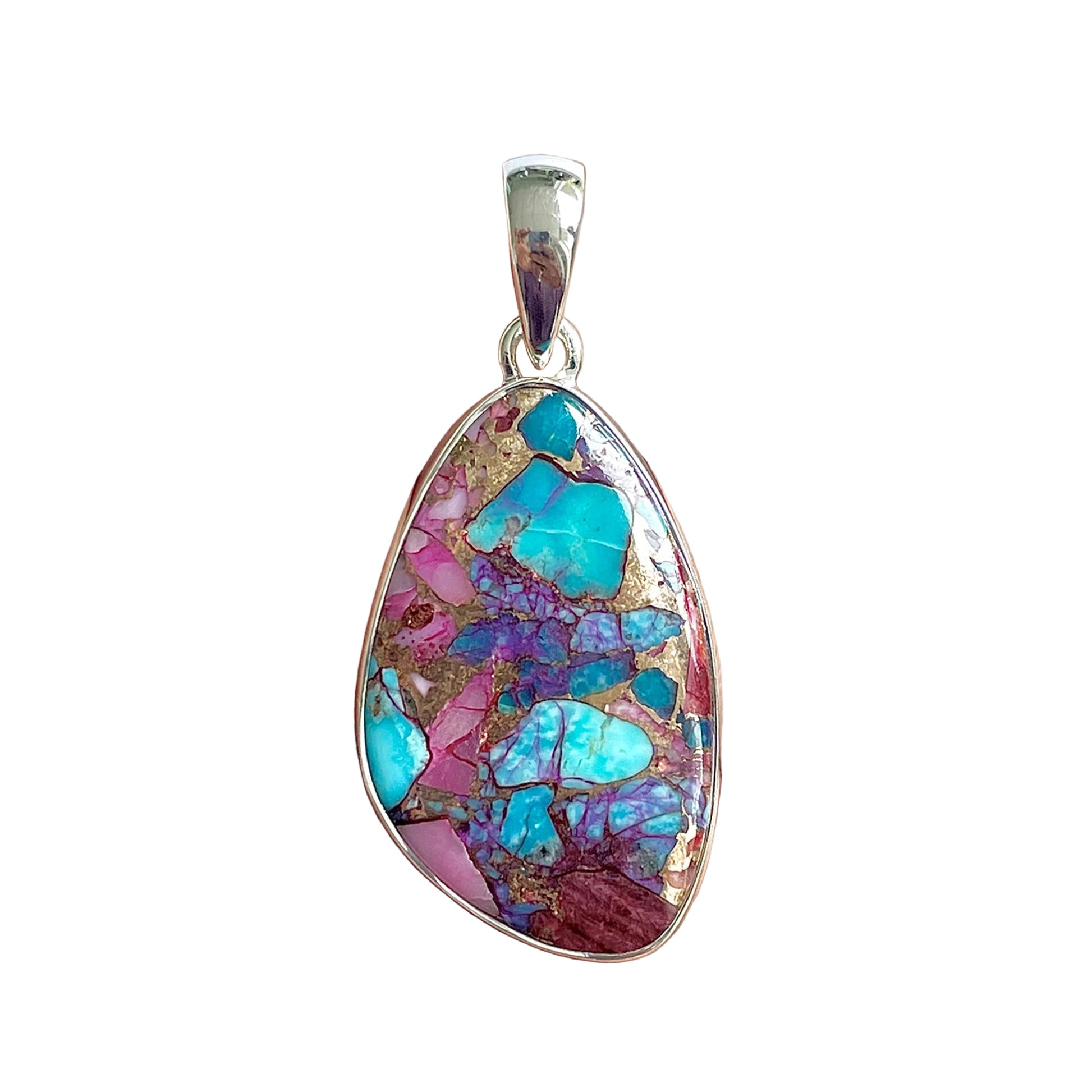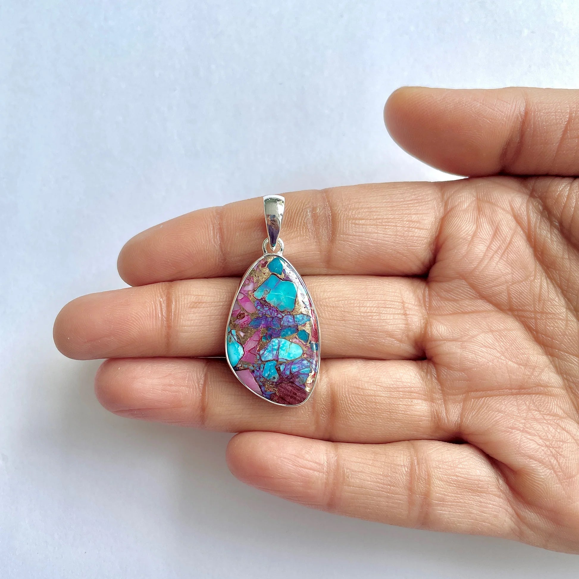 Тази уникална висулка събира две съкровища на природата – Spiny Oyster и Тюркоаз – в зрелищен цветен мозаик. Нюансите на виолетово, розово и оранжево на мидата се преплитат с наситеното синьо на тюркоаза, създавайки бижу, пълно с живот, което напомня за срещата между морето и залеза.