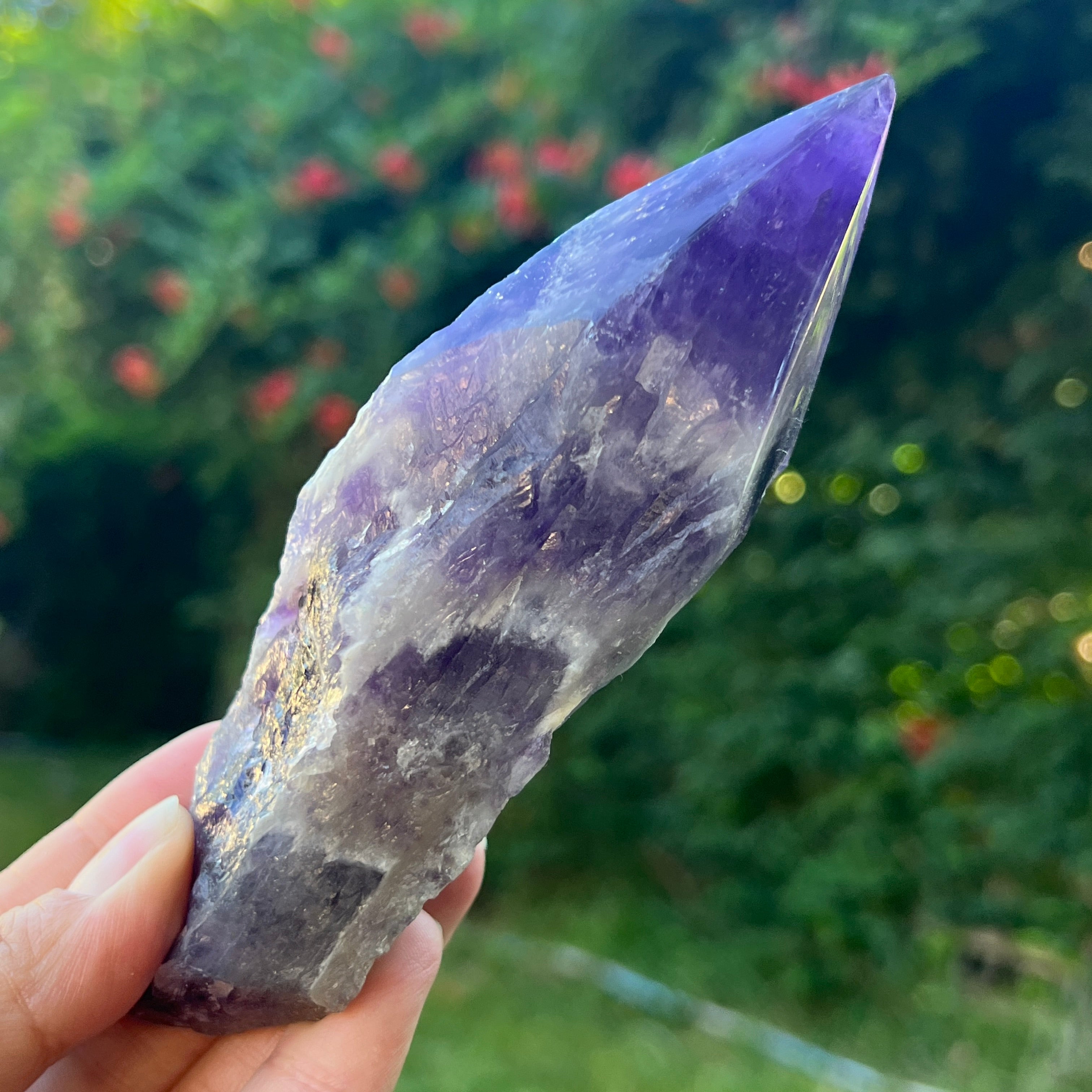 Аметистът шеврон е известен със свързването си с коронната и третото око чакри, като усилва интуицията и способността за вземане на решения.