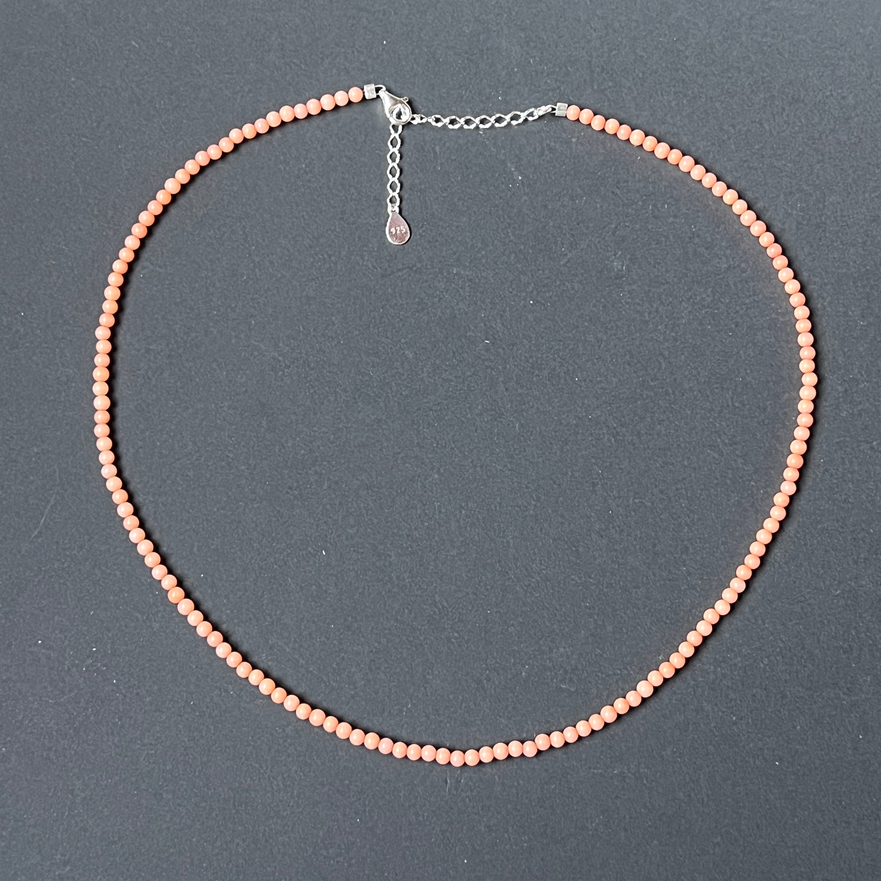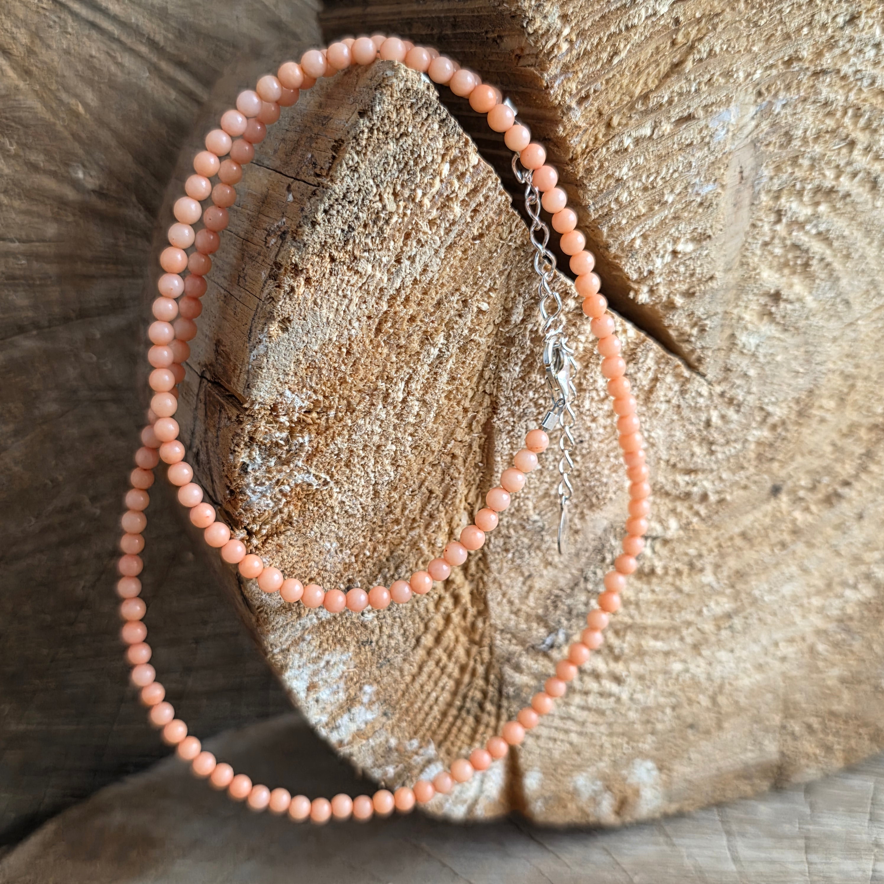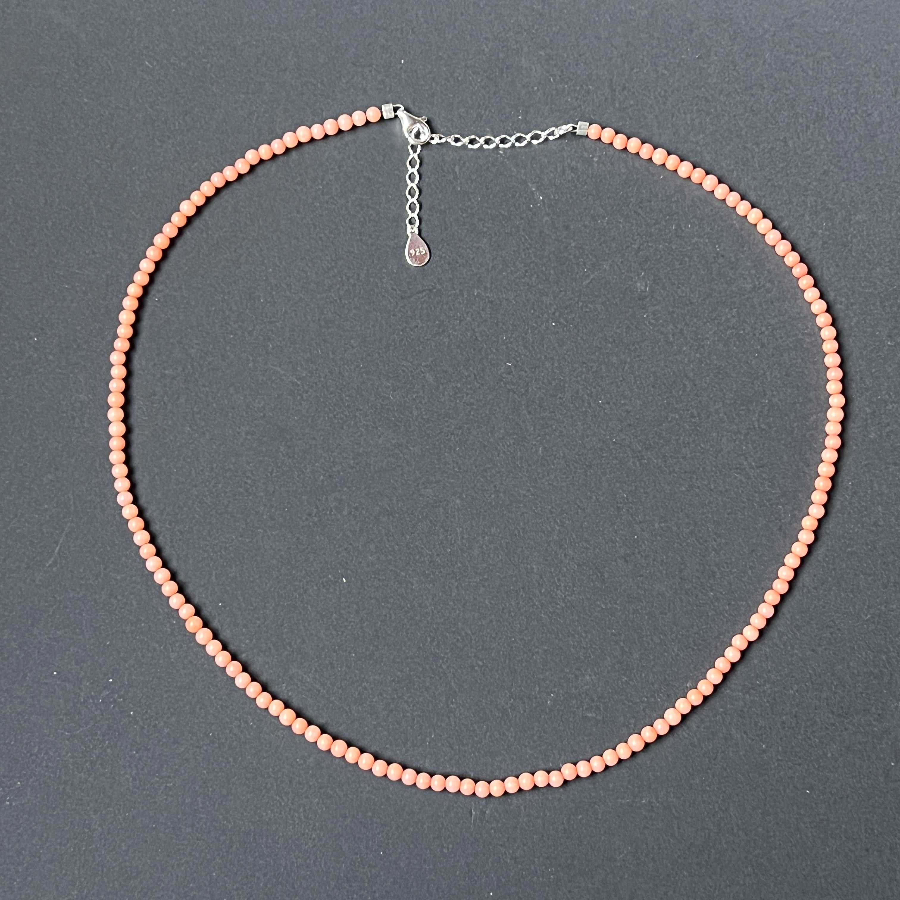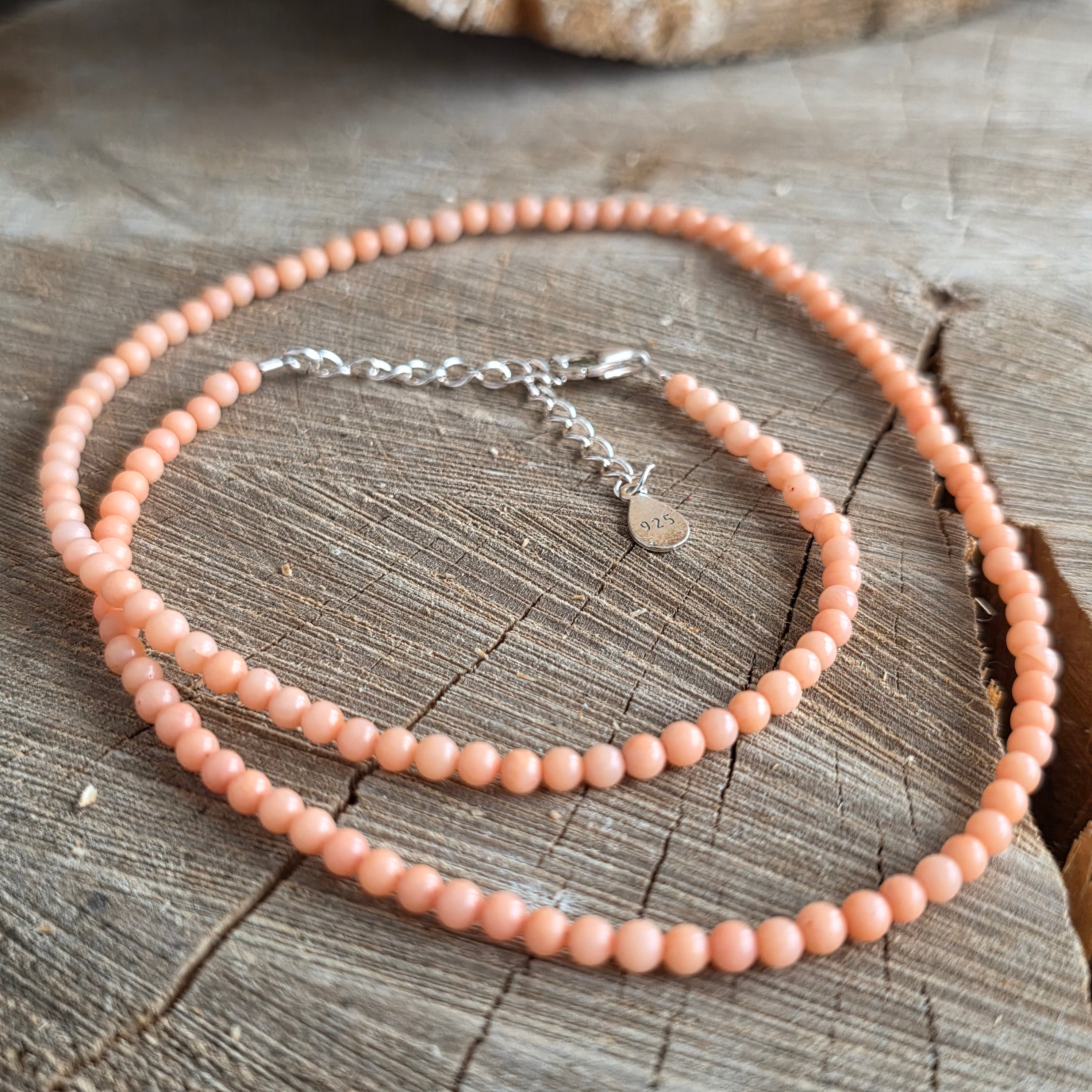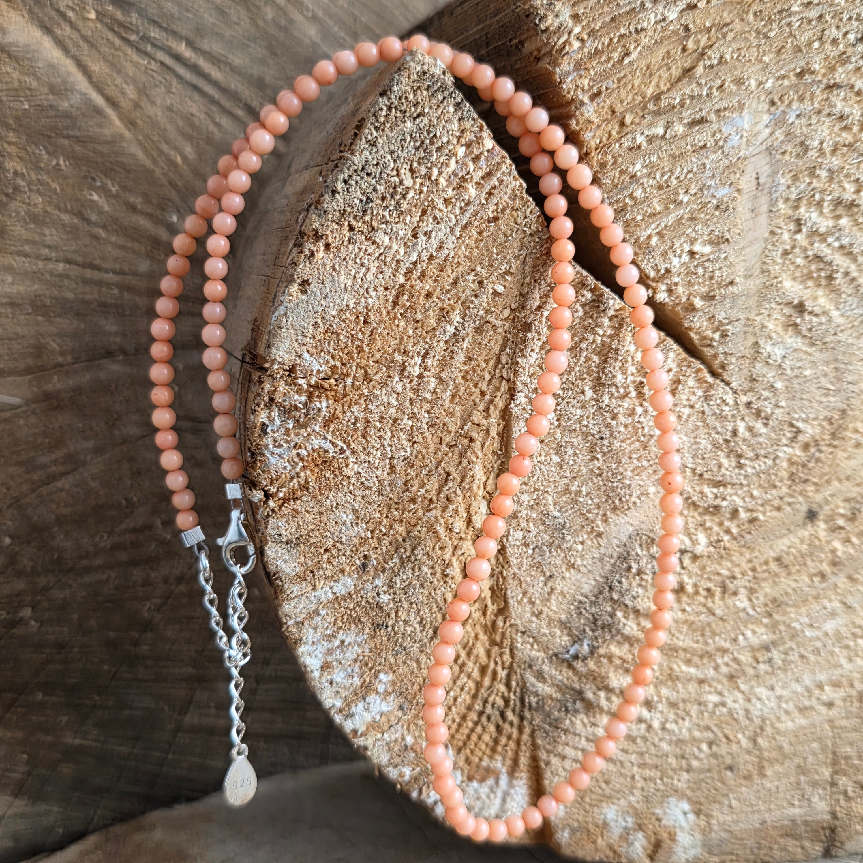 Колие като полъх от дълбините – меко, нежно и с топло, почти носталгично излъчване. Розов корал, полиран в 3 mm прозрачни сфери, танцува по нишката като забравен спомен от морето, с всичките му истории за живот, прераждане и любов.