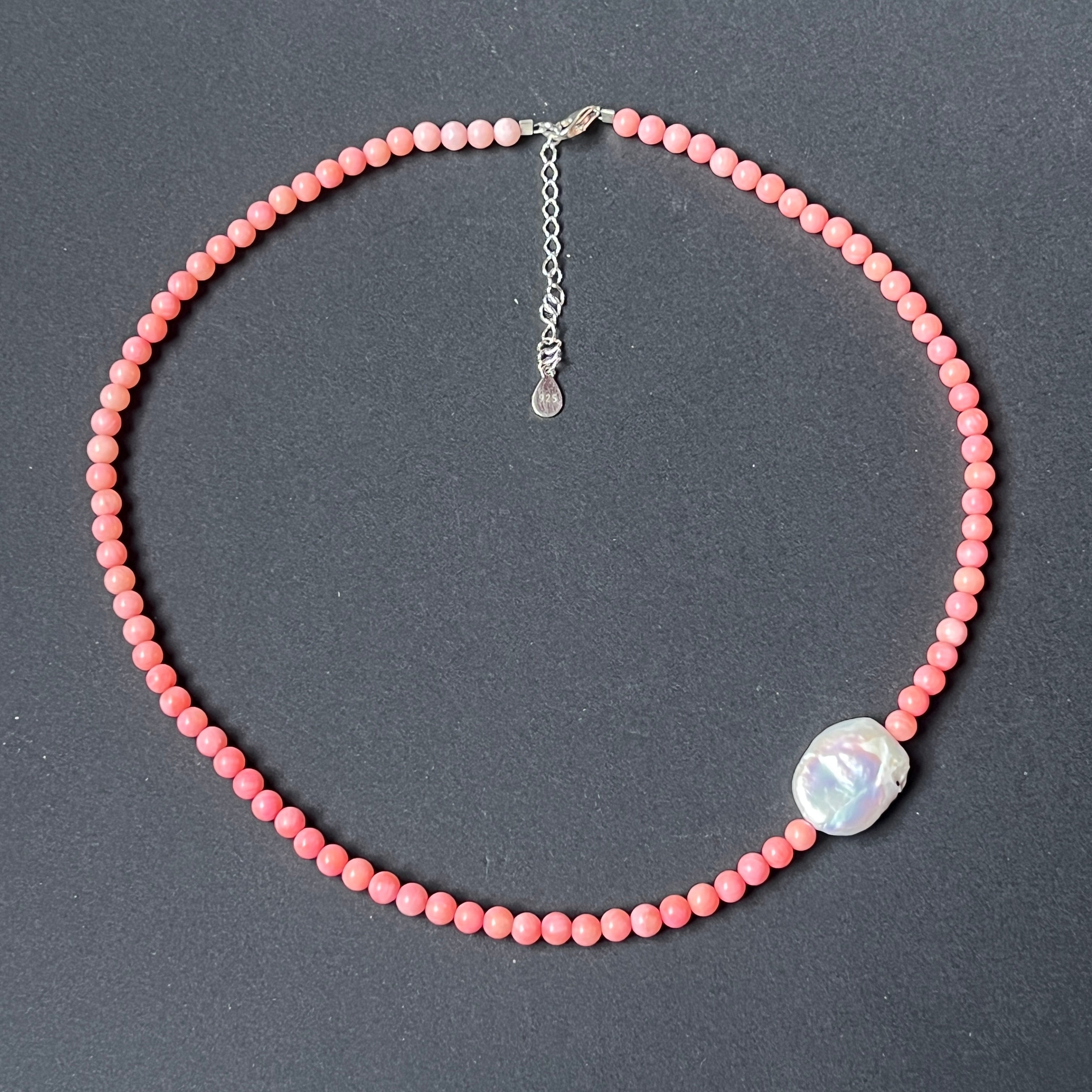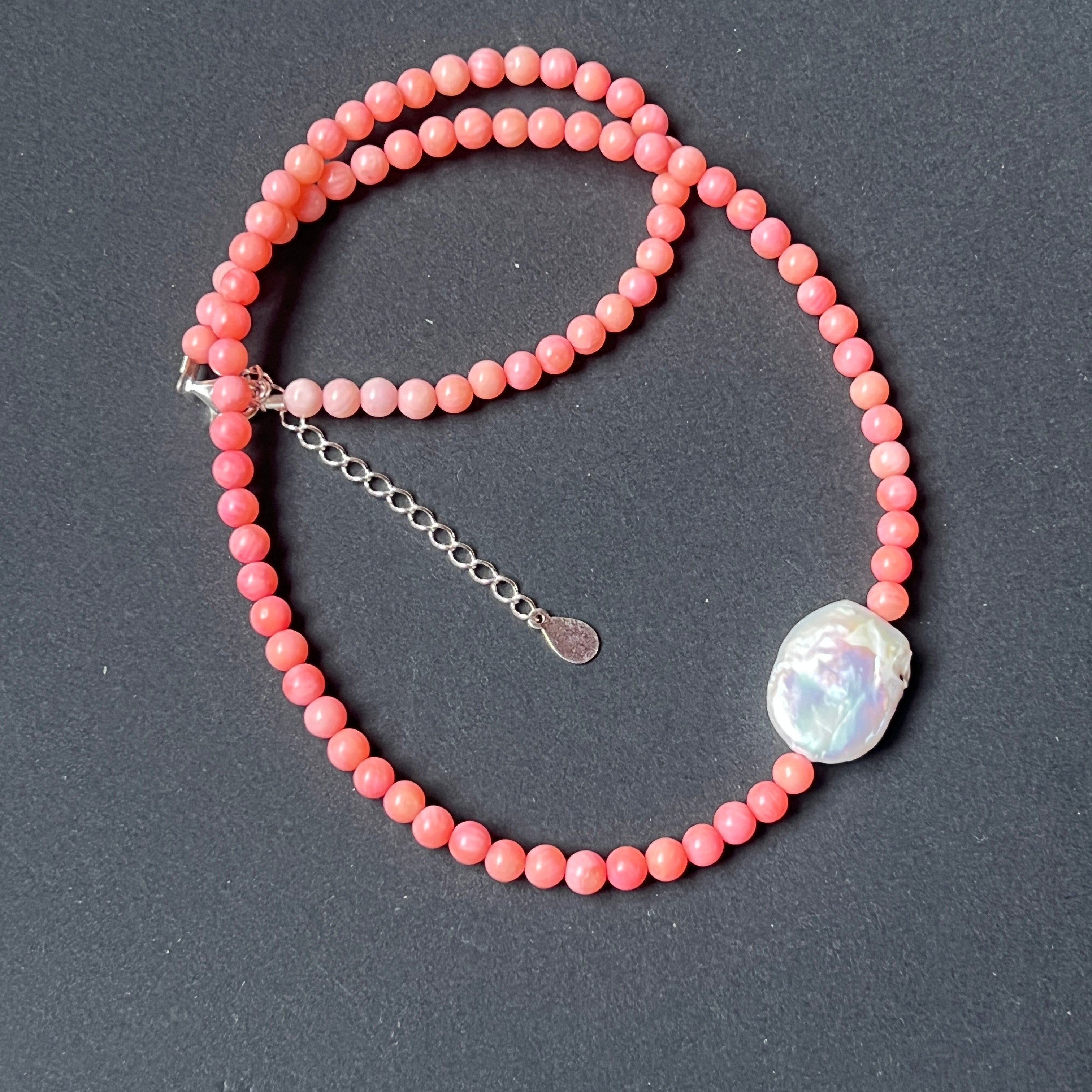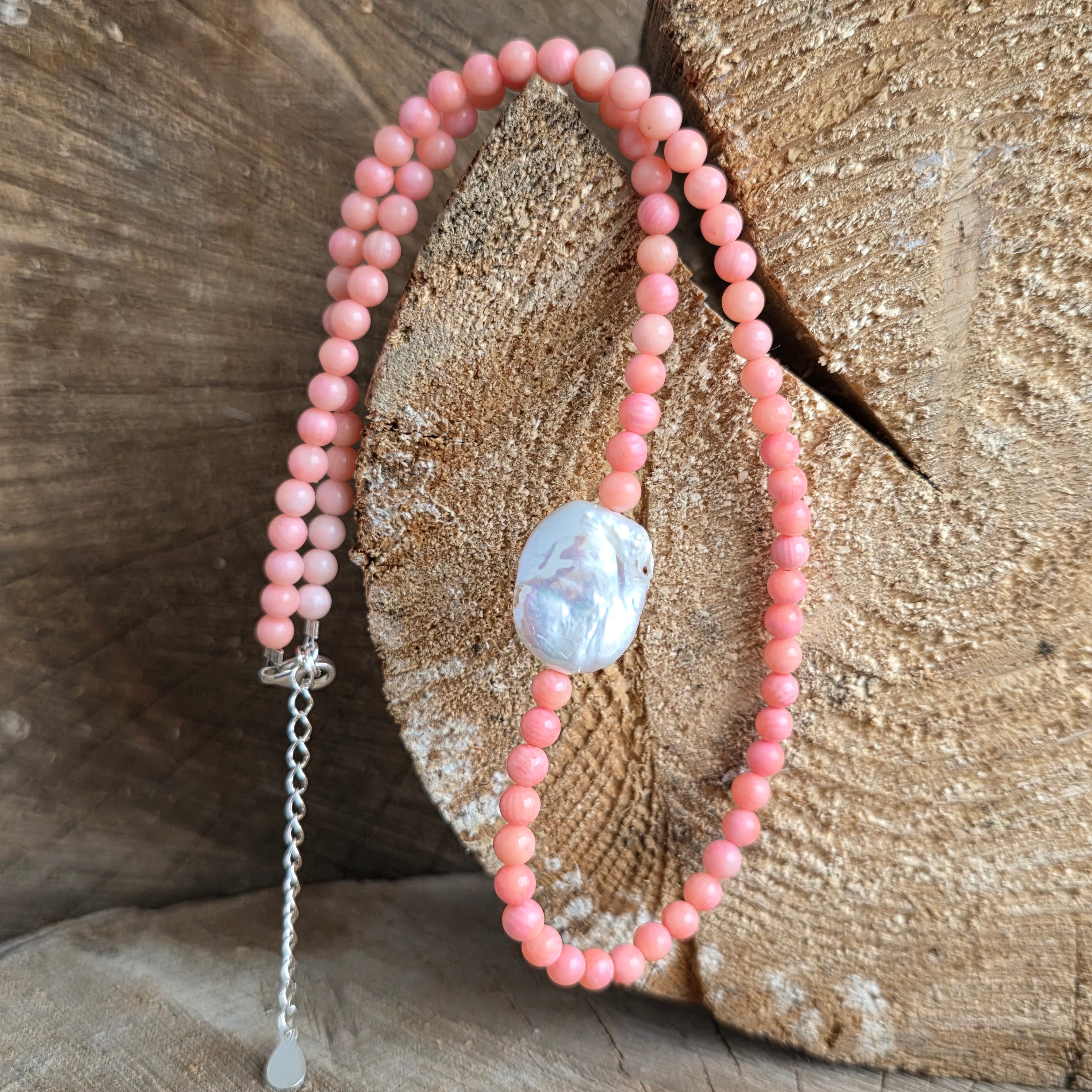 Розов корал, в фини сфери от 4 мм, тече по огърлицата като линеарна поезия – топли, копринени тонове, които предизвикват красотата на морето в зори. Коралът е камъкът на нежната жизненост, творческа чувствителност и сила, която се изразява чрез благодат.
