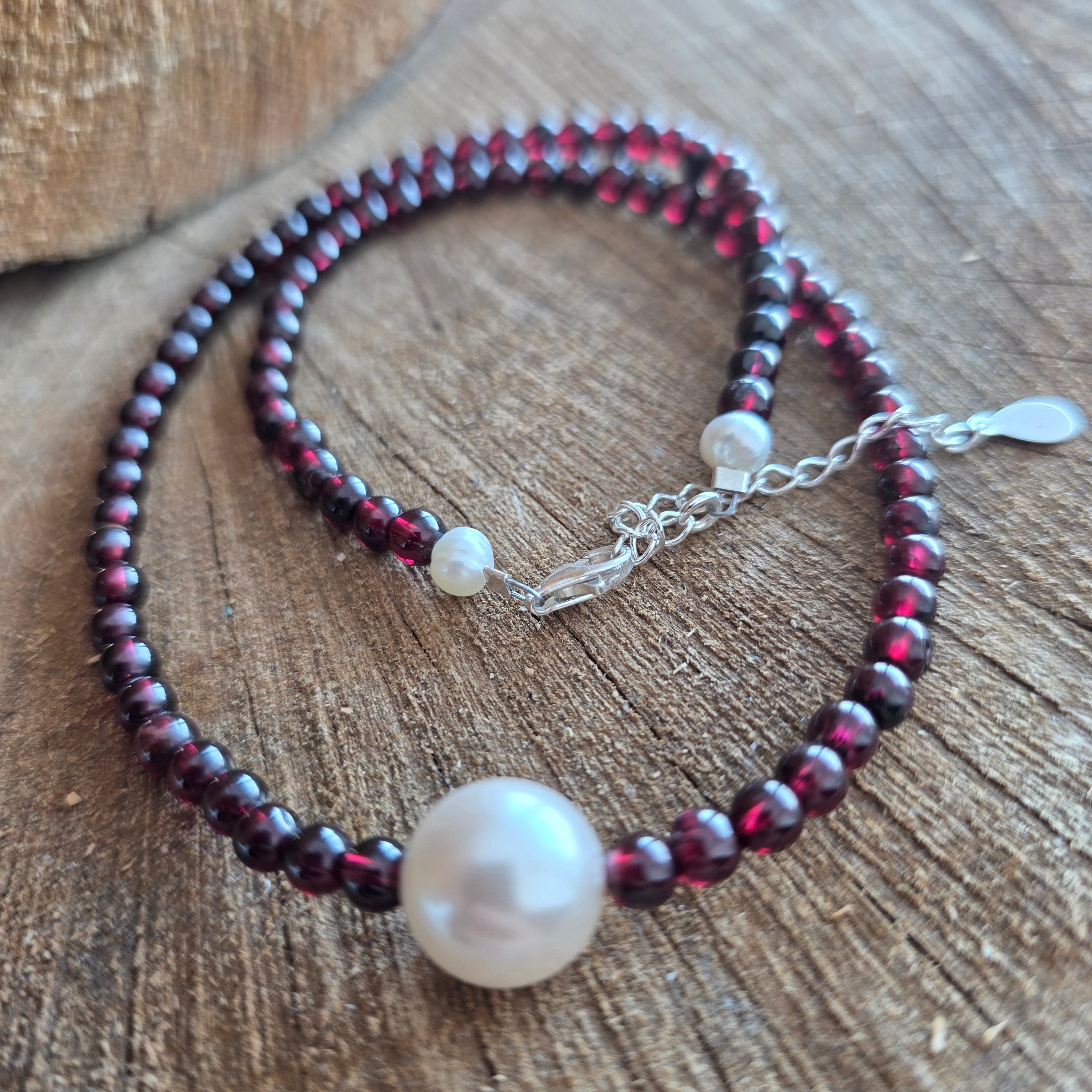 Материали: естествен тъмен оранжев гранат, фасетирани мъниста 3 мм, сребро 925