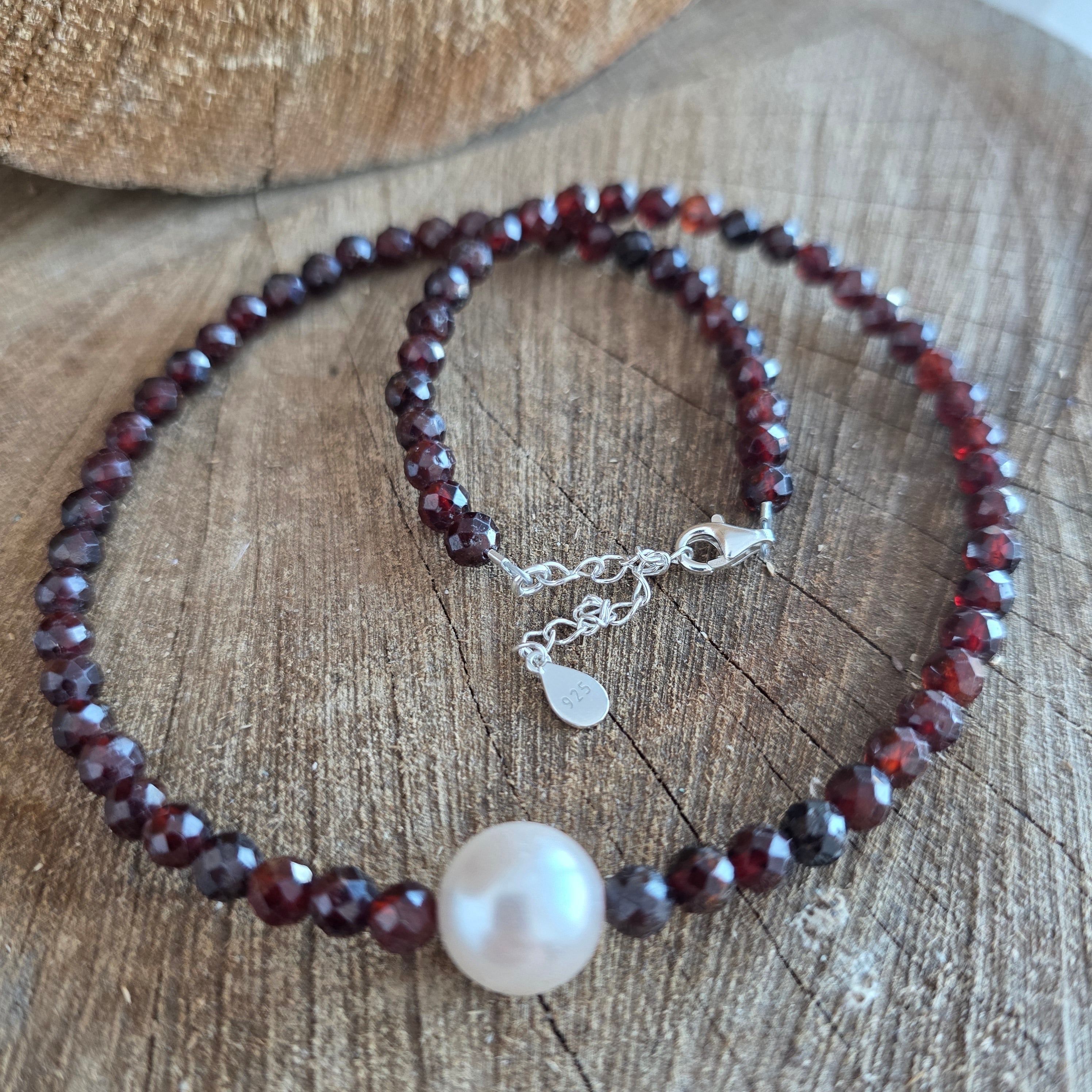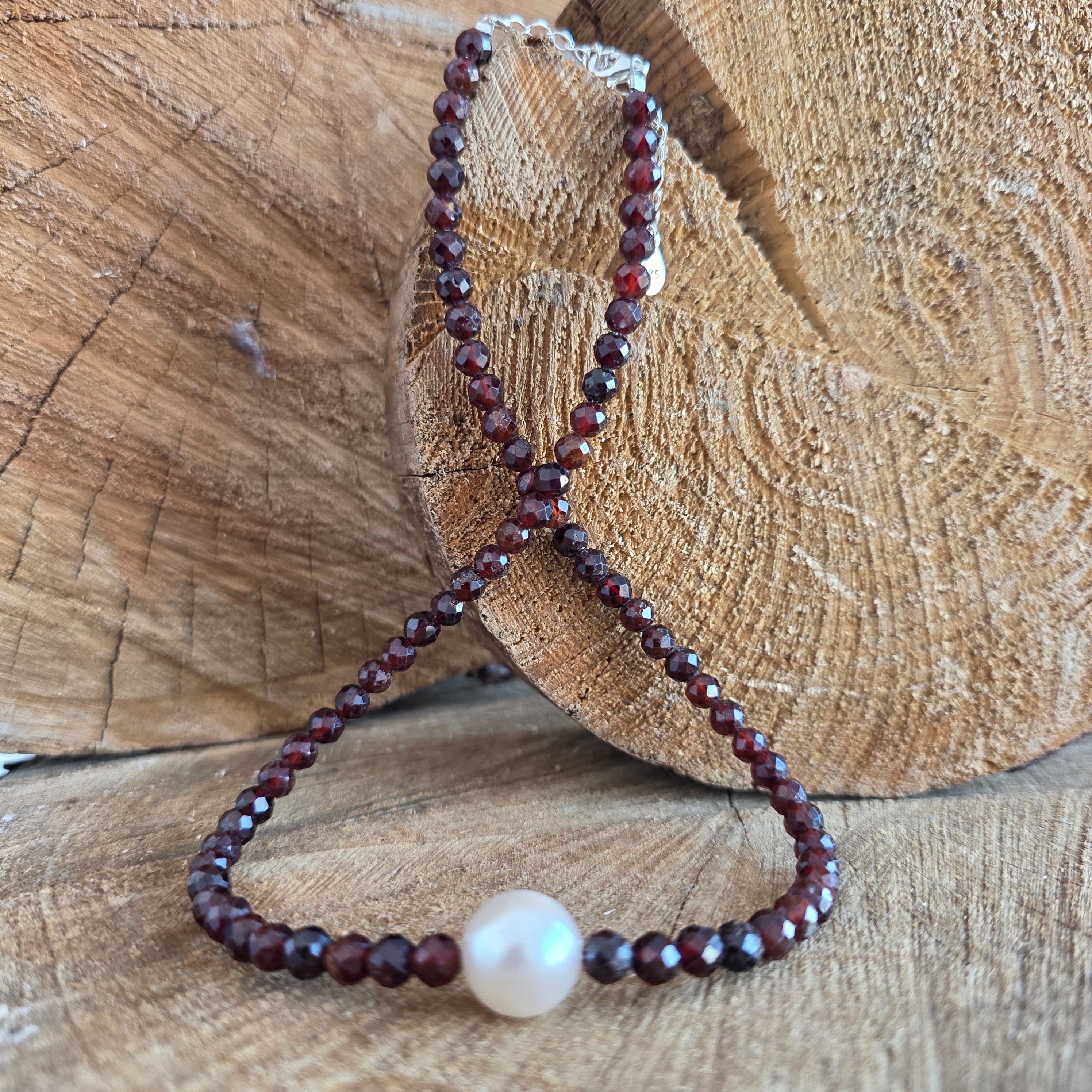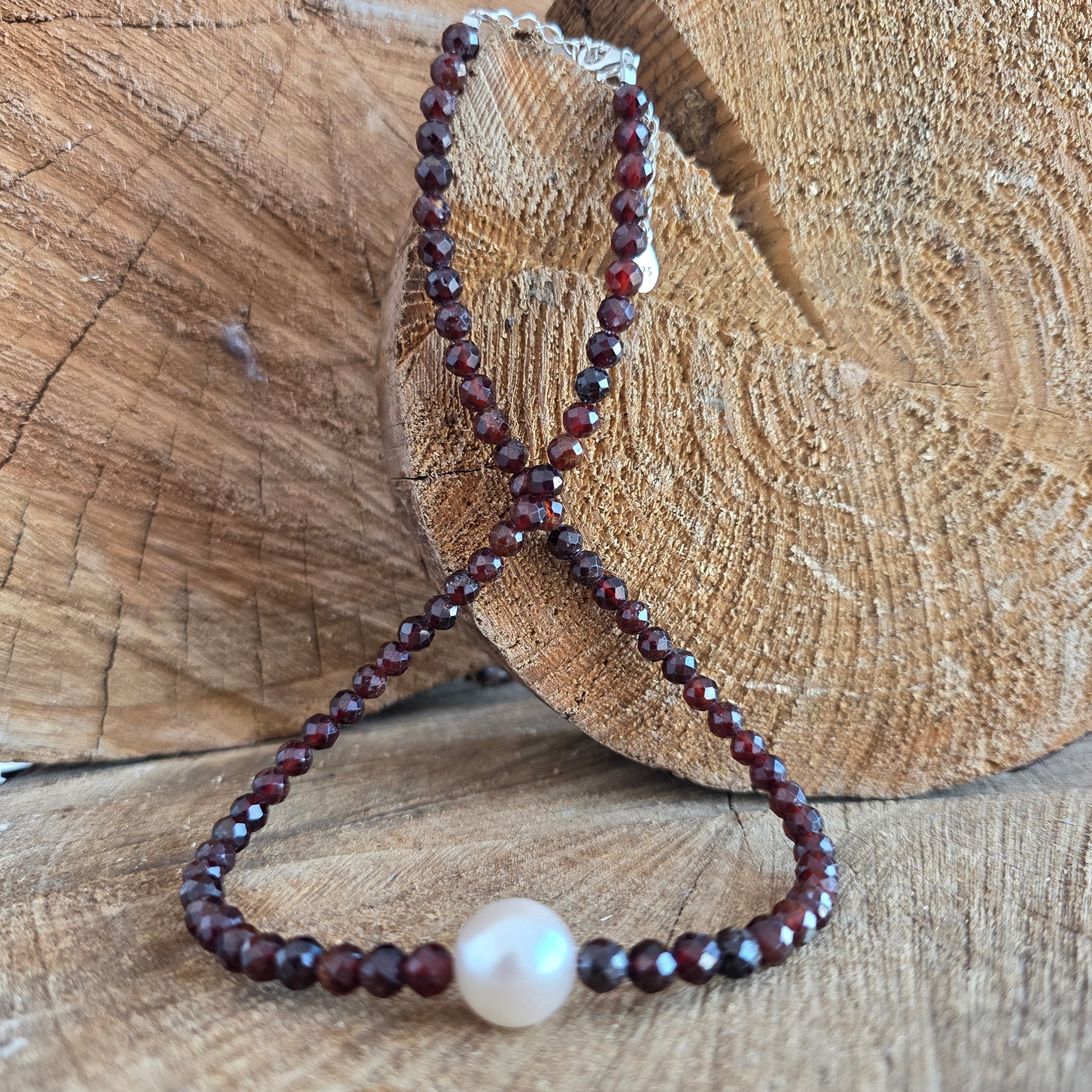 Материали: натурален тъмночервен гранат, мъниста 4 мм, сребро 925, перла 1 см
