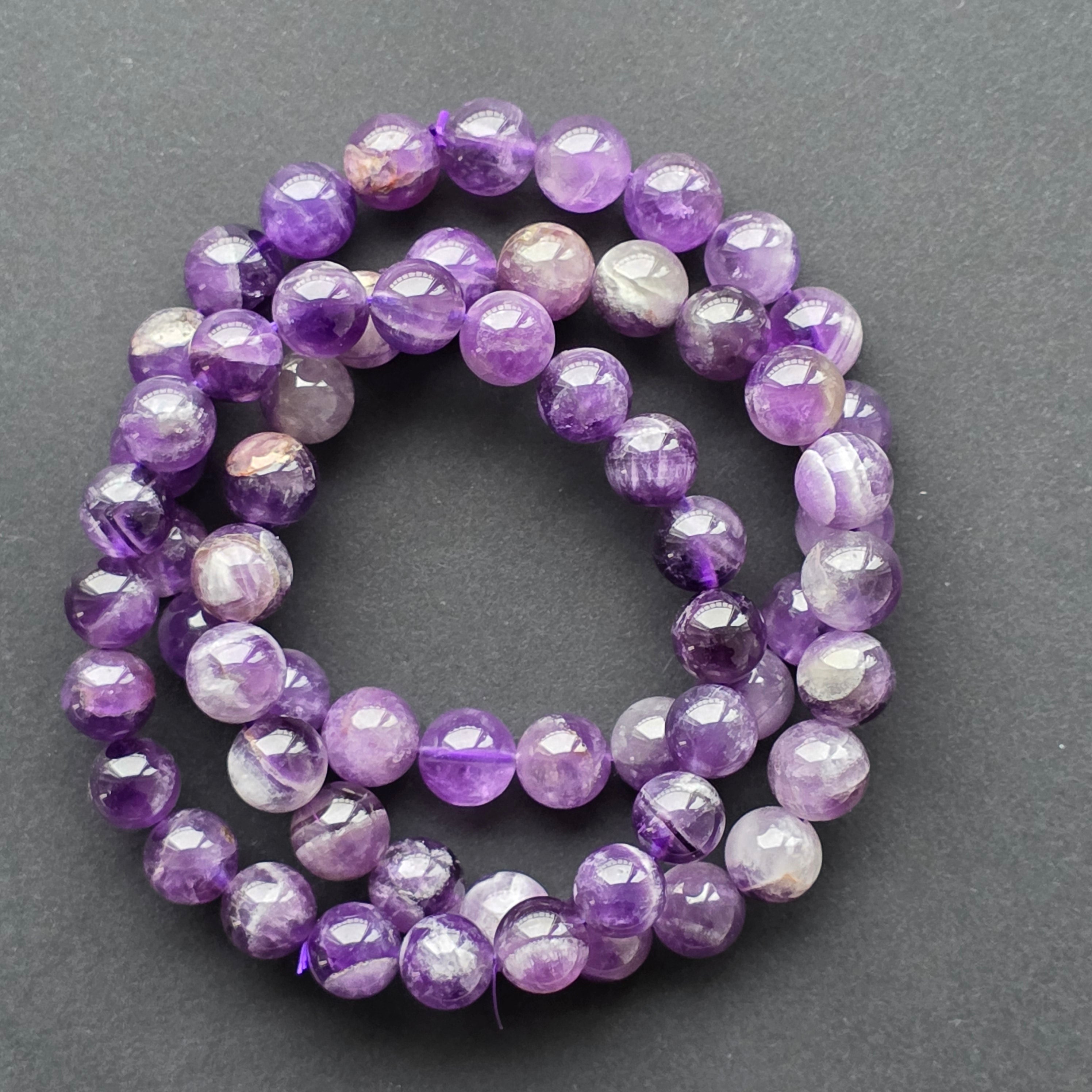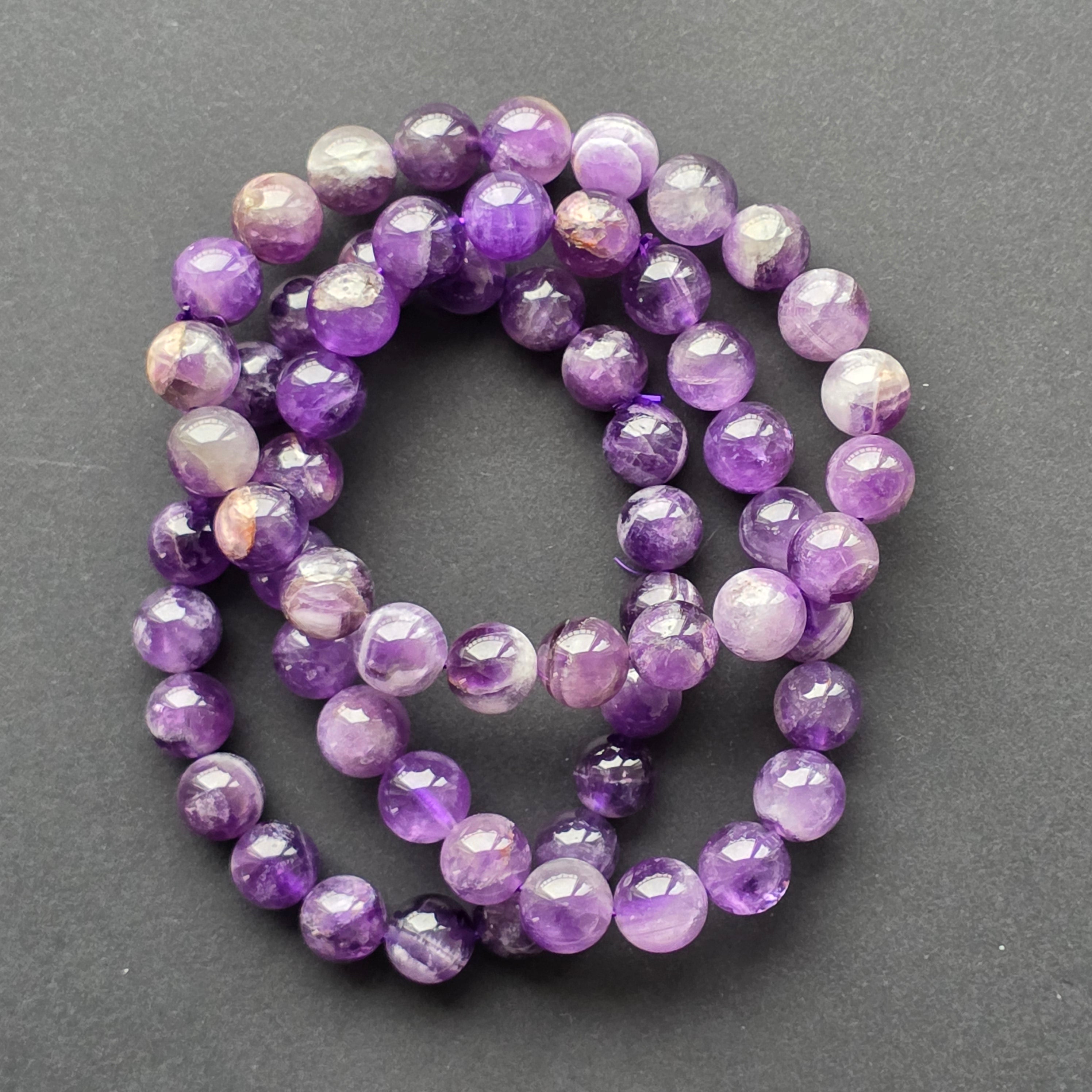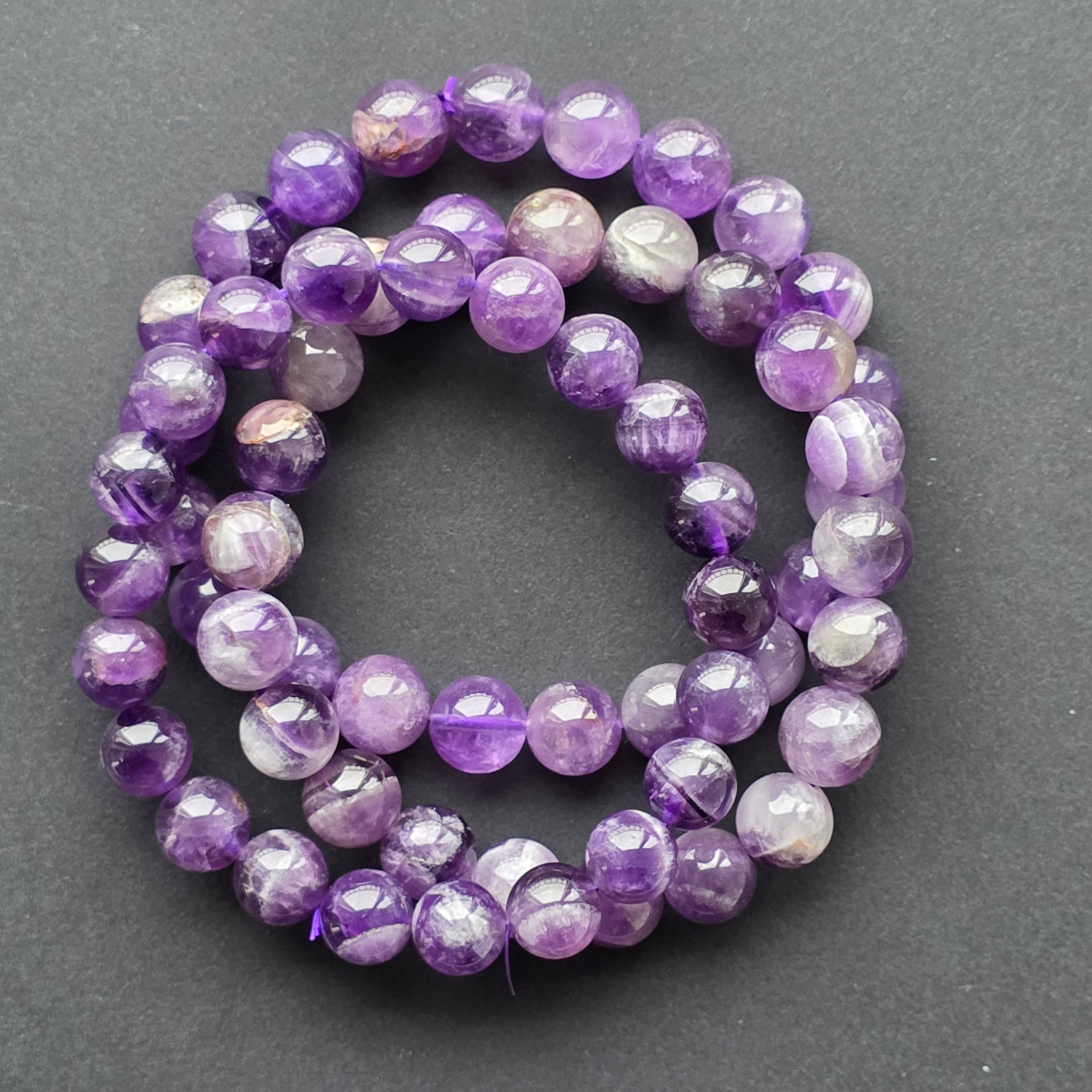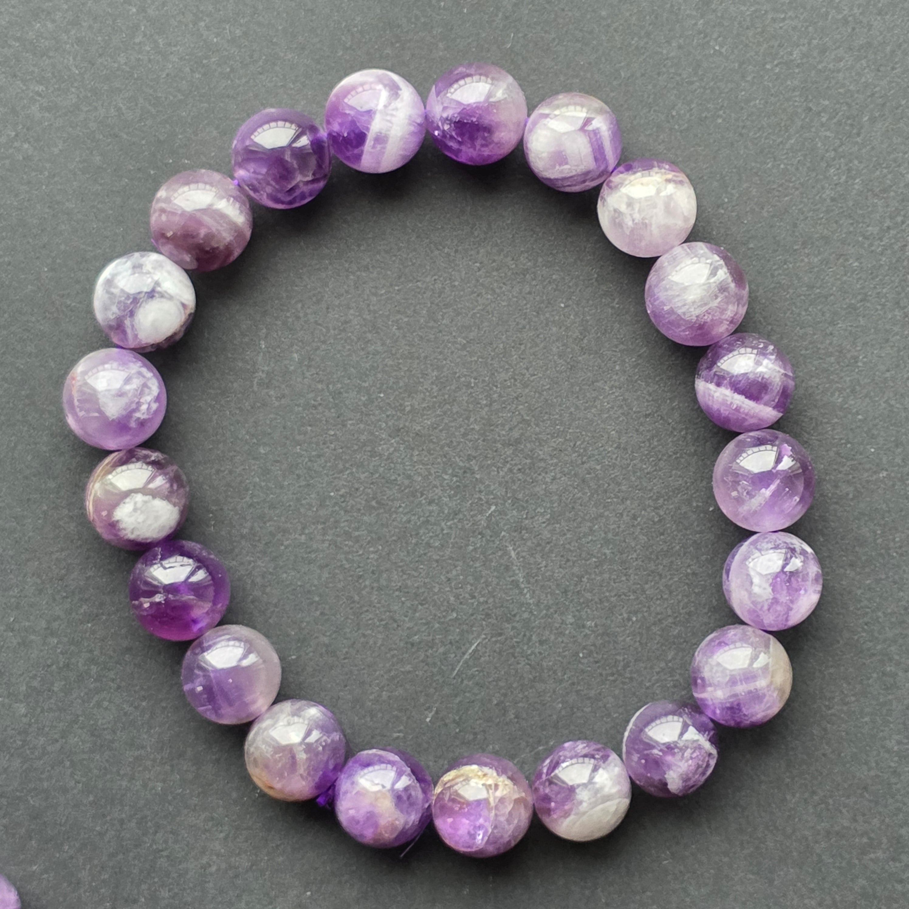 Всяко мънисто улавя светлината в деликатни отражения, а разнообразните тонове на лилавото — от дълбоки нюанси до прозрачни акценти — превръщат гривната в елегантен, спокоен и хармоничен аксесоар. Лесна за носене, деликатна на китката и подходяща както за ежедневни облекла, така и за по-изискан стил.