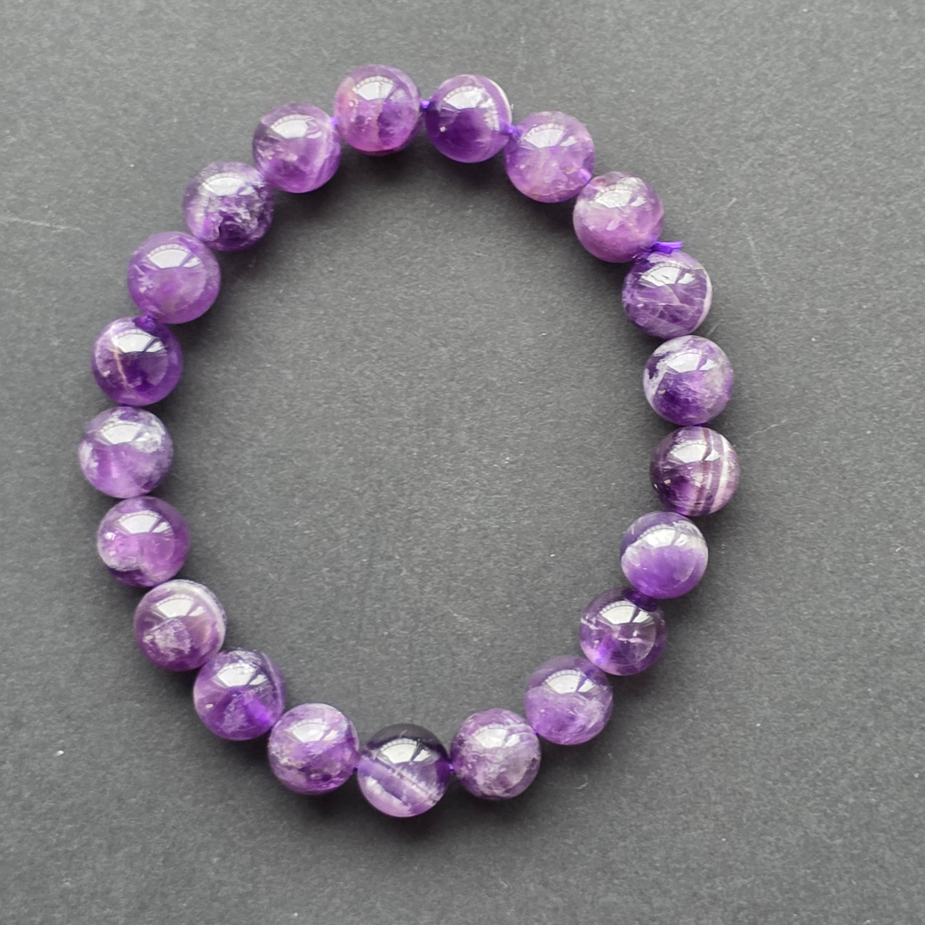 Гривната от аметист носи на китката класическото изящество на един от най-обичаните полускъпоценни камъни. Малките и перфектно оформени мъниста създават деликатен низ от лилави нюанси, в естествен градиент, напомнящ за вечерното небе или за интензивността на лавандулово цвете, докоснато от светлина.