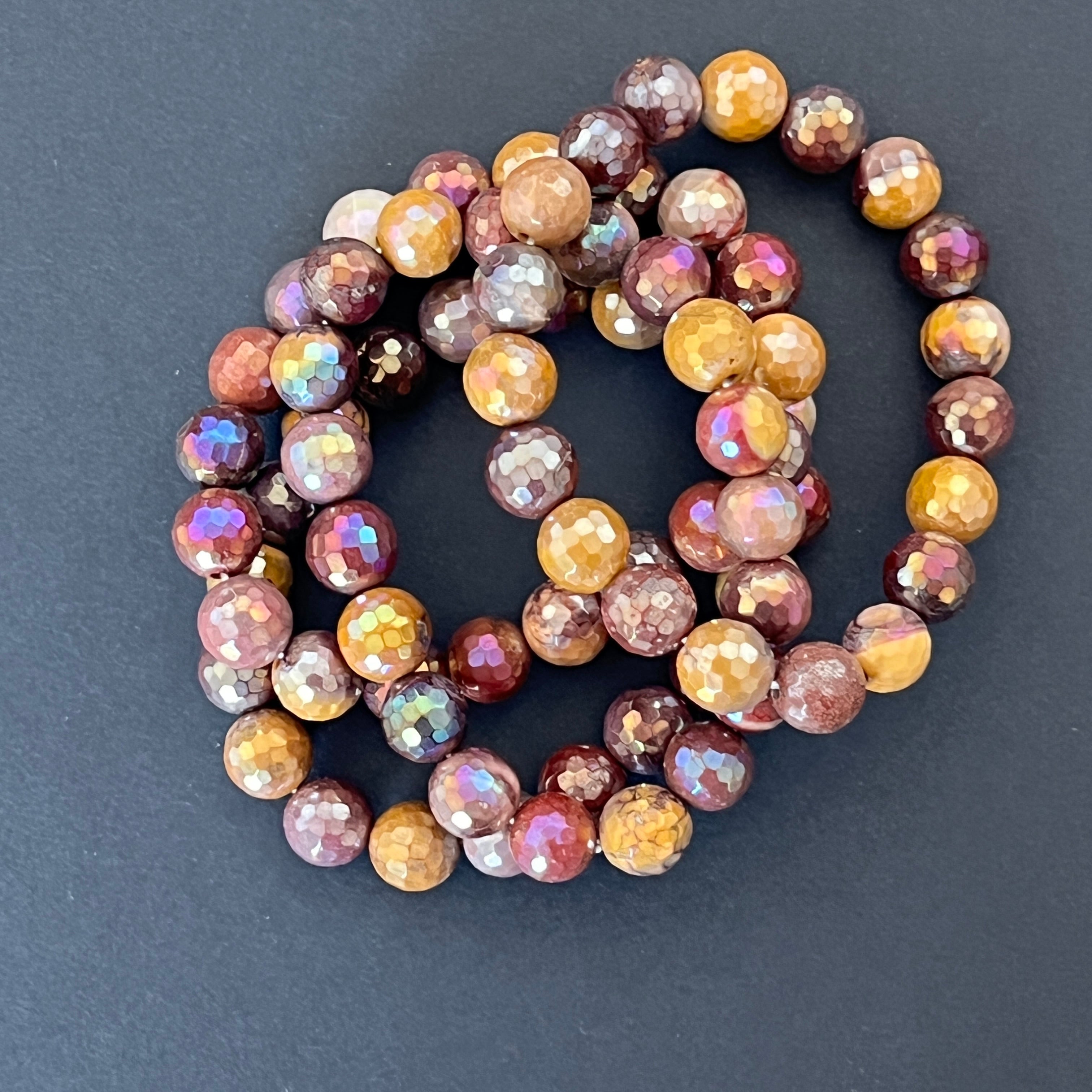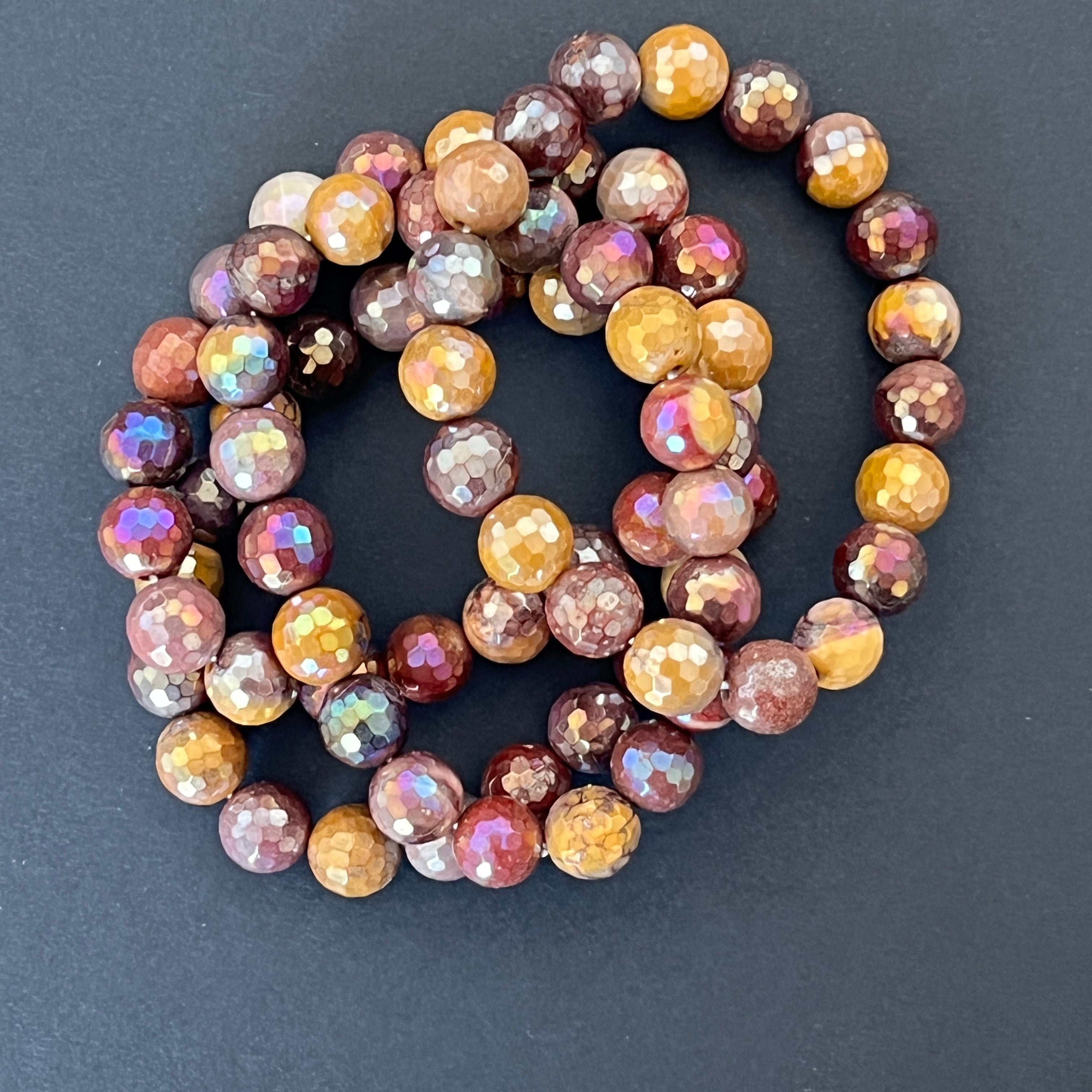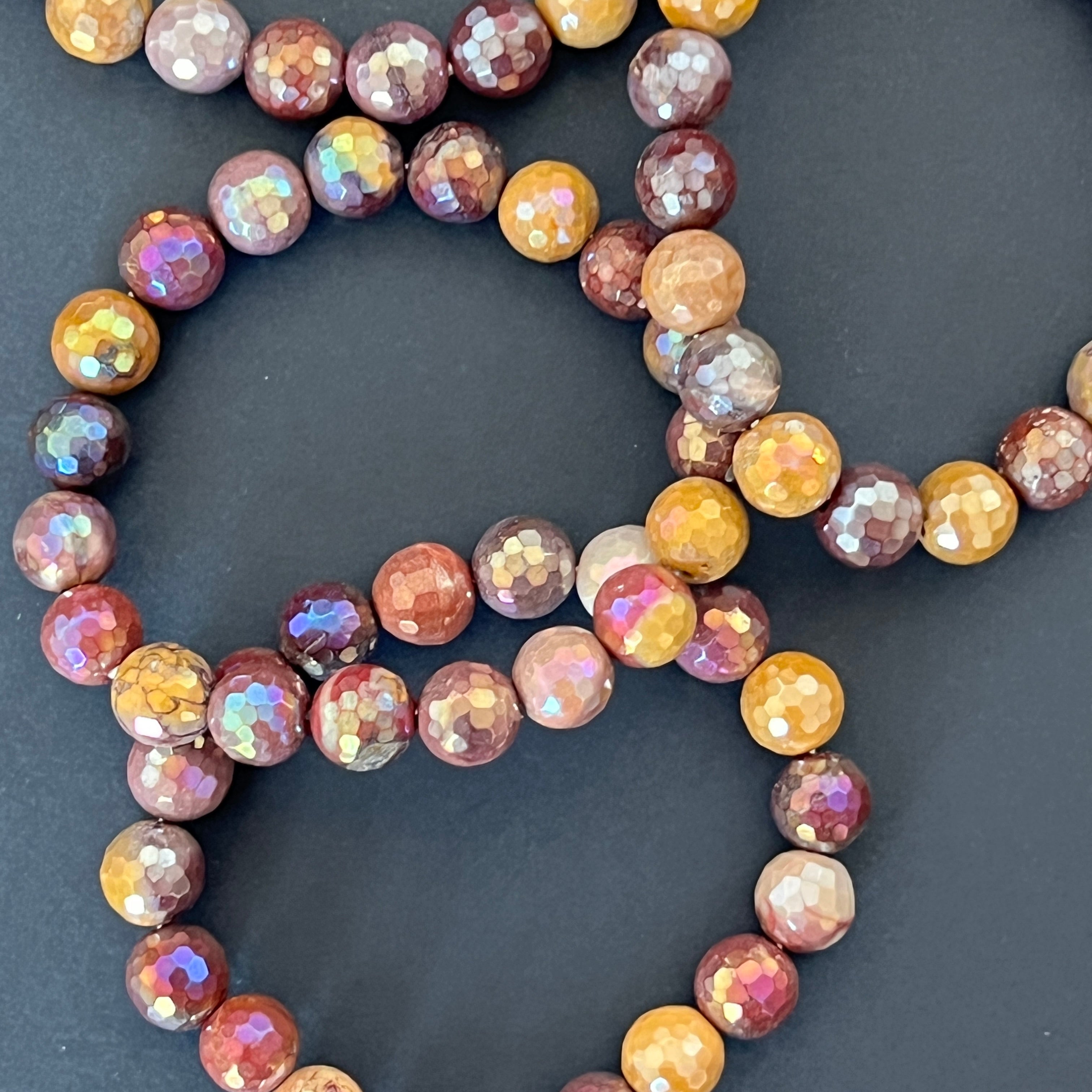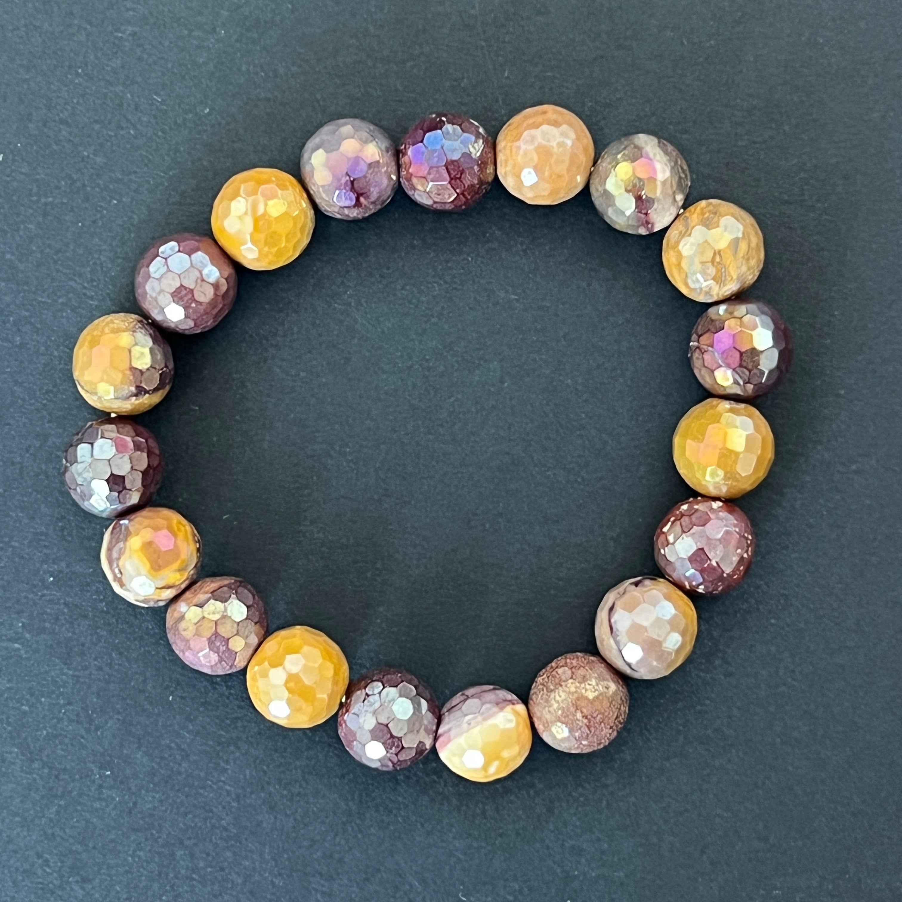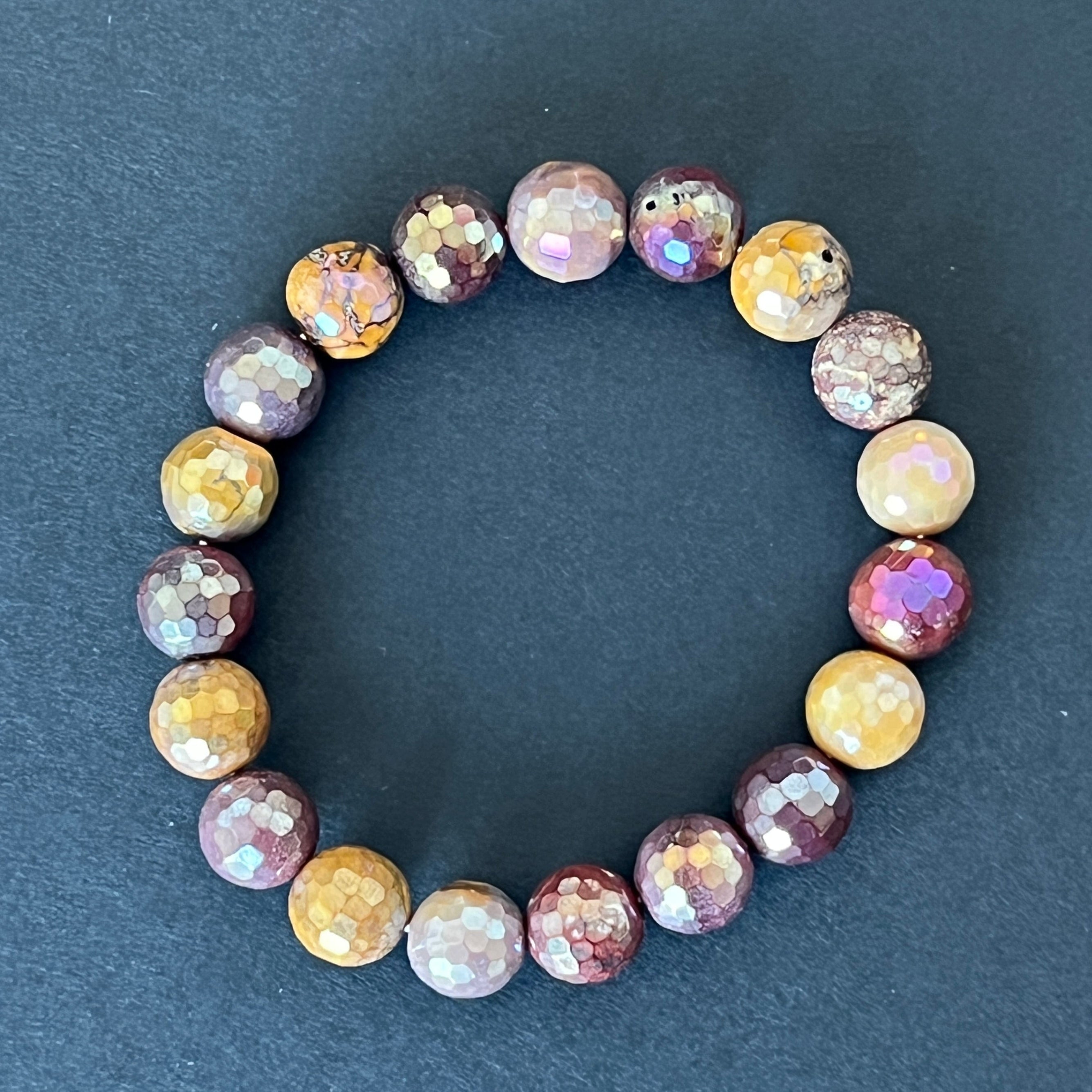 Тази фасетирана гривна от аура яспис mookait, съставена от 9-10 mm сферични мъниста, е уникално бижу, което съчетава естествената красота на mookait с финия блясък на покритието аурата. Топлите земни тонове са подсилени от седефените отблясъци и играта на светлината, създадена от фасетираната повърхност.