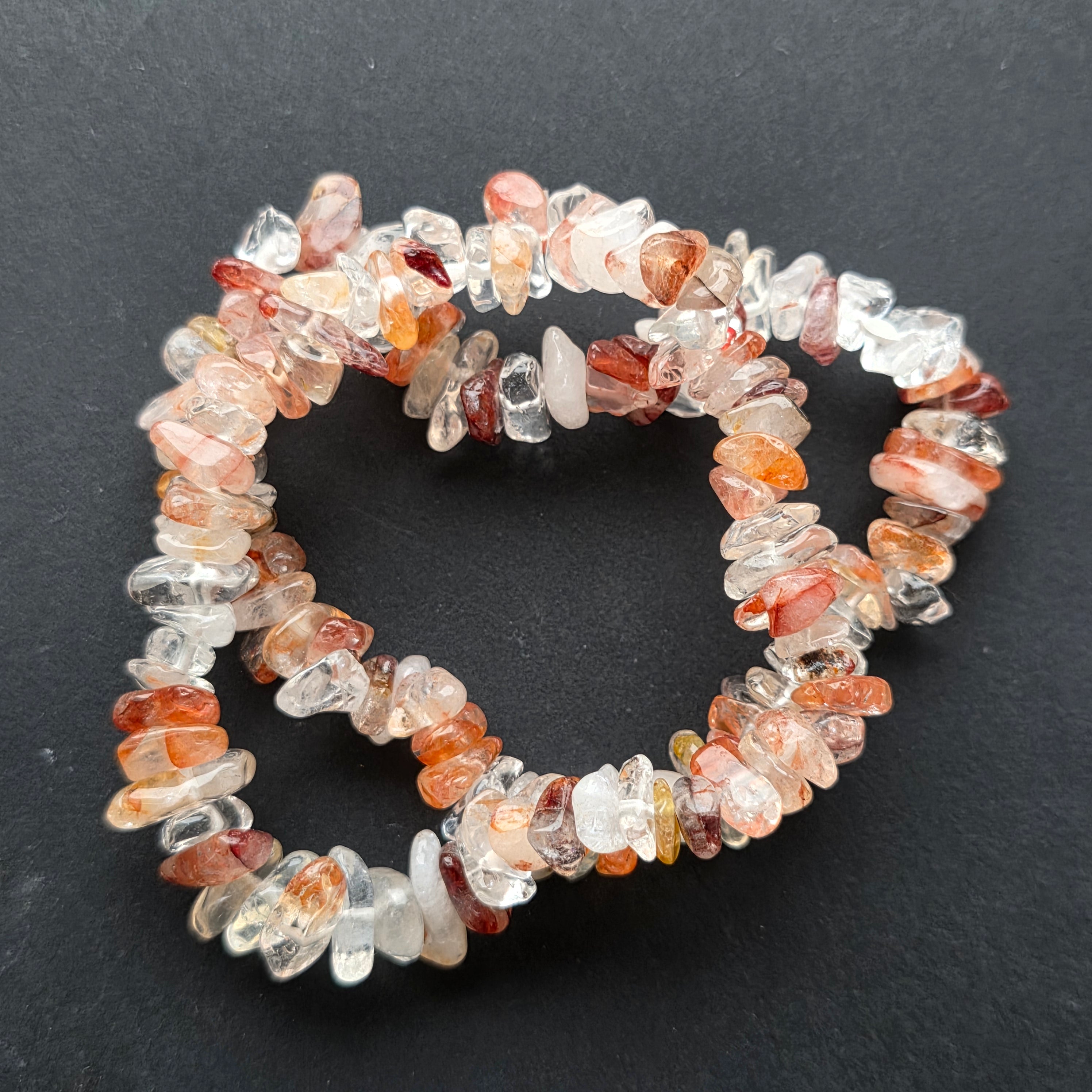 Камъни: безцветен кварц + червен хематит – естествени, неправилни чипове