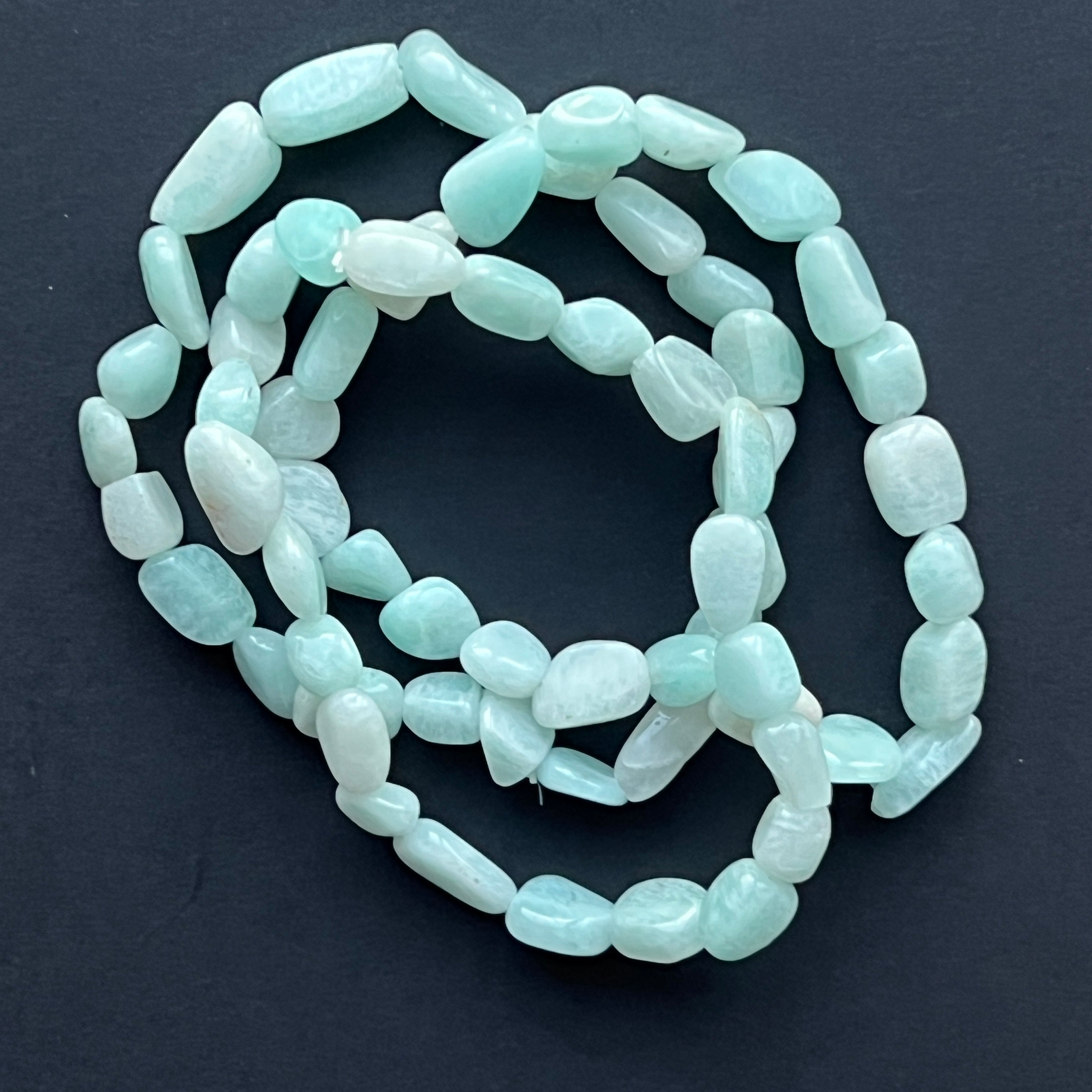 Тази гривна от амазонит, изработена от овални дискове 6–10 мм, съчетава нежността на органичните форми с естествената красота на кристала. Нюансите на зелено и синьо, понякога полупрозрачни, внушават спокойствието на чистите води и чистата енергия на природата.