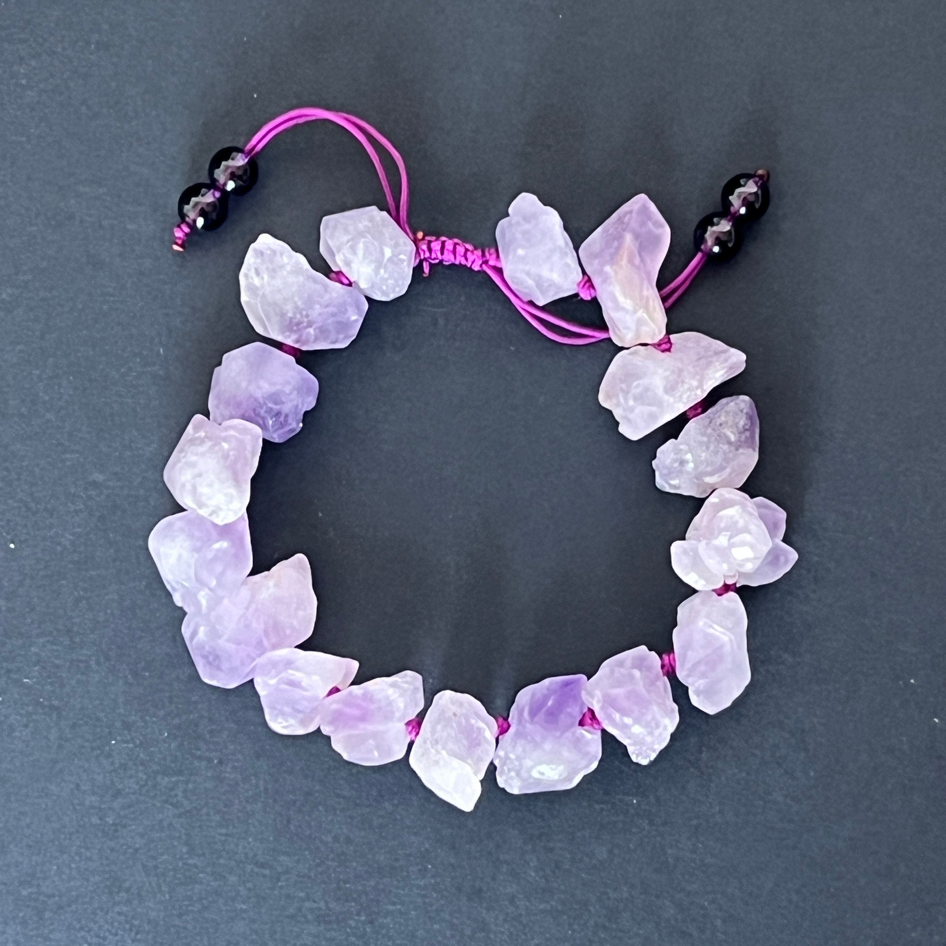 Тази регулируема гривна от необработен аметист съчетава естествената красота на кристала с простотата на съвременния дизайн. Фрагментите от аметист запазват органичната си форма, подчертавайки нюансите на интензивен виолетов и деликатните прозрачности, което прави всяка гривна наистина уникална.