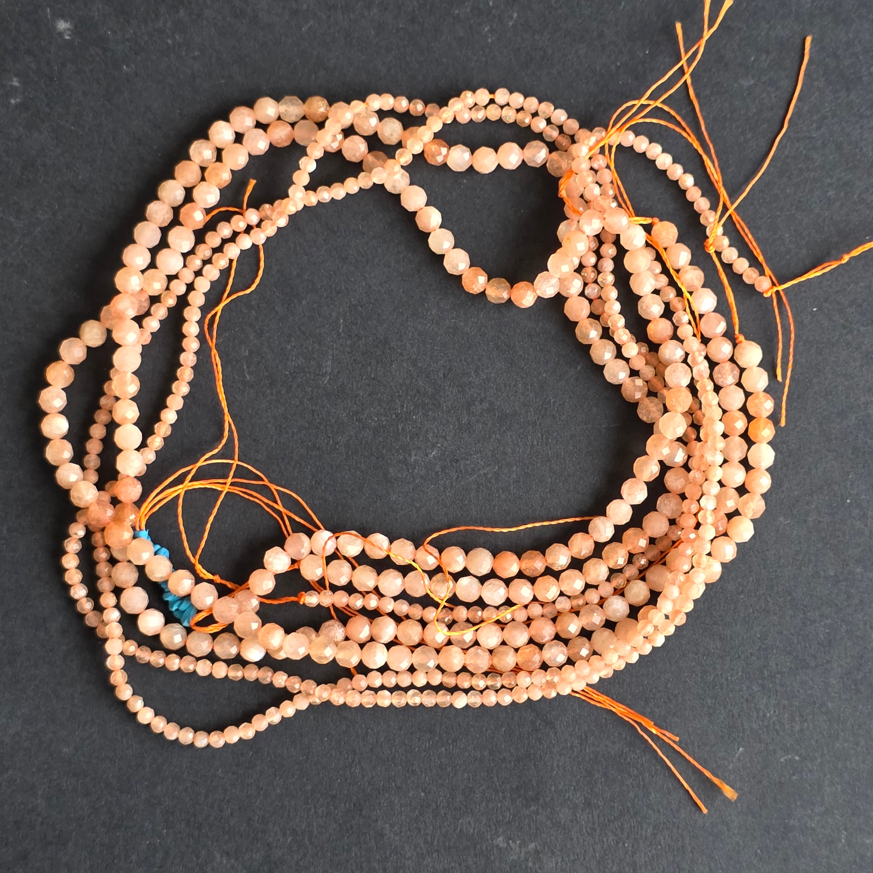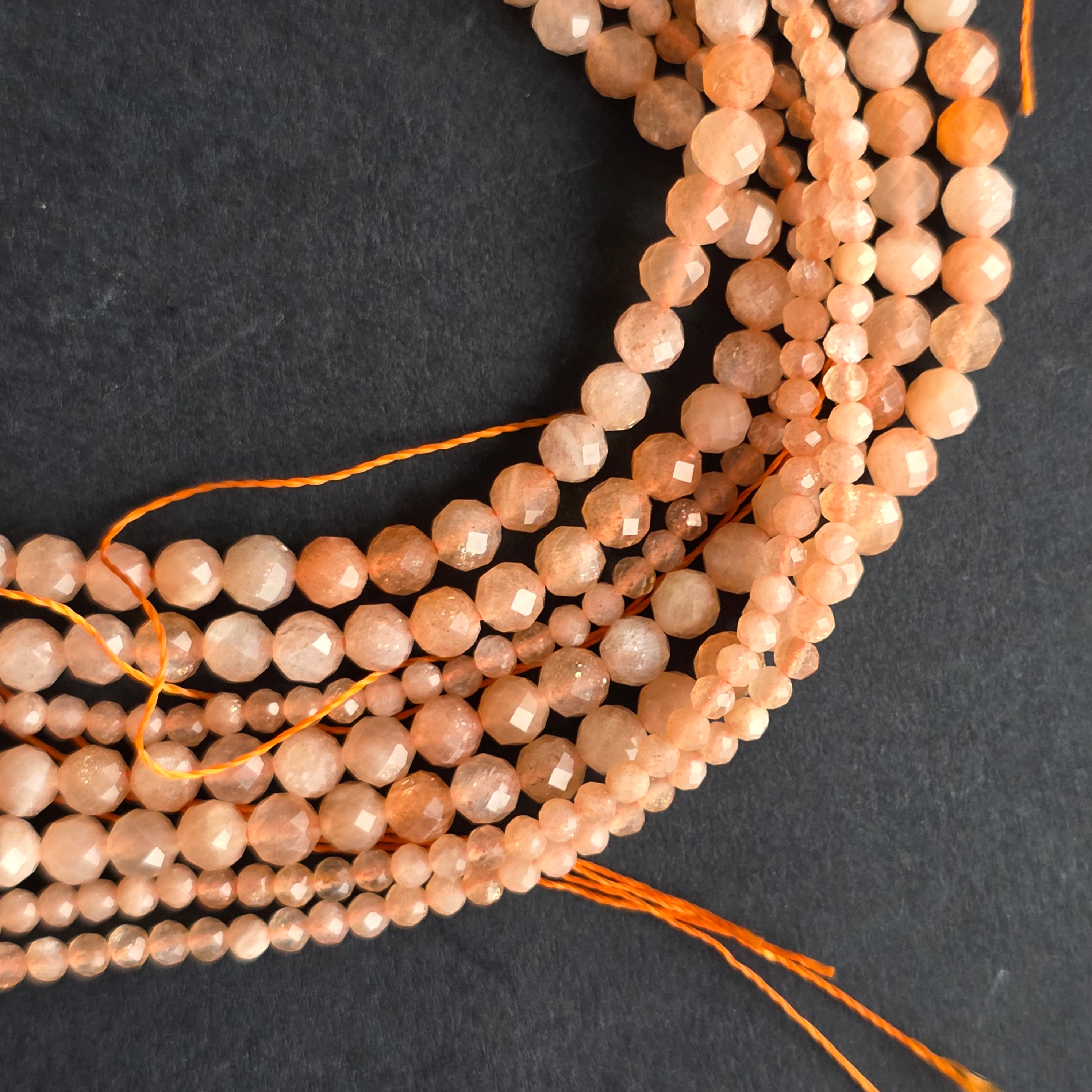 Наниз от СЛЪНЧЕВ КАМЪК съставен от естествени фасетирани сферични мъниста,перфектен за колиета, гривни или други ръчно изработени бижута.