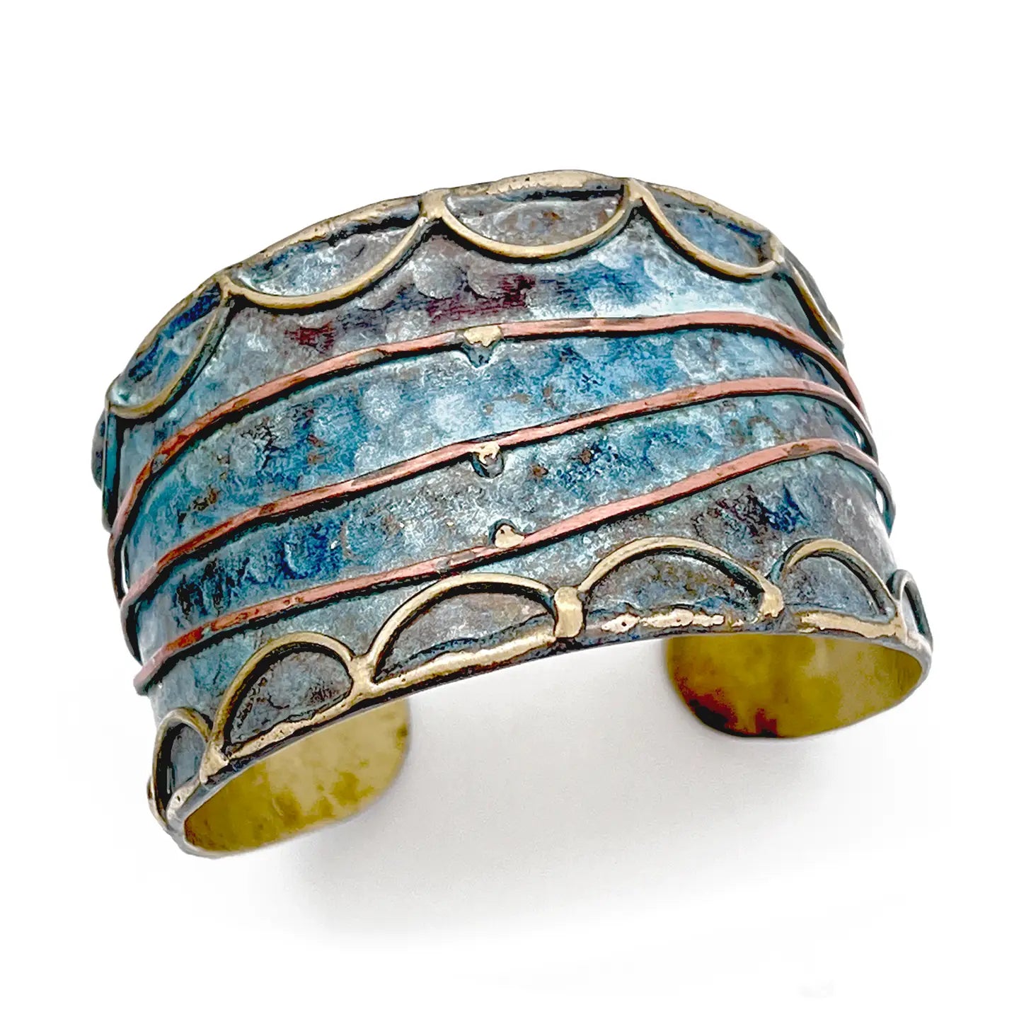 Гривната Rushing River впечатлява със своята интензивна ръчно направена патина в нюанси на синьо и зелено, която предизвиква асоциации с красотата на морските дълбини. Извитите мотиви, наподобяващи вълни, допълват течния и органичен дизайн, превръщайки всеки детайл в история за водата и свободата.