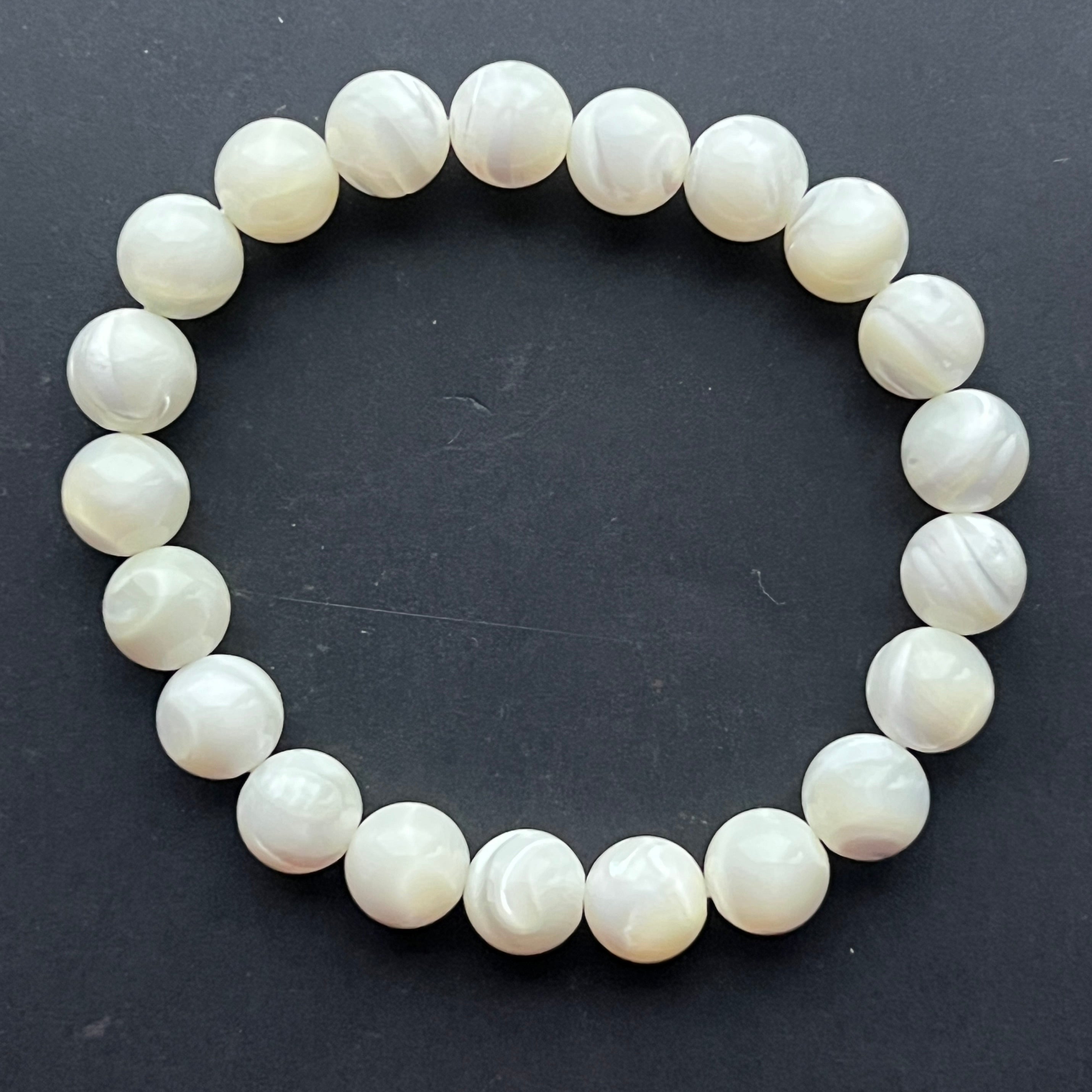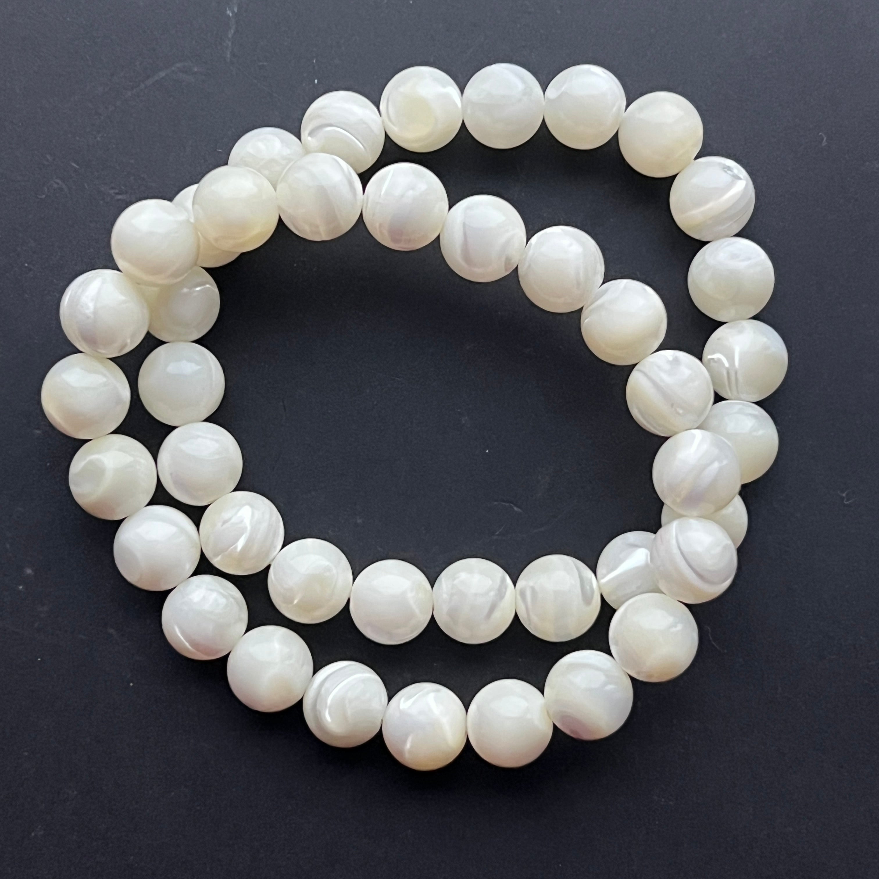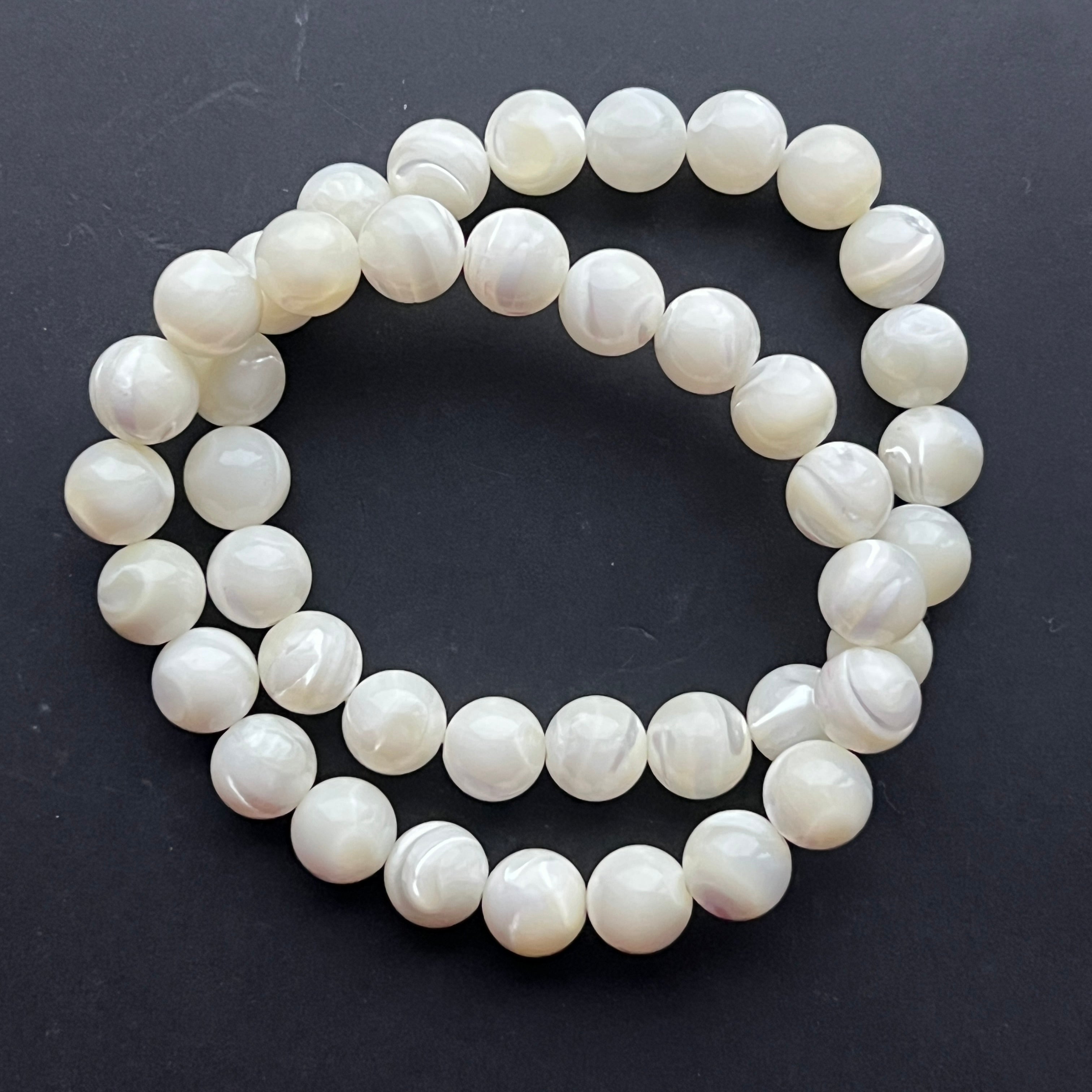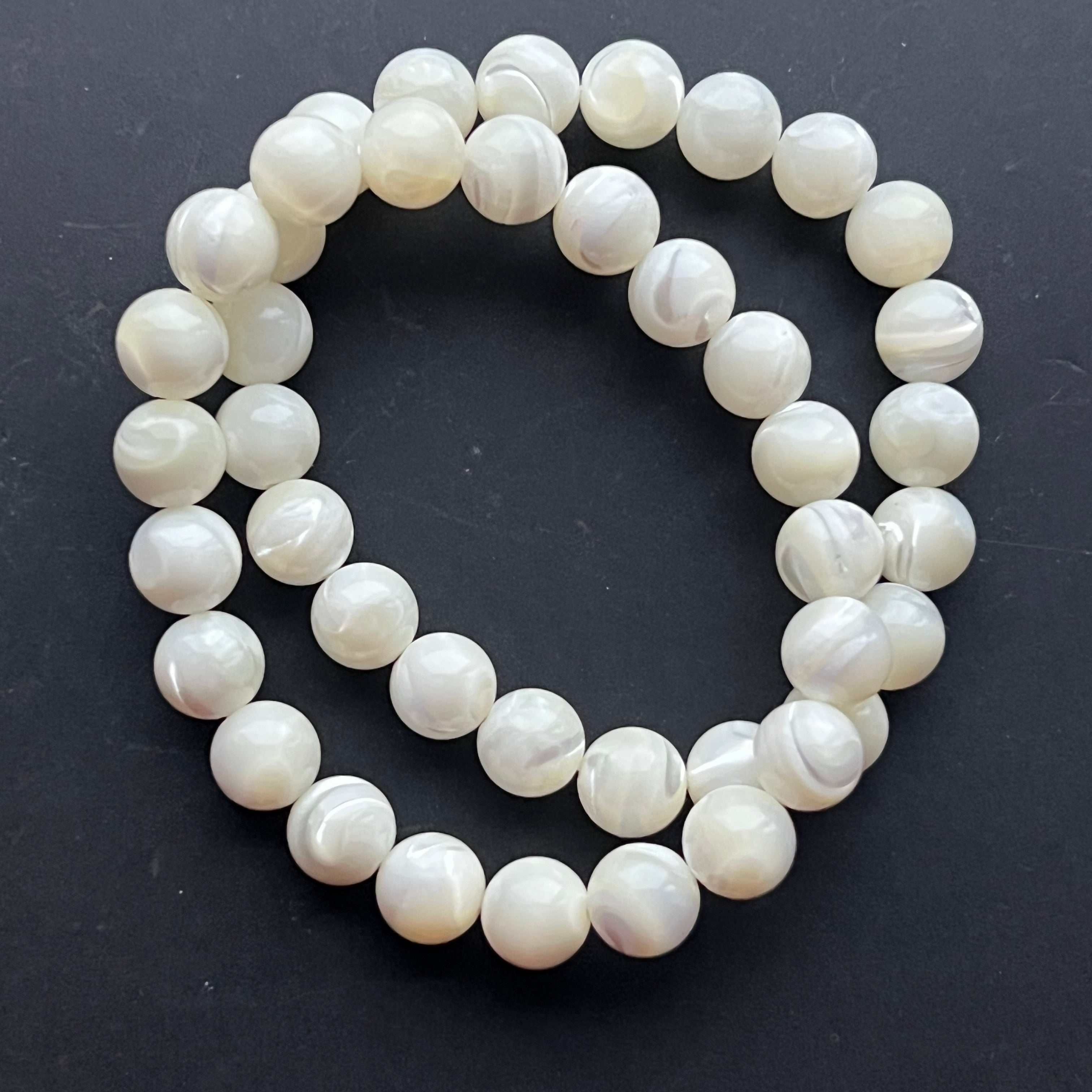 Тази гривна от перлена мида, съставена от сферични мъниста с размер 8 мм, удивлява със своята нежна блясък и перлени отблясъци, напомнящи за красотата на морето. Всяко изделие е уникално, с леко различаващи се нюанси и иридации.