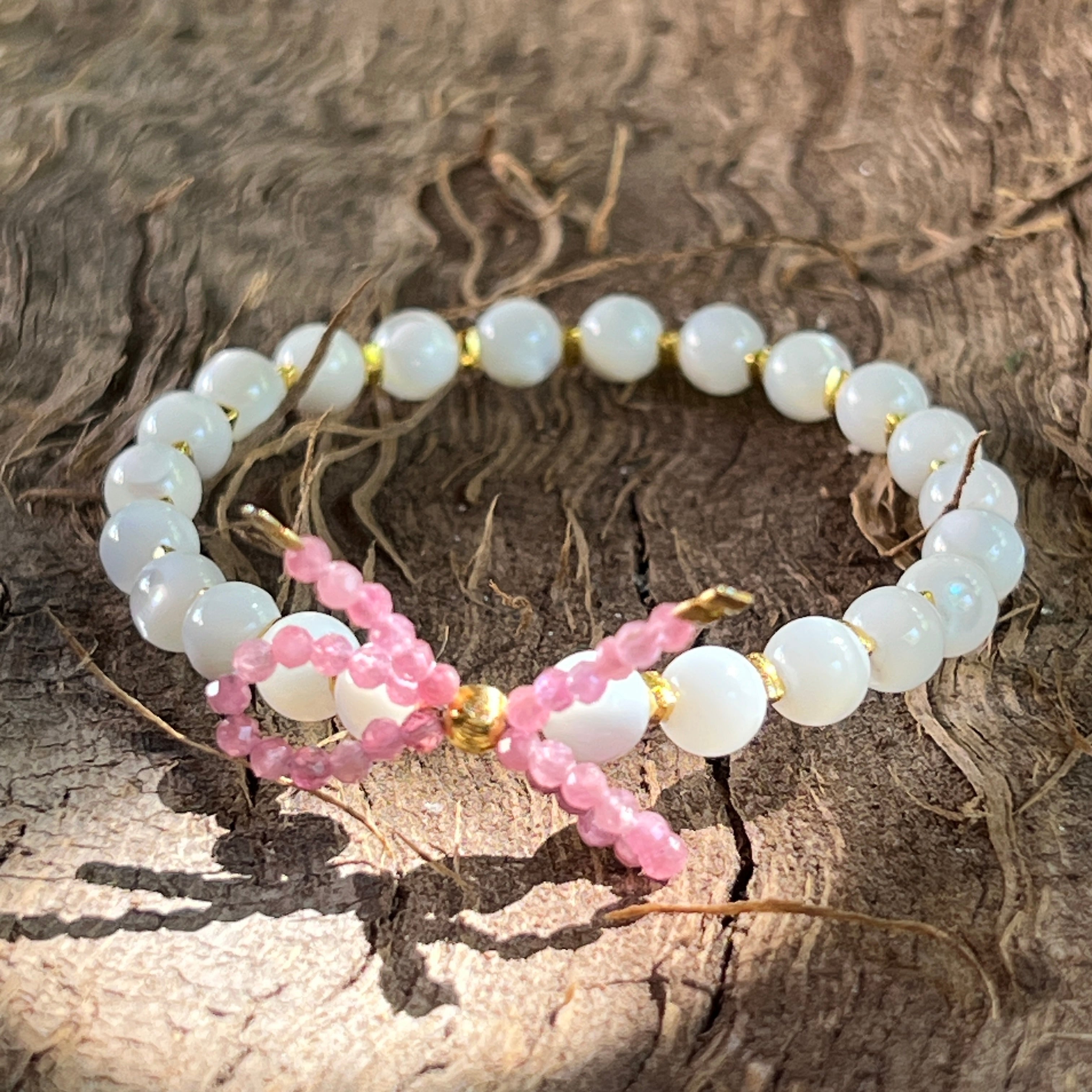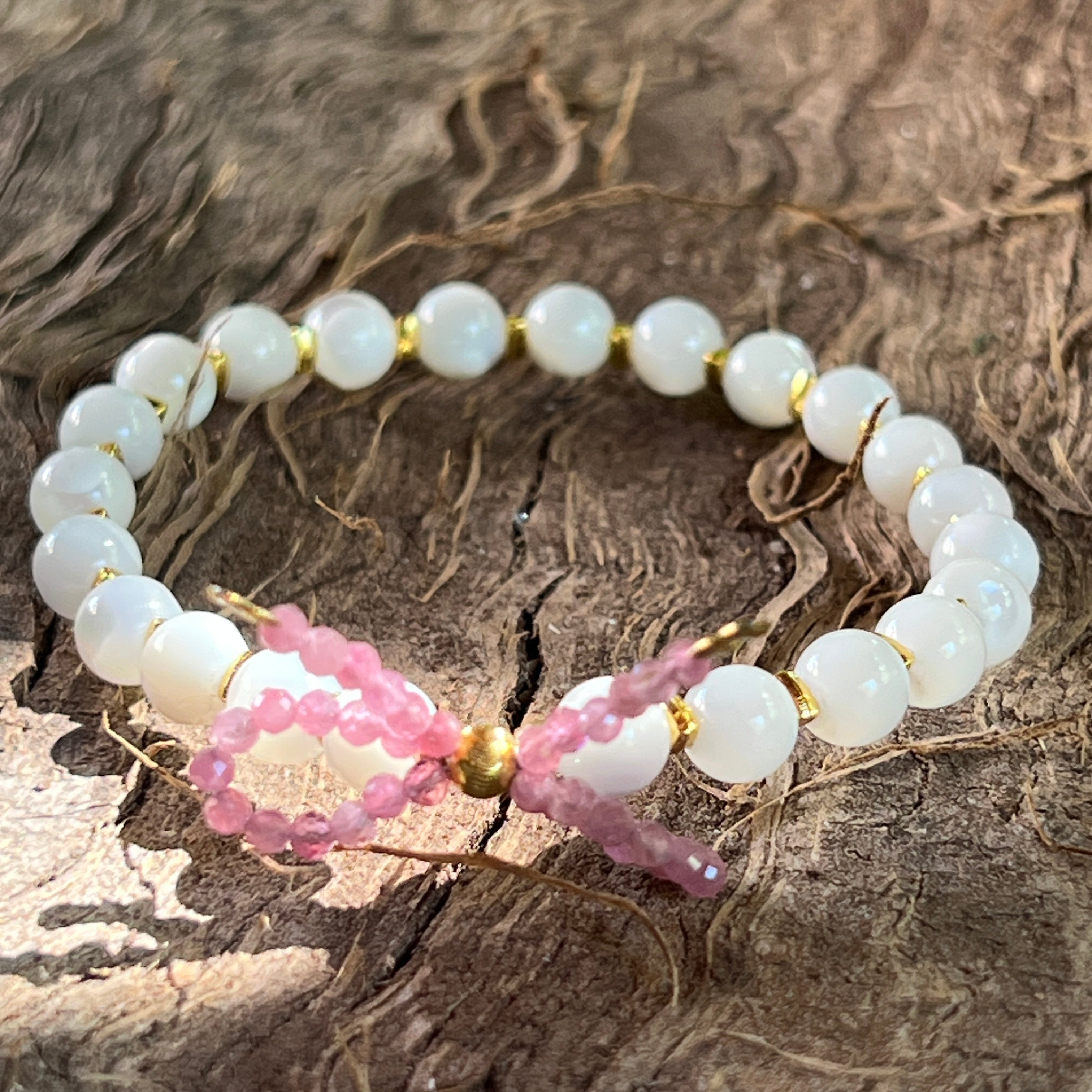 Descriere - Гривна от седеф с декоративен възел от рубелит – сферични мъниста 6 мм