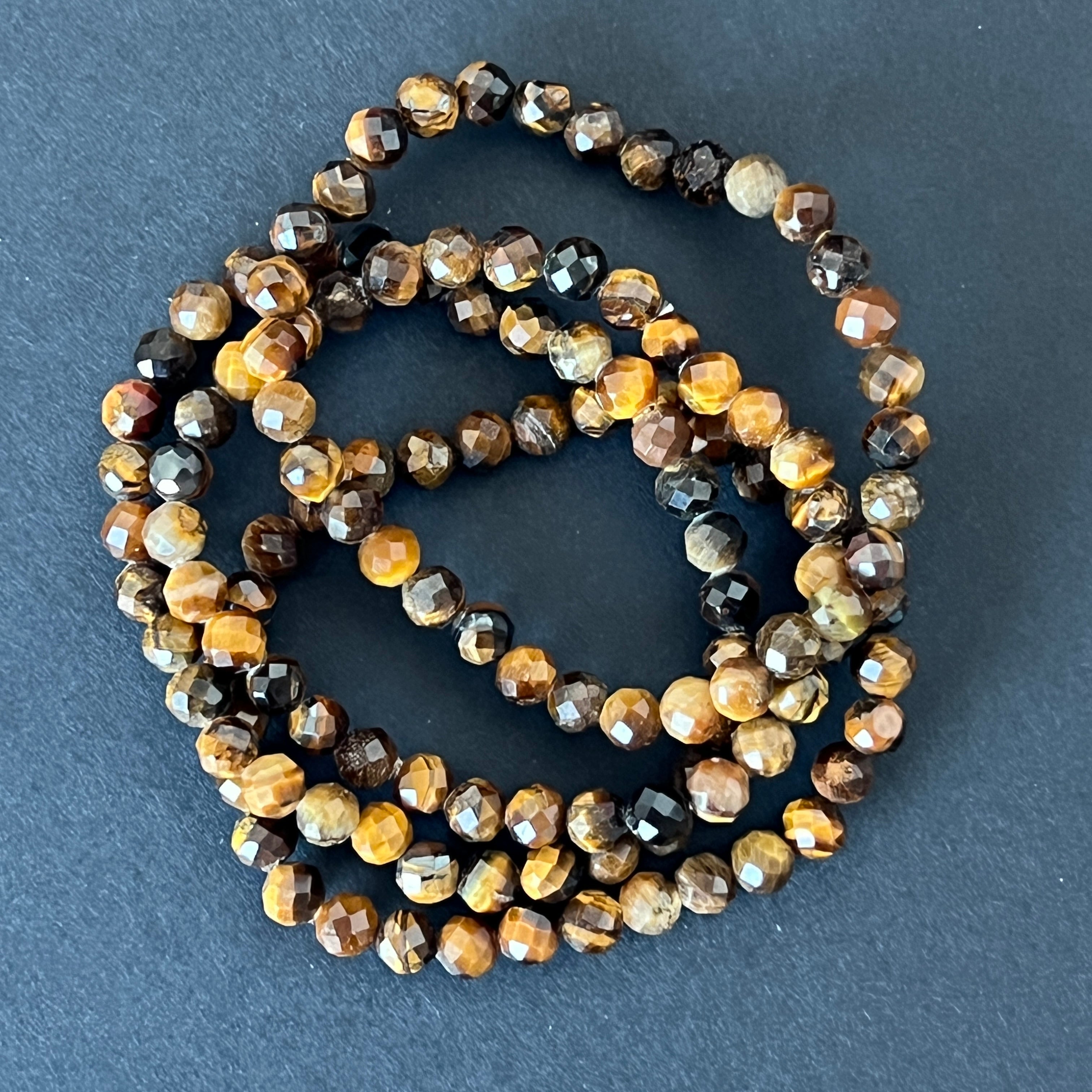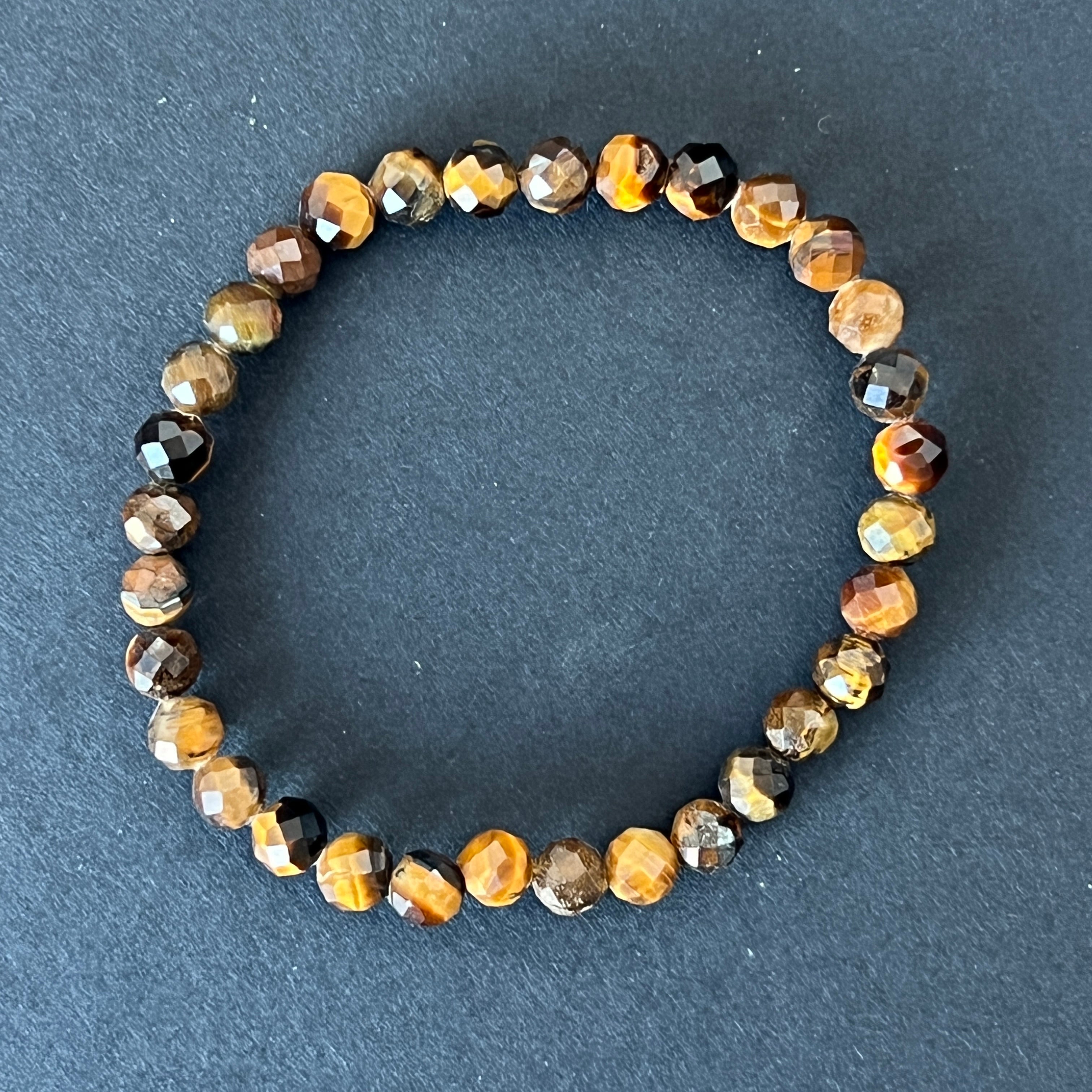 Тази фасетирана гривна от тигрово око, съставена от сферични мъниста с диаметър 6 мм, привлича вниманието със своя ефектен играещ със светлината и златистите отблясъци. Фасетираната повърхност усилва оптичния ефект, характерен за този камък, известен като „шатоанс“, подобен на погледа на котка.