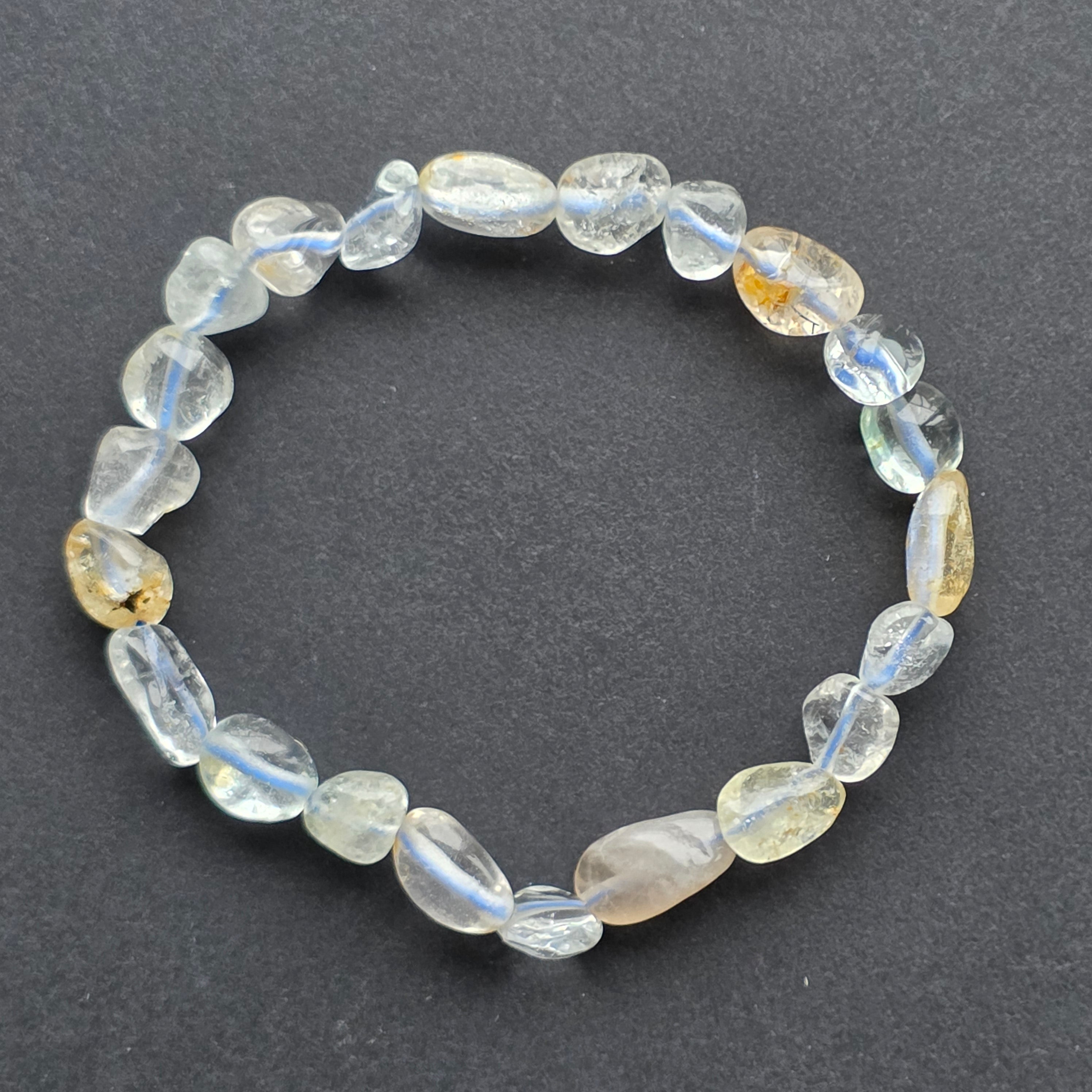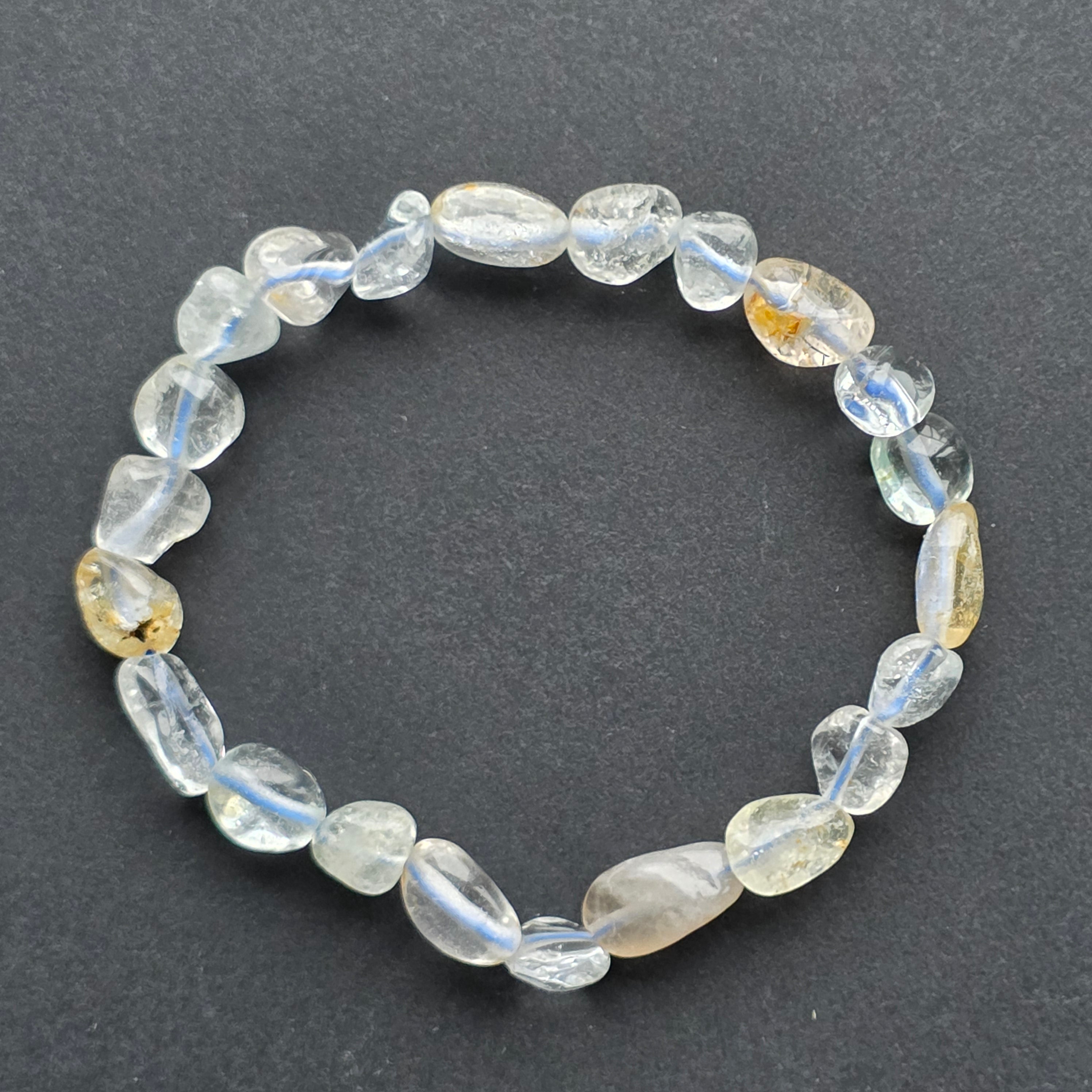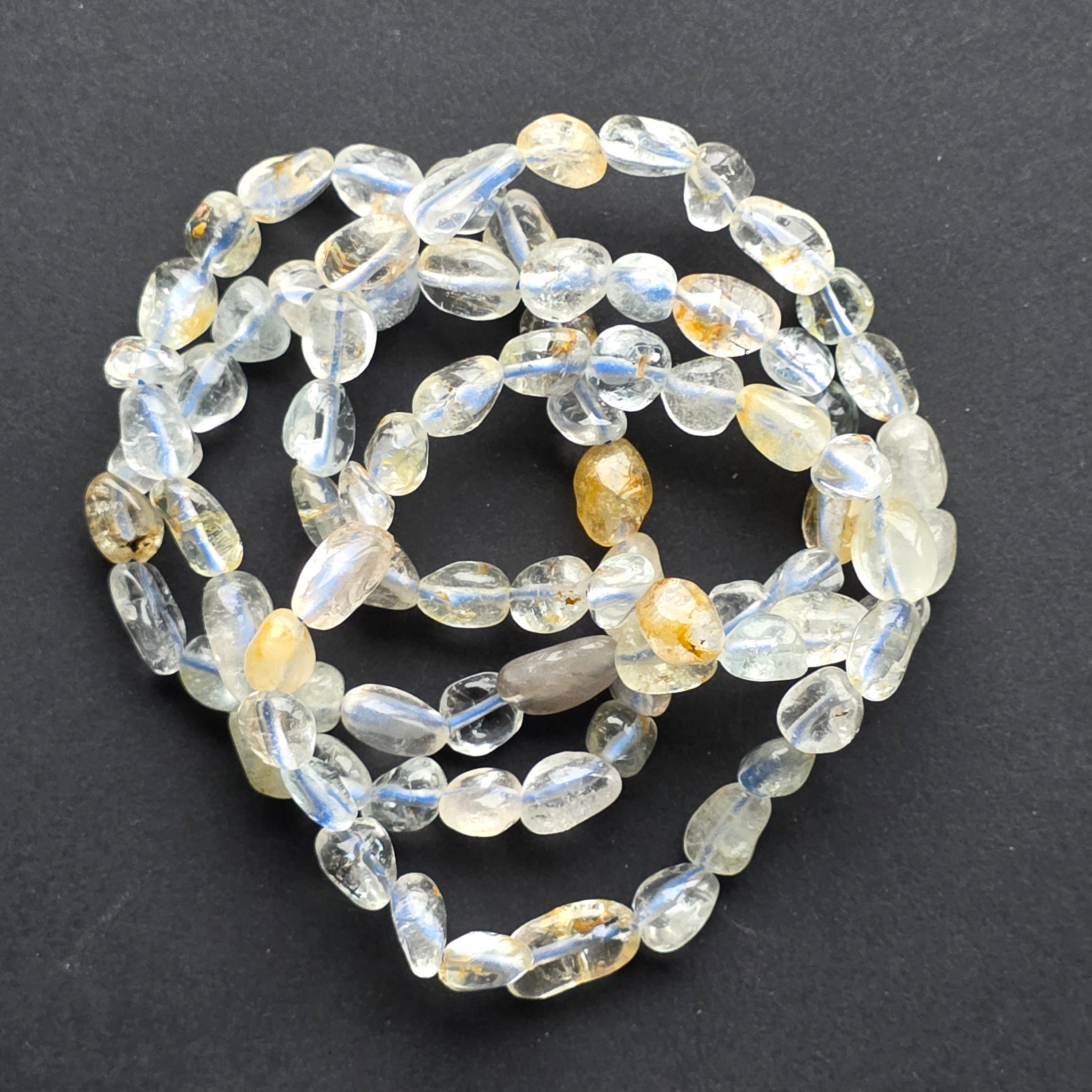 Гривната от топаз Tumble е празник на светлината в най-чистата ѝ форма. Гладките, естествено закръглени камъчета създават деликатна игра на нюанси – бледо синьо, топло жълто и прозрачни фрагменти, които улавят светлината като вълните, разбиващи се на пясъка. Всяко парче топаз има уникална органична форма, сякаш съхранява в себе си историята на пътуването си през природата.