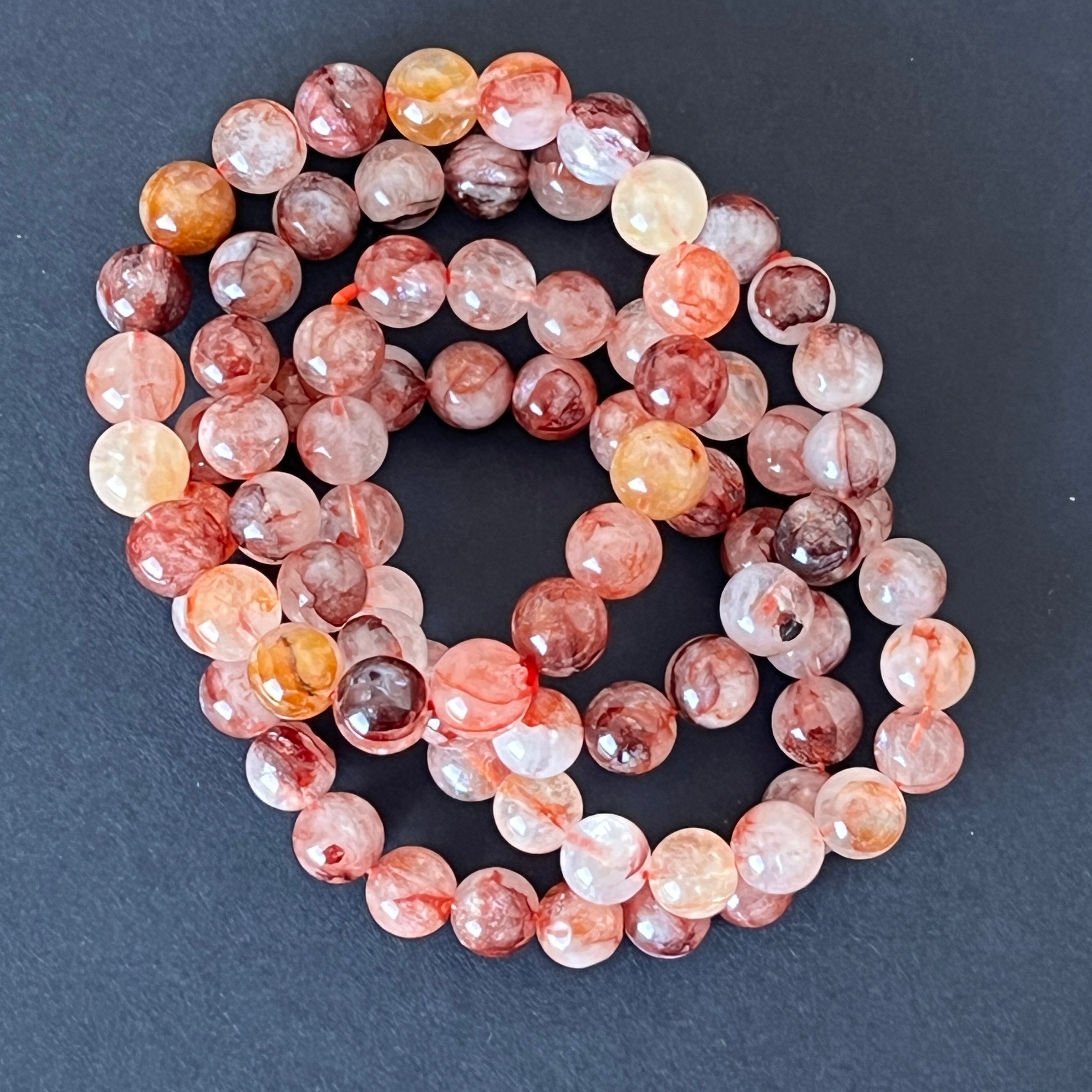 Тази гривна от червен хематитов кварц, съставена от сферични мъниста 9–10 мм, е изключително бижу, което съчетава кристалната яснота на кварца с страстните нюанси на червено и златисто от хематитовите включвания. Всяко мънисто е уникално, носейки завладяваща игра на цветове и отражения.