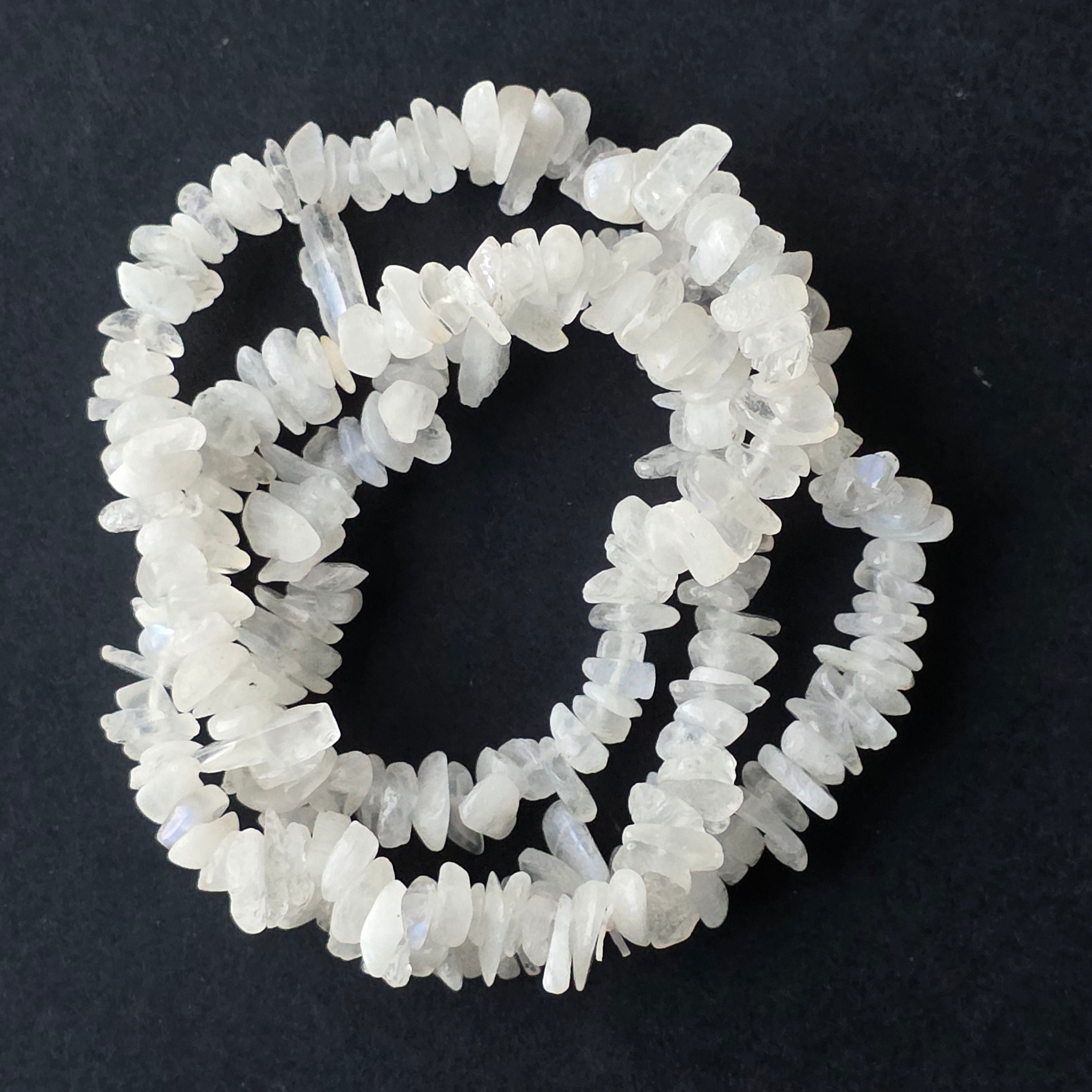 • Камък: натурален лунен камък (неправилни чипсове, ръчно шлифовани) – асоцииран с чистотата на емоциите, повишена интуиция и вътрешно равновесие