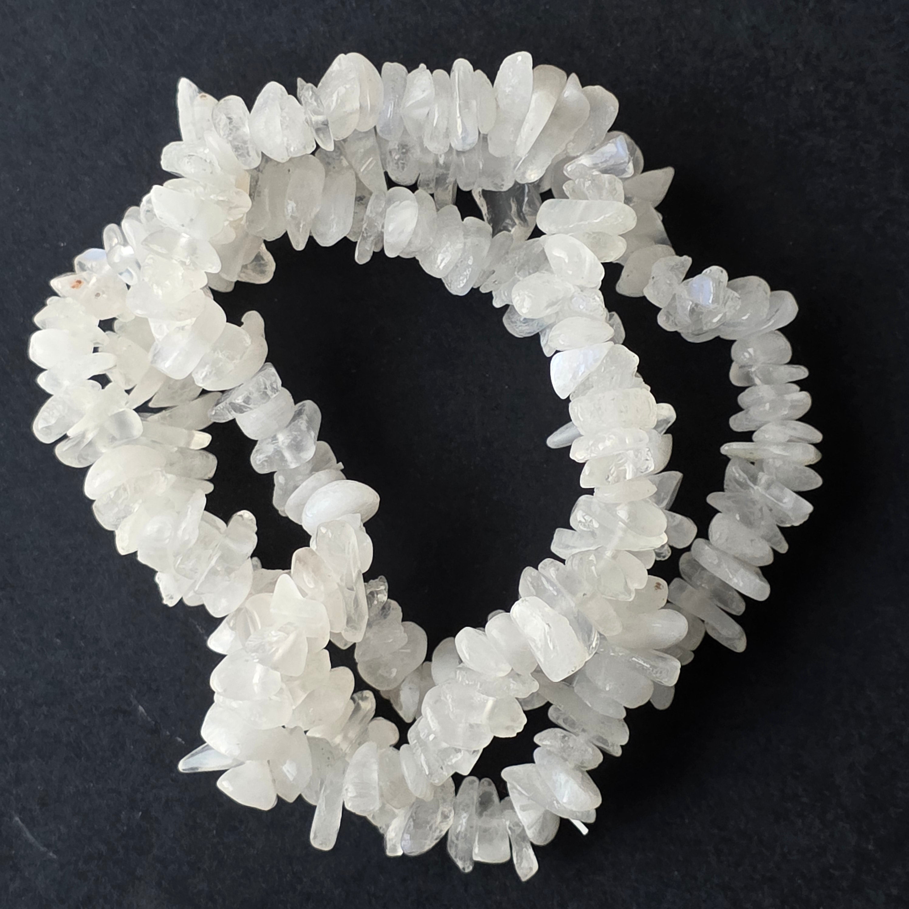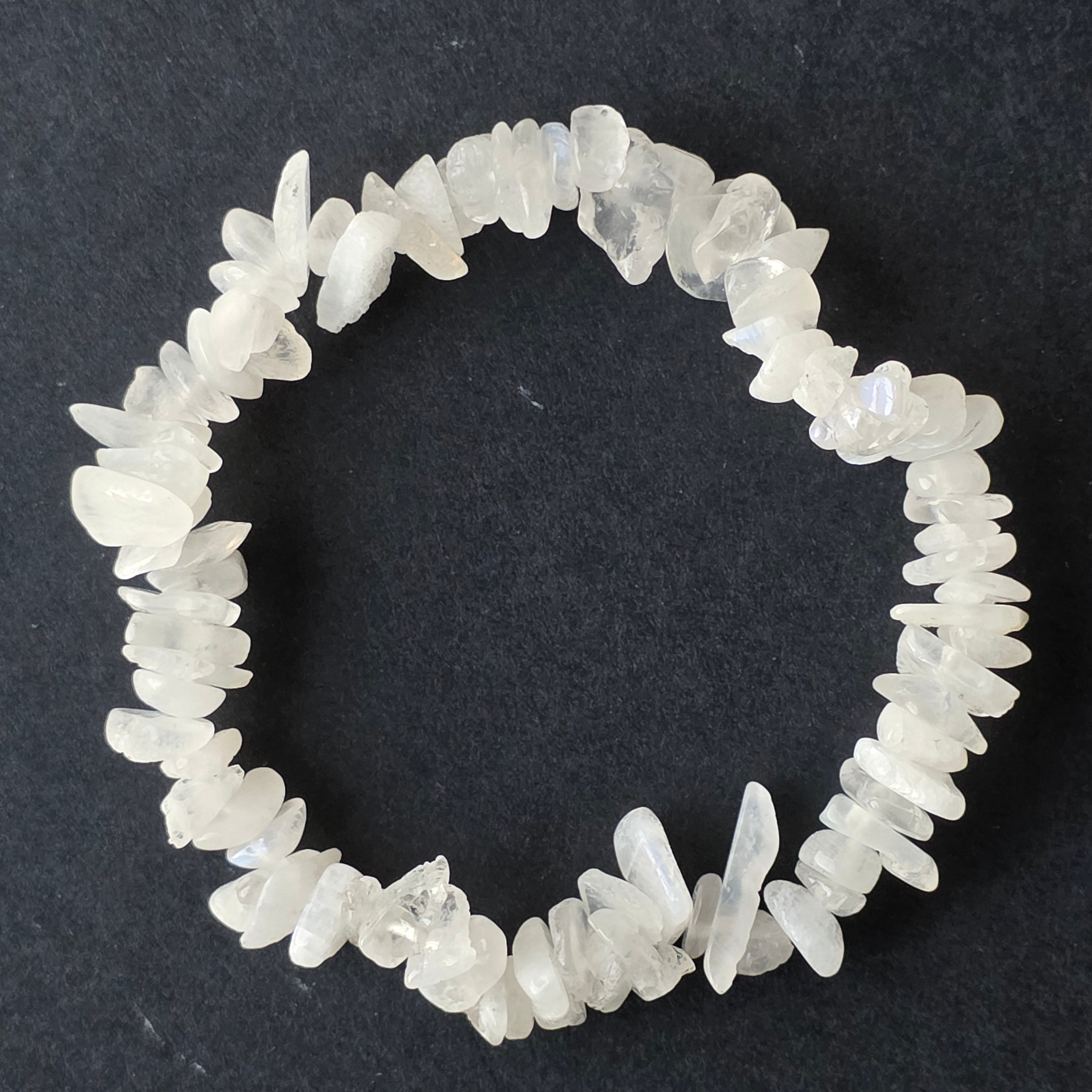 Гривна, която сякаш е изрязана от светлината на една спокойна утрин, където белият цвят не е просто цвят, а начало, чистота и обещание. Чипсовете от бял лунен камък, деликатни и съзнателно несъвършени, се подреждат в хармоничен кръг, като поредица от светлини, които се докосват една до друга в тих танц.