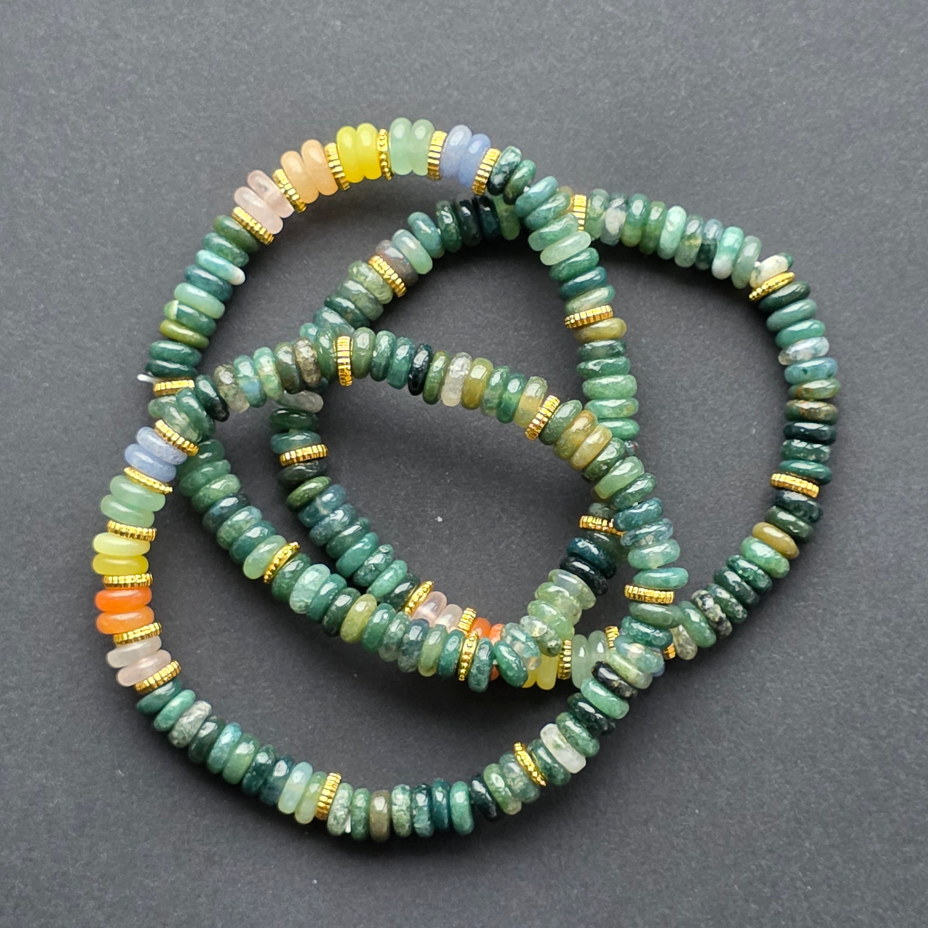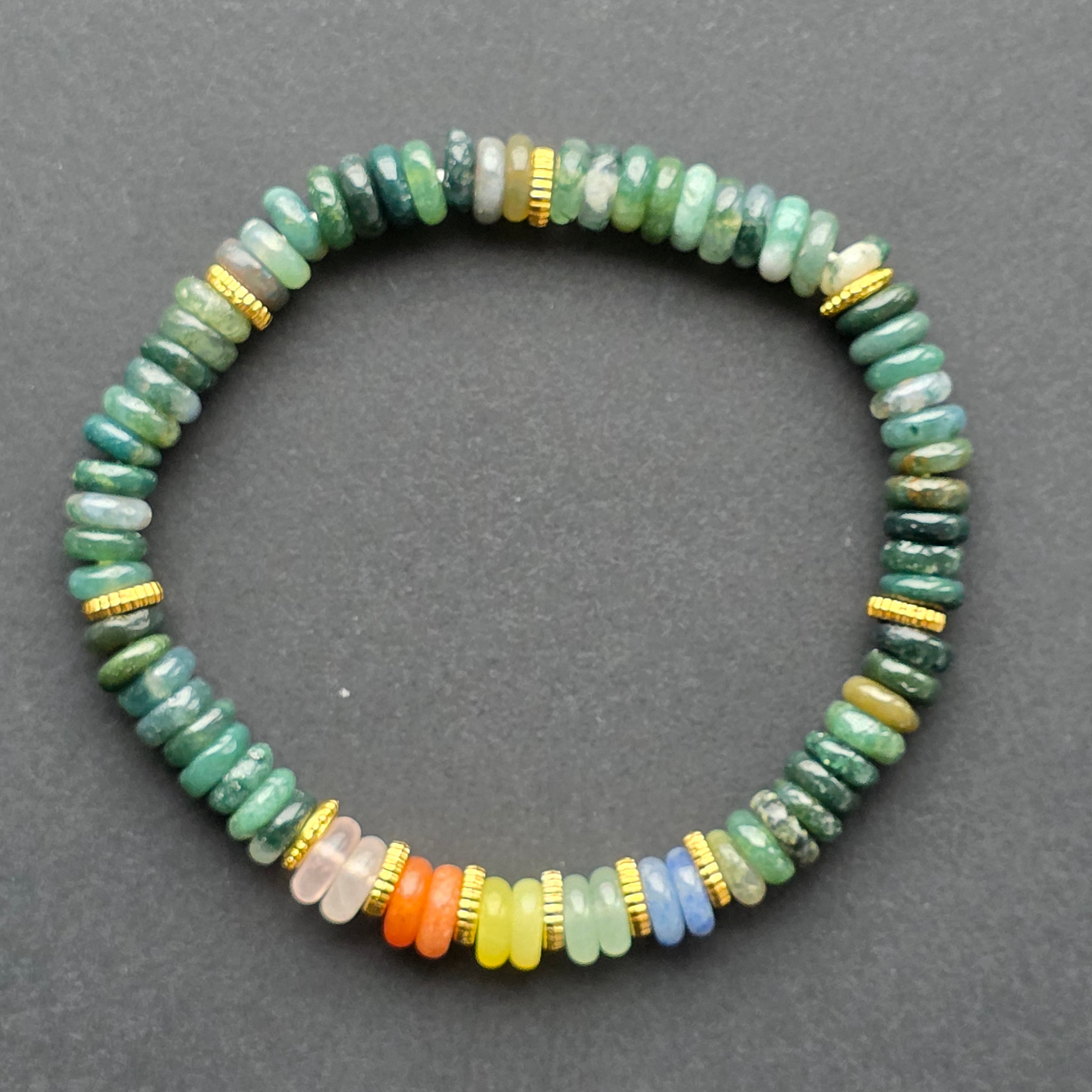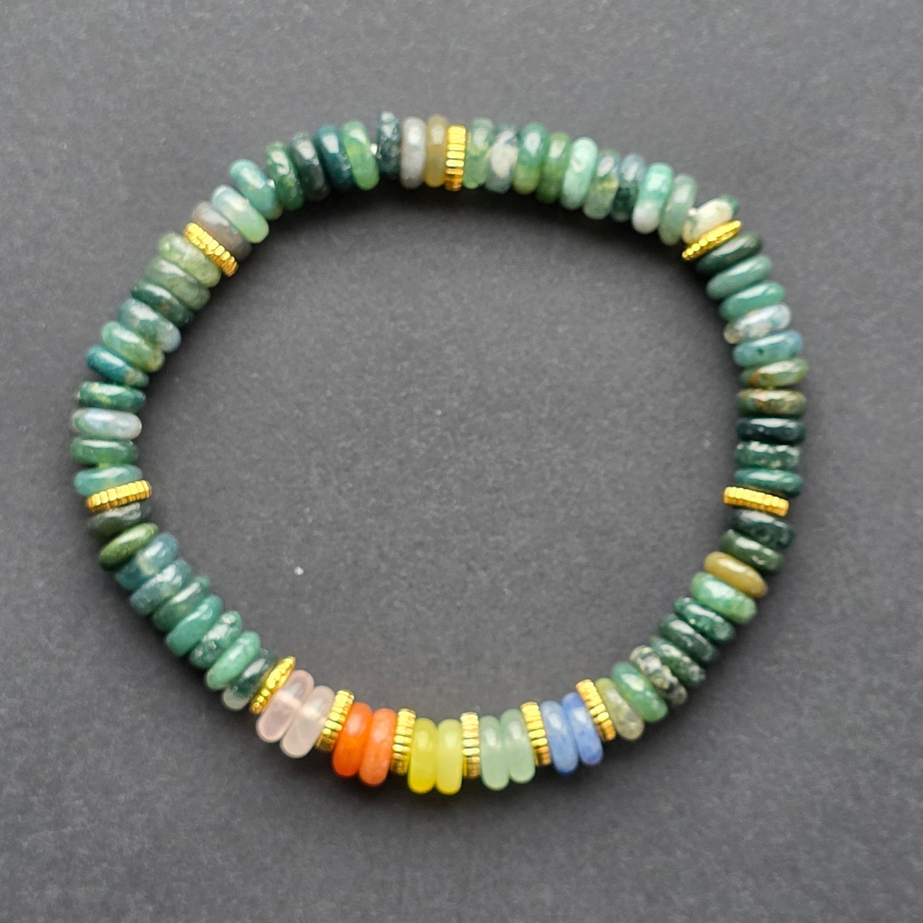 Мъховият ахат е един от най-органичните камъни в света на минералите - фина комбинация от наситено зелено, полупрозрачни текстури и фини инкрустации, напомнящи за нишки мъх, уловени в камъка. Всеки диск е прозорец към природата с вариации, които превръщат гривната в жив, автентичен и невъзможен за копиране предмет.