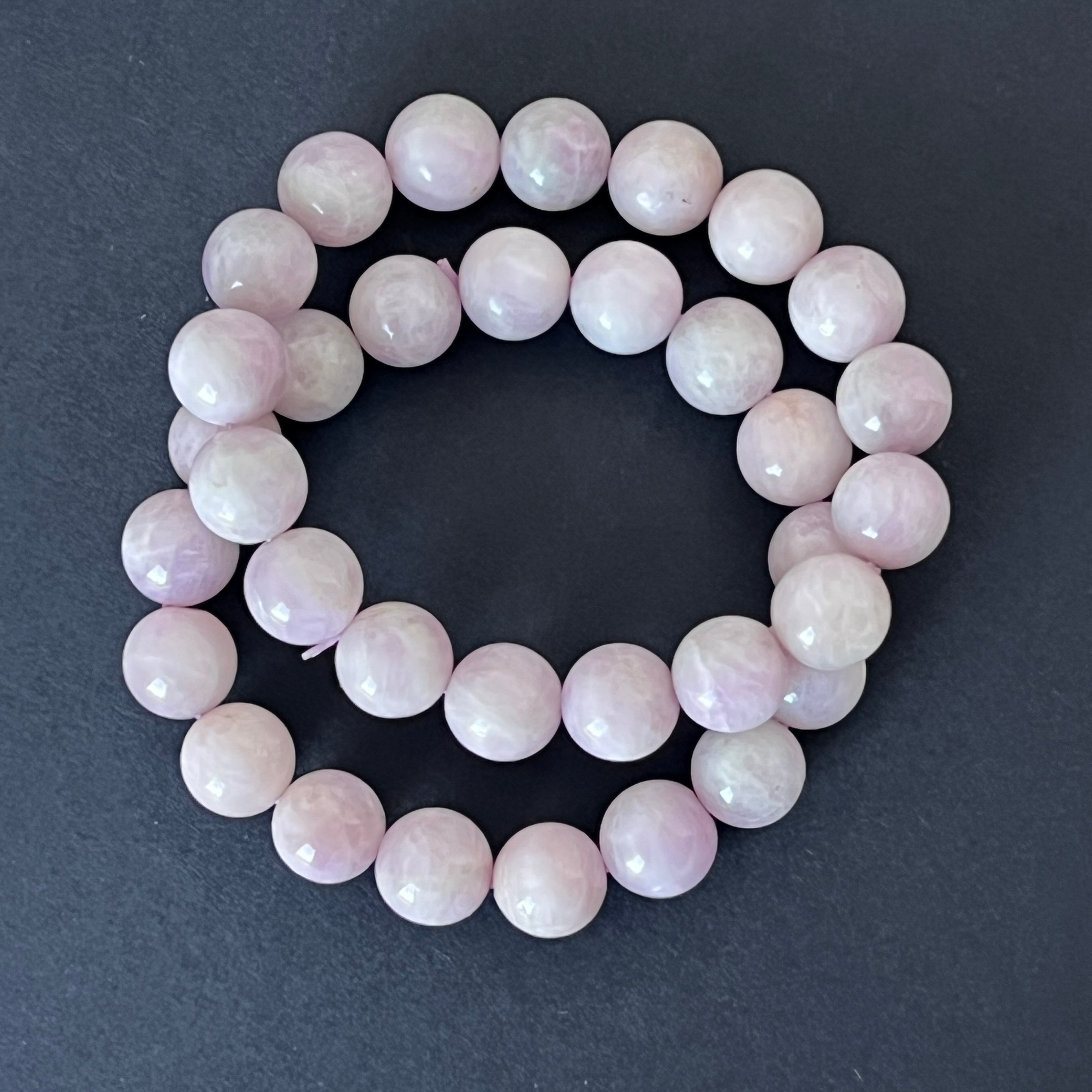 Тази гривна от кунцит, съставена от сферични мъниста с размер 12 мм, излъчва деликатна и изискана красота. Прозрачните й розови и люлякови оттенъци внасят нежен нюанс на елегантност, превръщайки всяка гривна в уникален и женствен аксесоар.